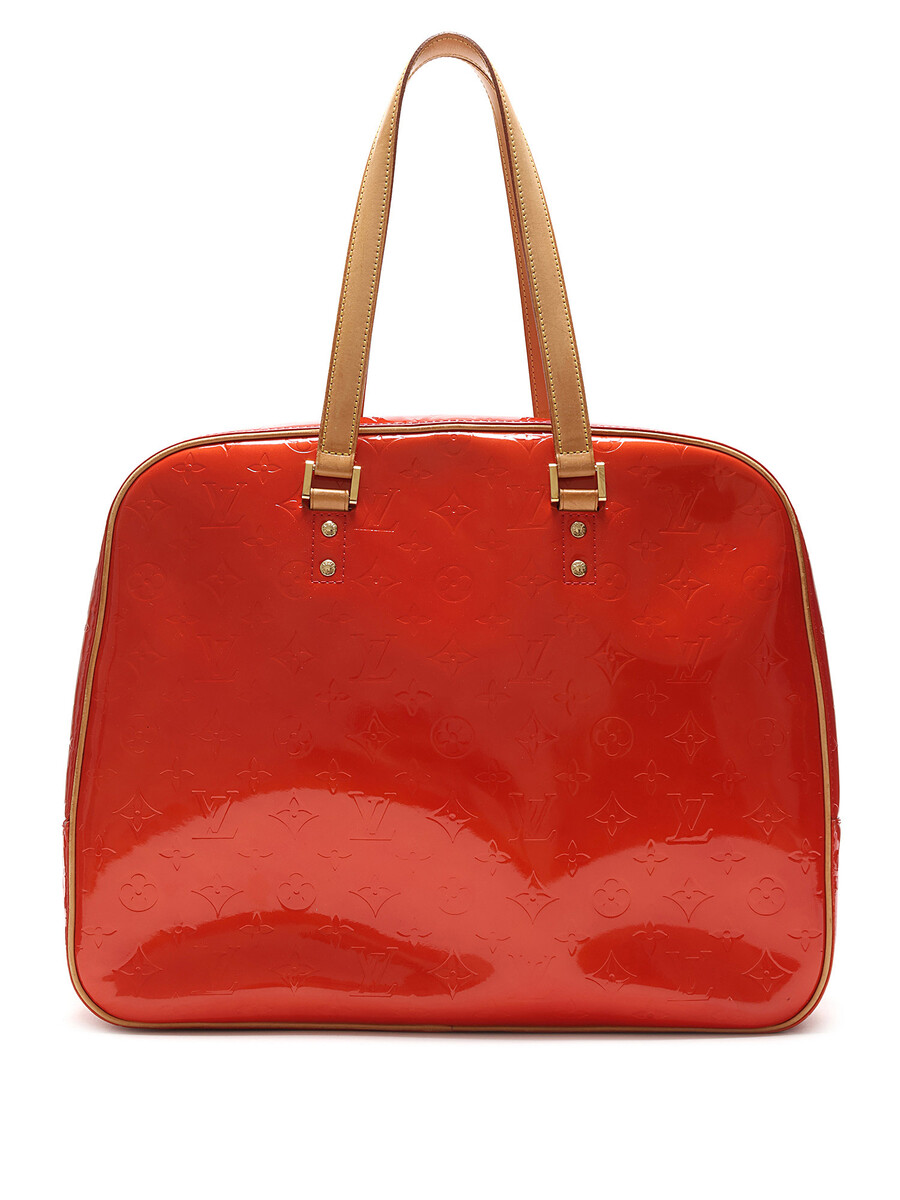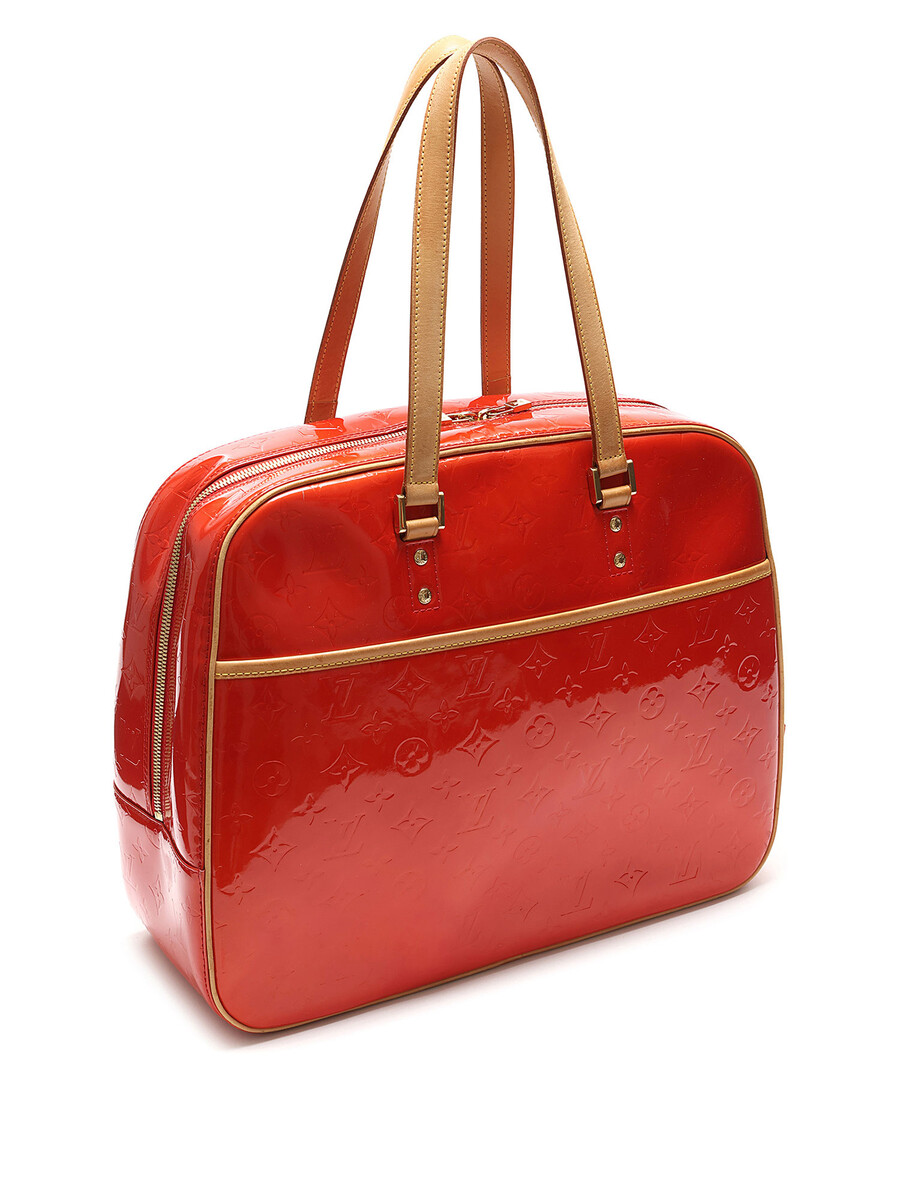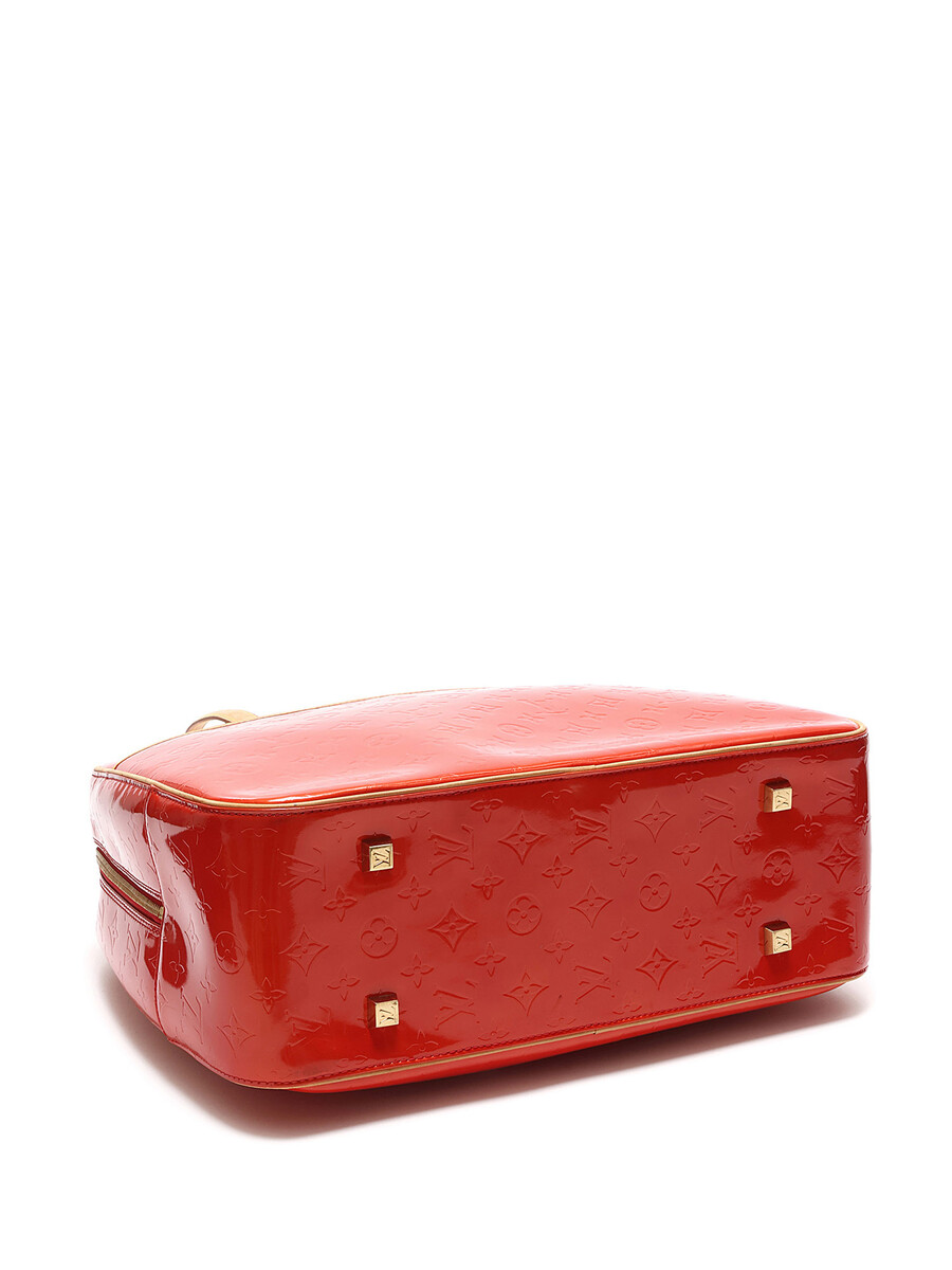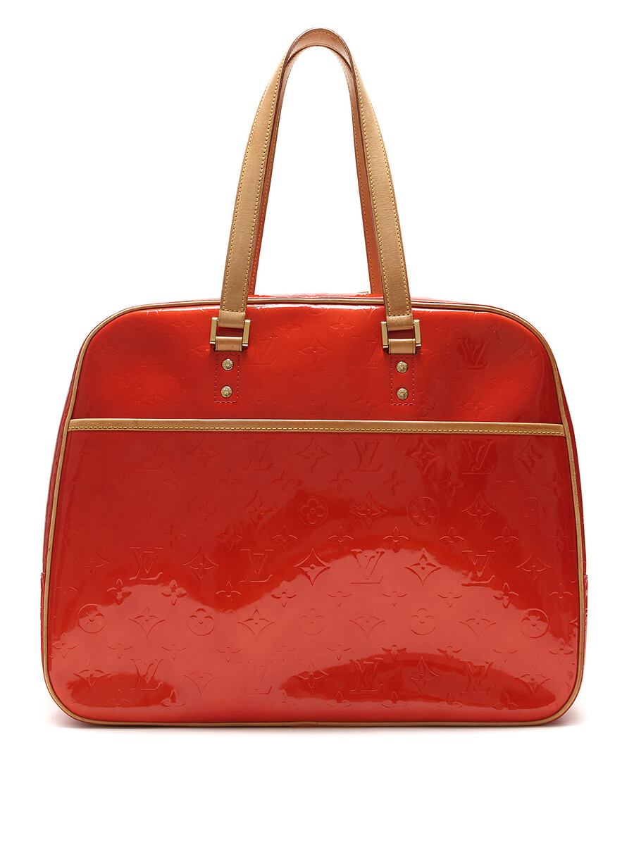 Sac fourreau Houston avec motif monogramme en cuir Vernis rouge. Fermeture à glissière. Bandoulières en cuir ajustables. Quincaillerie dorée.