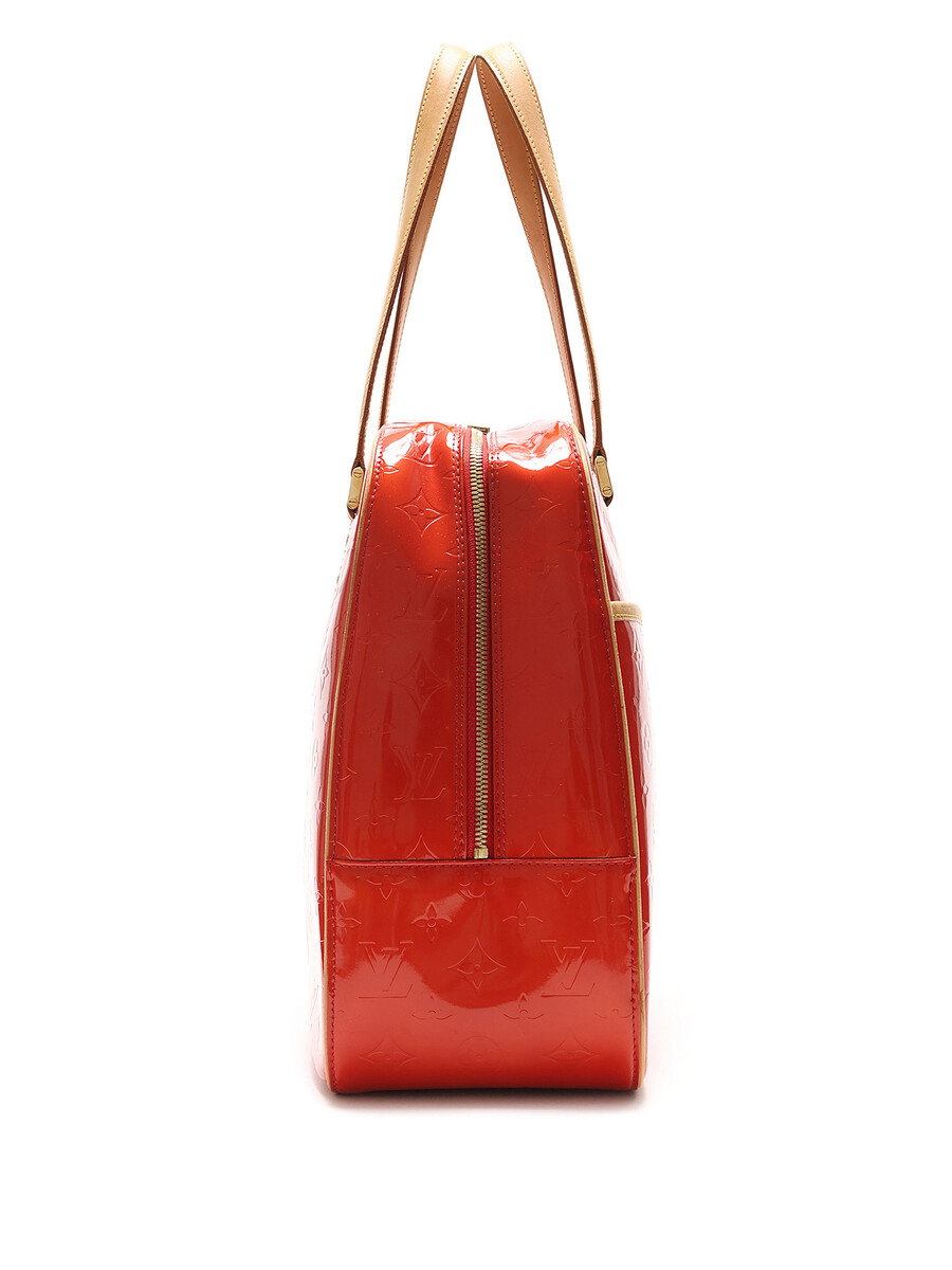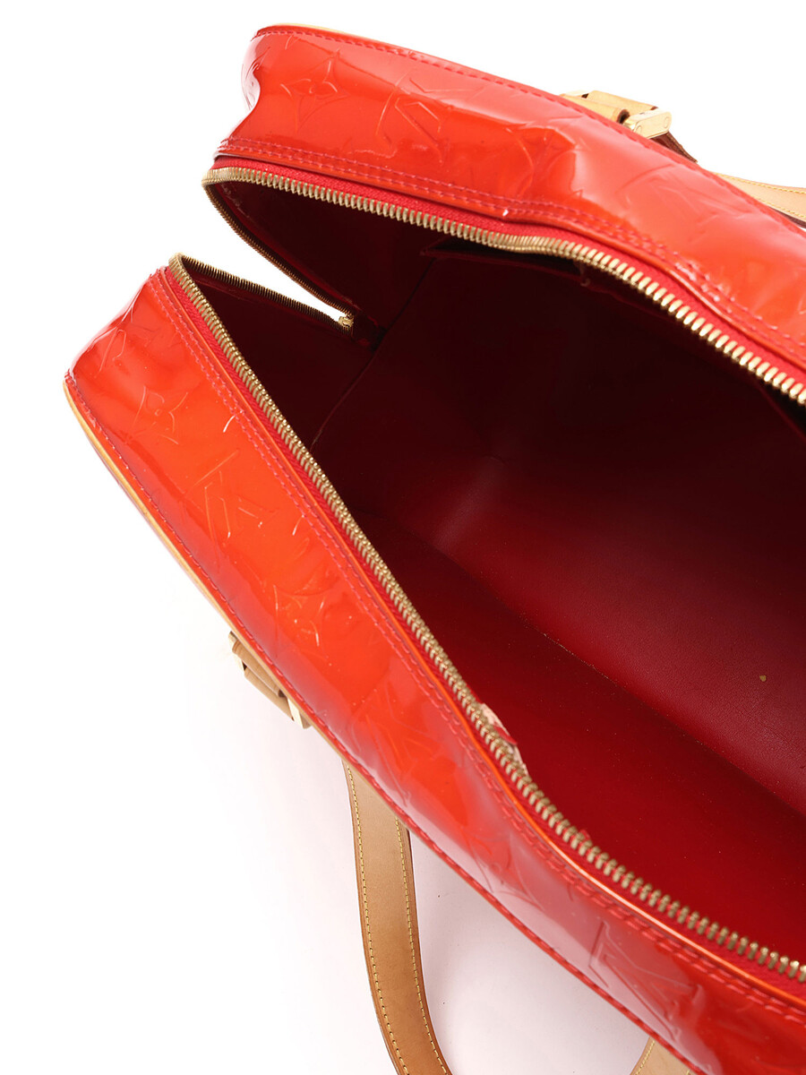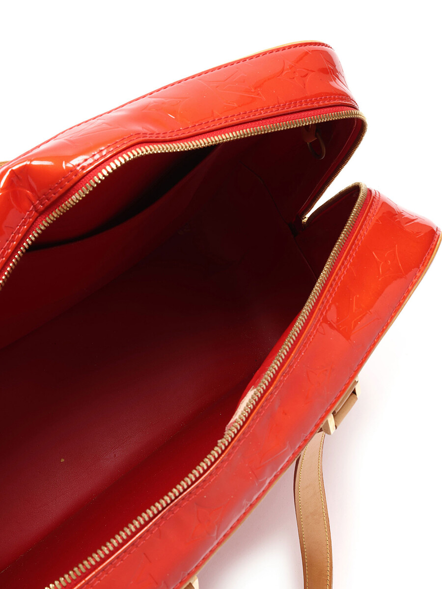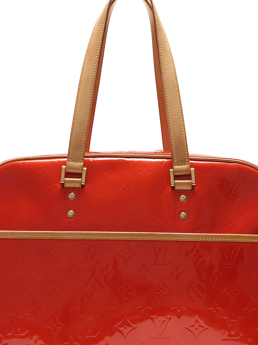 Sac fourreau Houston avec motif monogramme en cuir Vernis rouge. Fermeture à glissière. Bandoulières en cuir ajustables. Quincaillerie dorée.