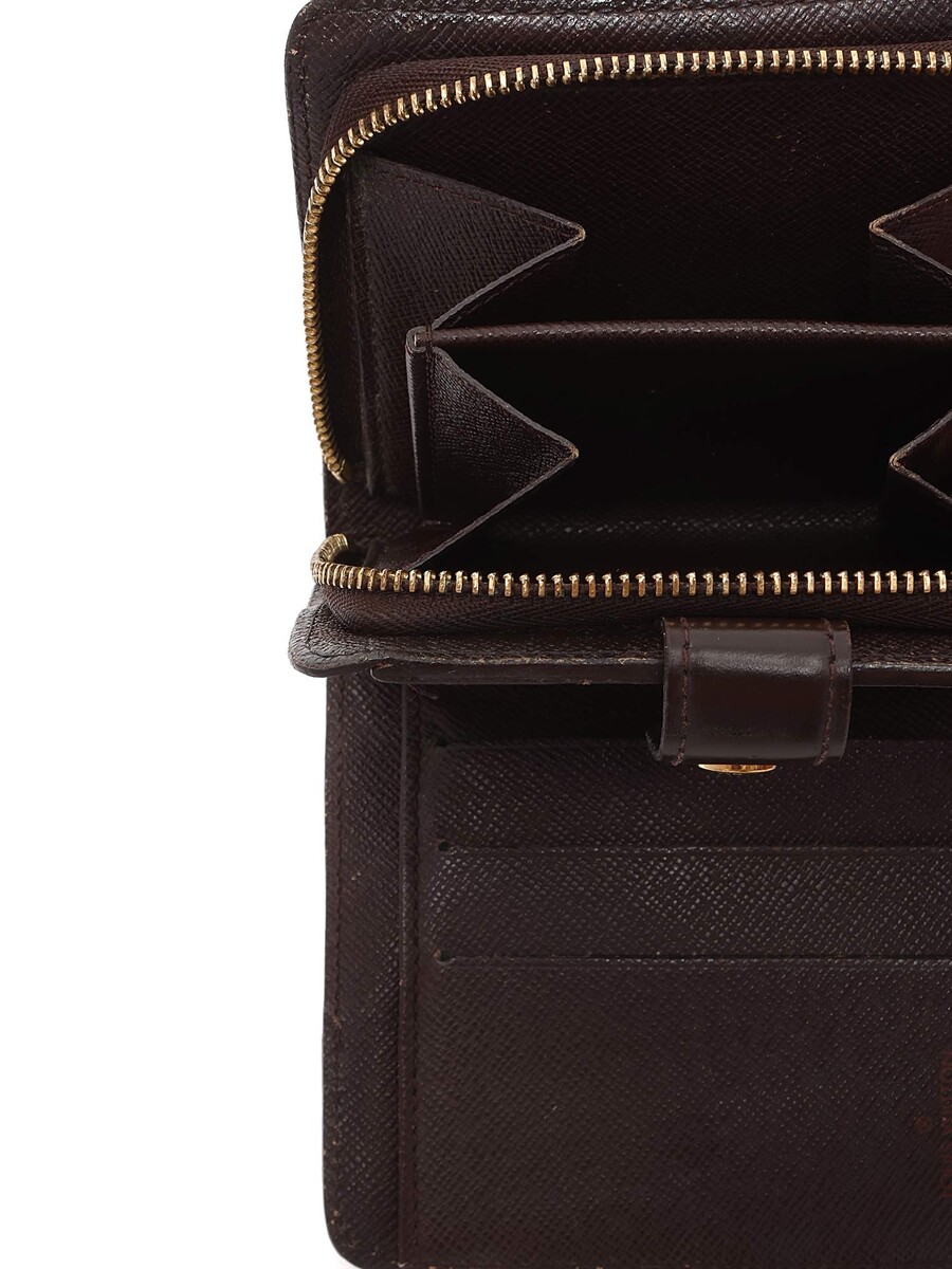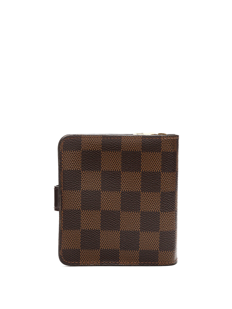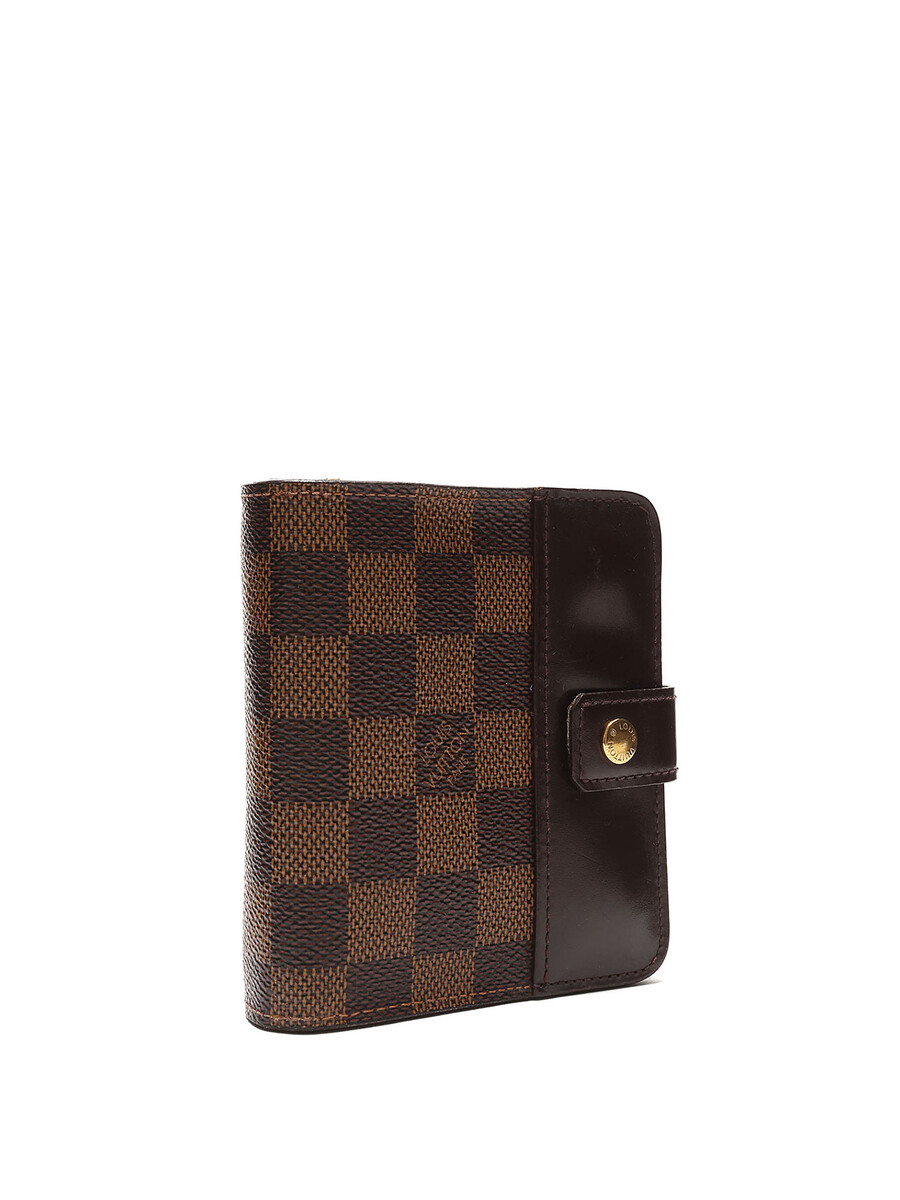 Portefeuille en toile enduite Damier Ebene et cuir, avec signature. Fermeture à bouton-pression et fermeture à glissière. Quincaillerie dorée.