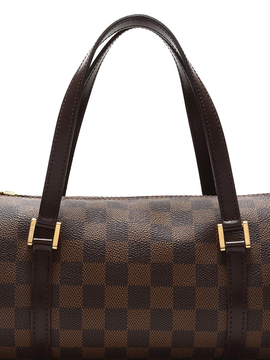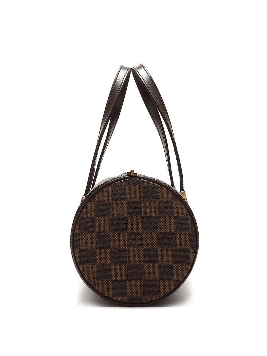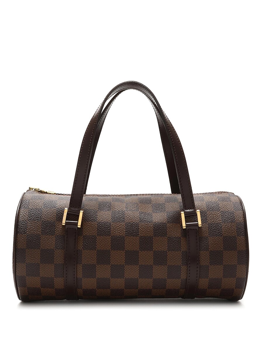 Sac à main cylindrique au motif classique Damier Ebene. Fermeture à glissière sur le dessus. Quincaillerie dorée. Toile enduite, finitions en cuir.