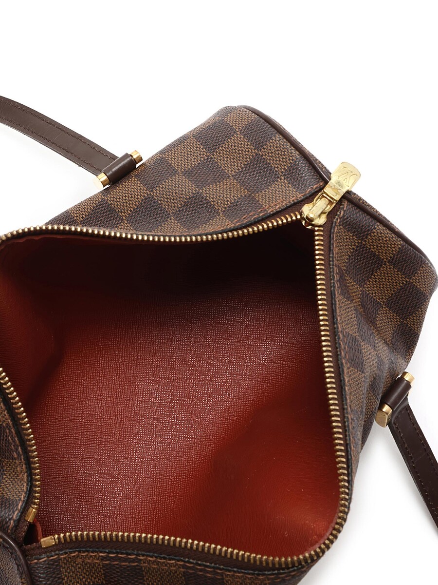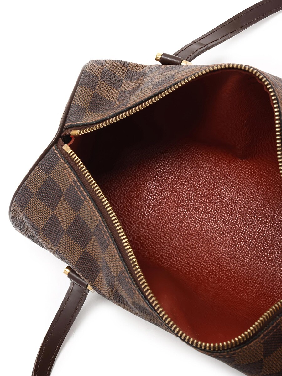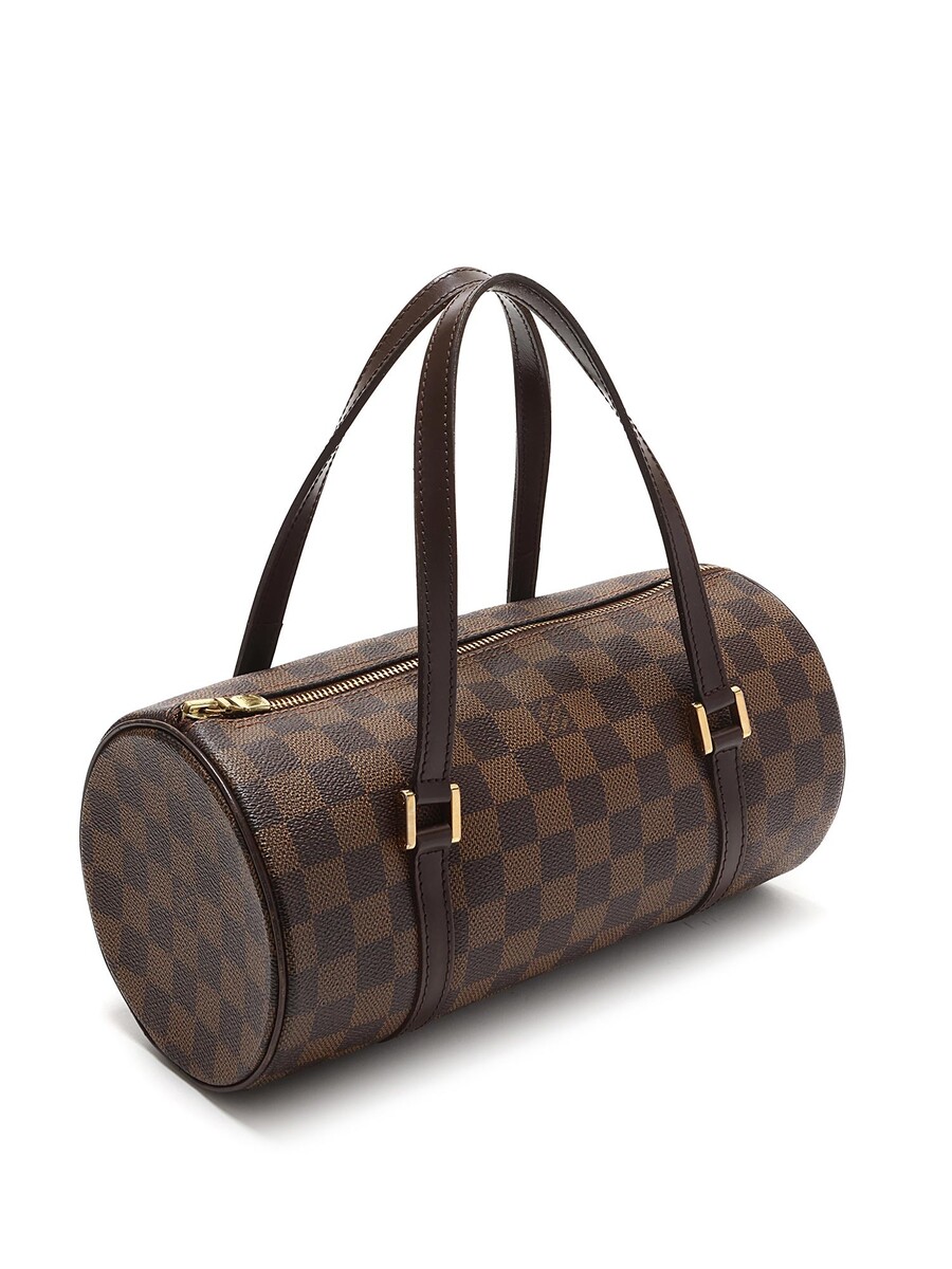 Sac à main cylindrique au motif classique Damier Ebene. Fermeture à glissière sur le dessus. Quincaillerie dorée. Toile enduite, finitions en cuir.