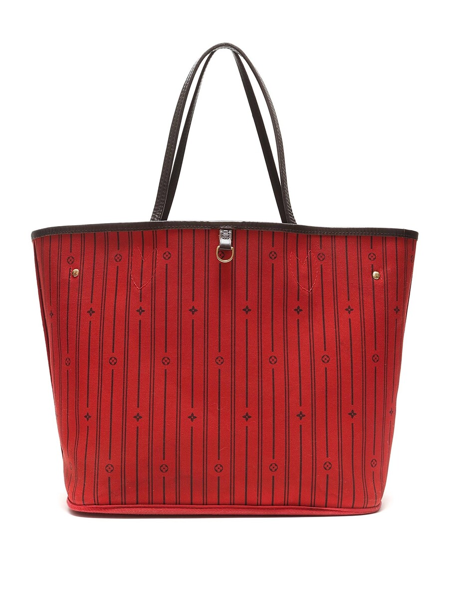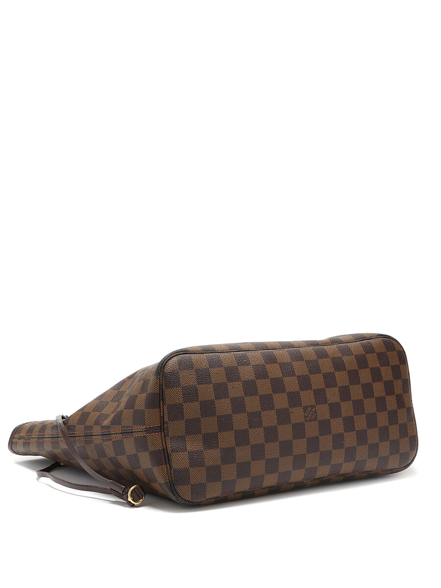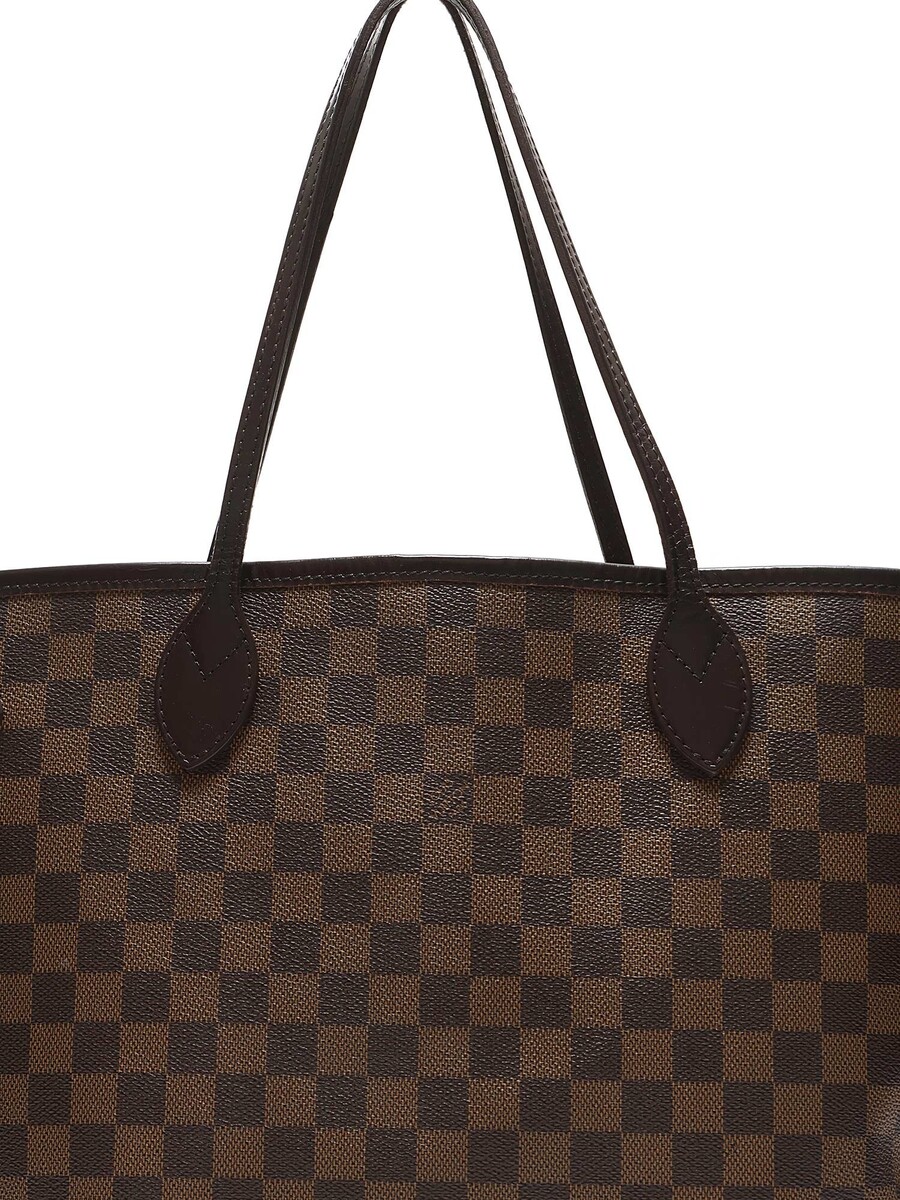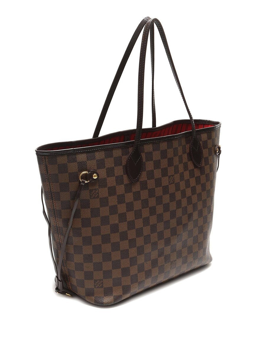 Sac cabas en toile Damier Ebene marron. Dessus ouvert avec fermeture à crochet. Poignées en cuir. Doublure en tissu rayé rouge. Accessoires en ton doré.