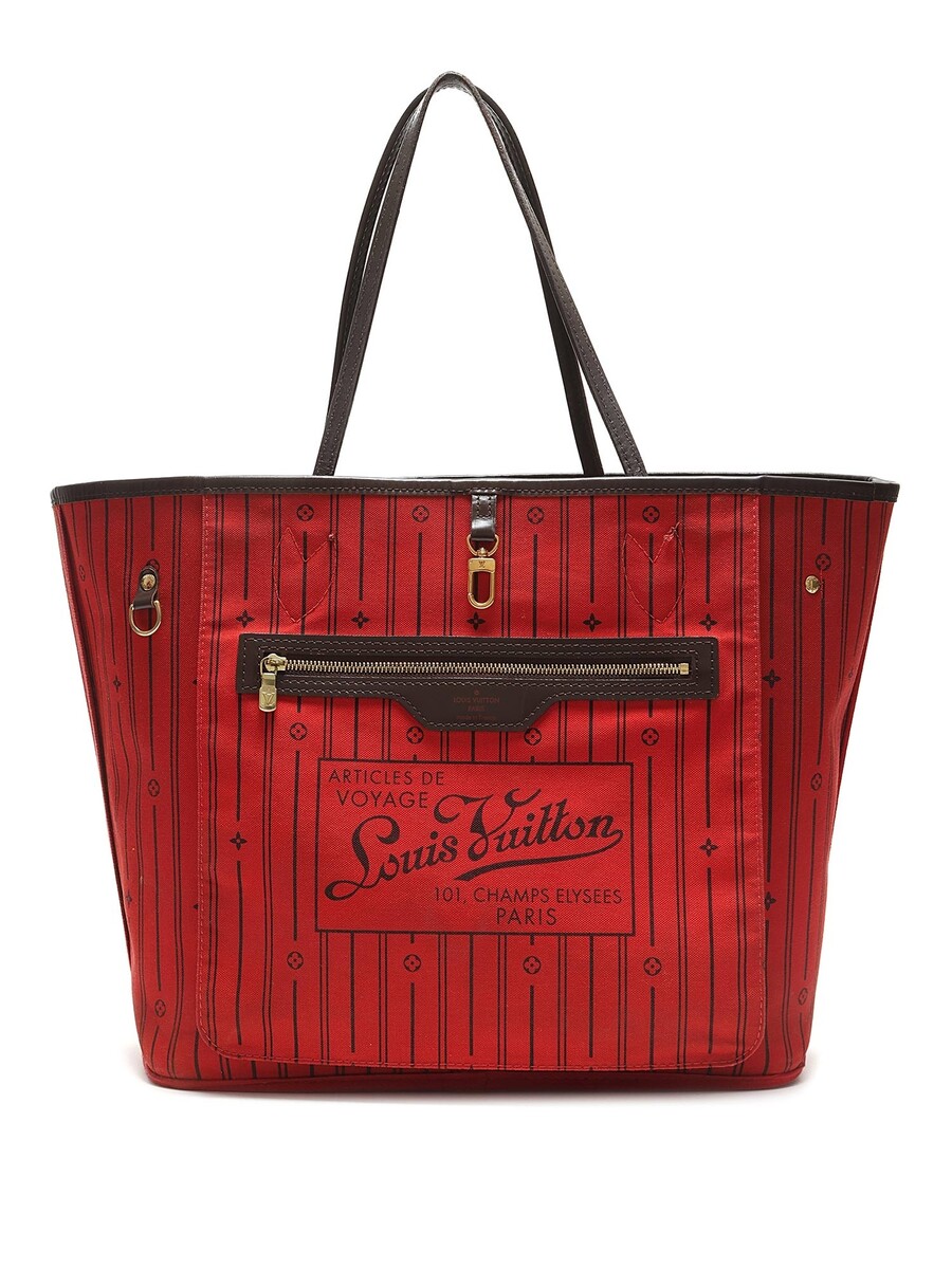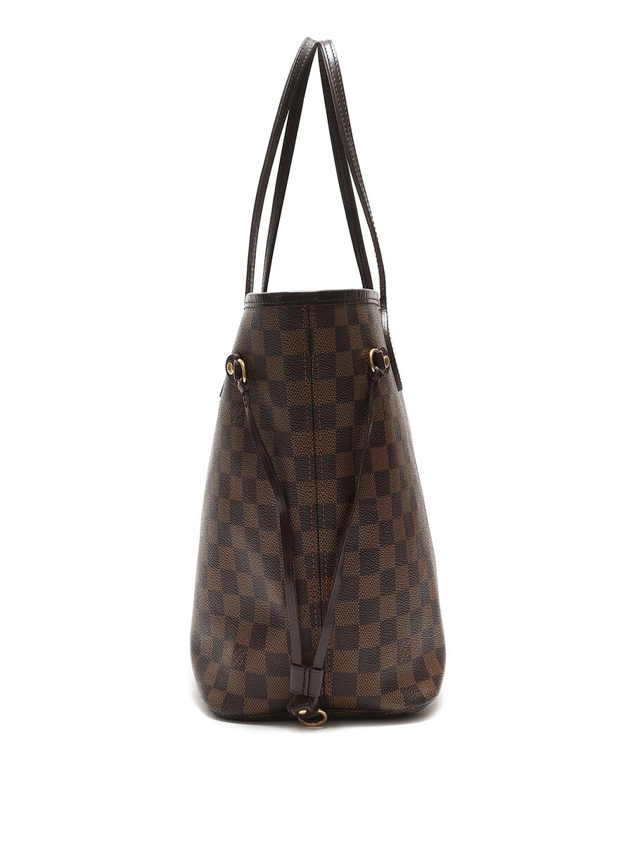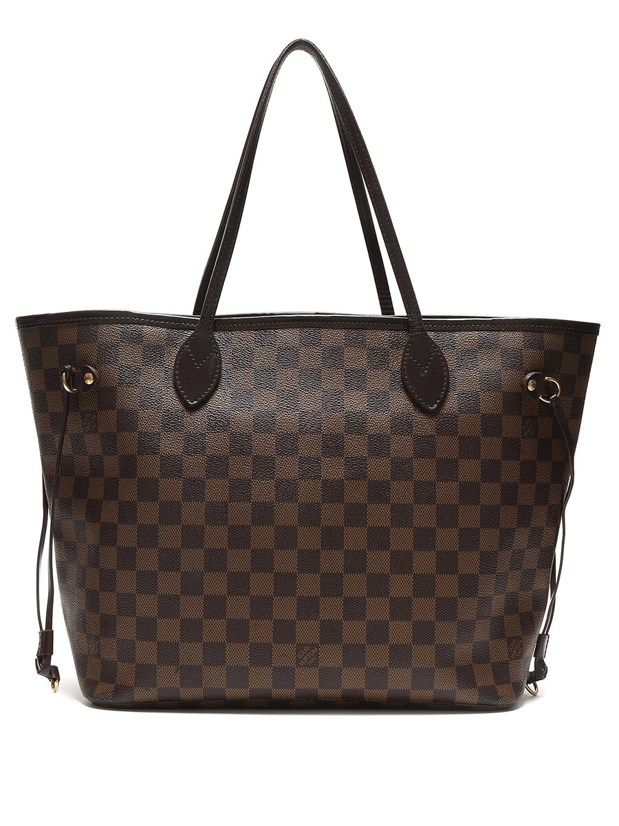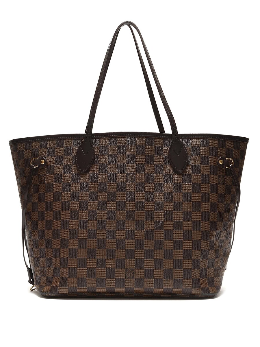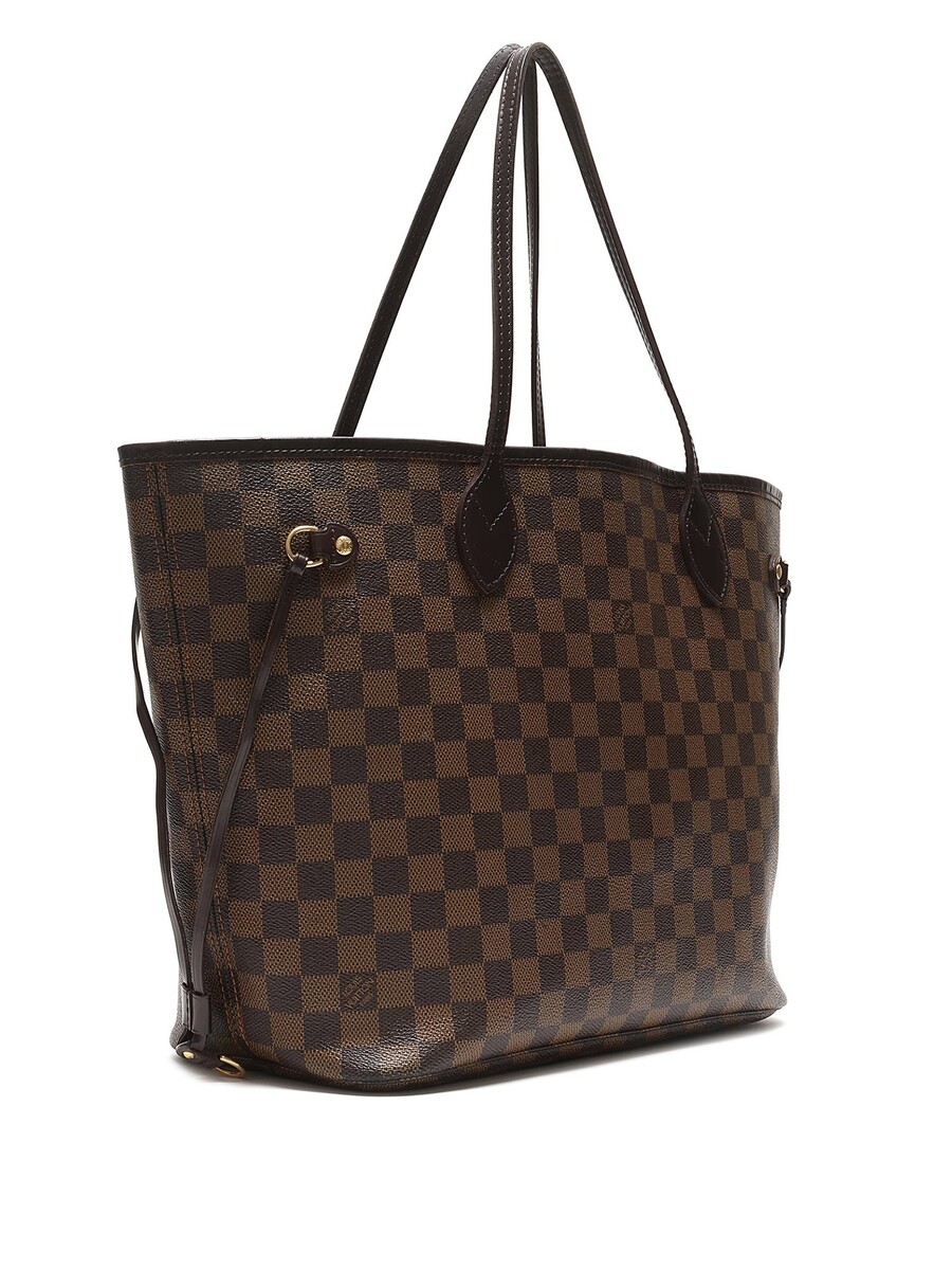 Sac cabas en toile Damier Ebene marron. Dessus ouvert avec fermeture à crochet. Poignées en cuir. Doublure en tissu rayé rouge. Accessoires en ton doré.