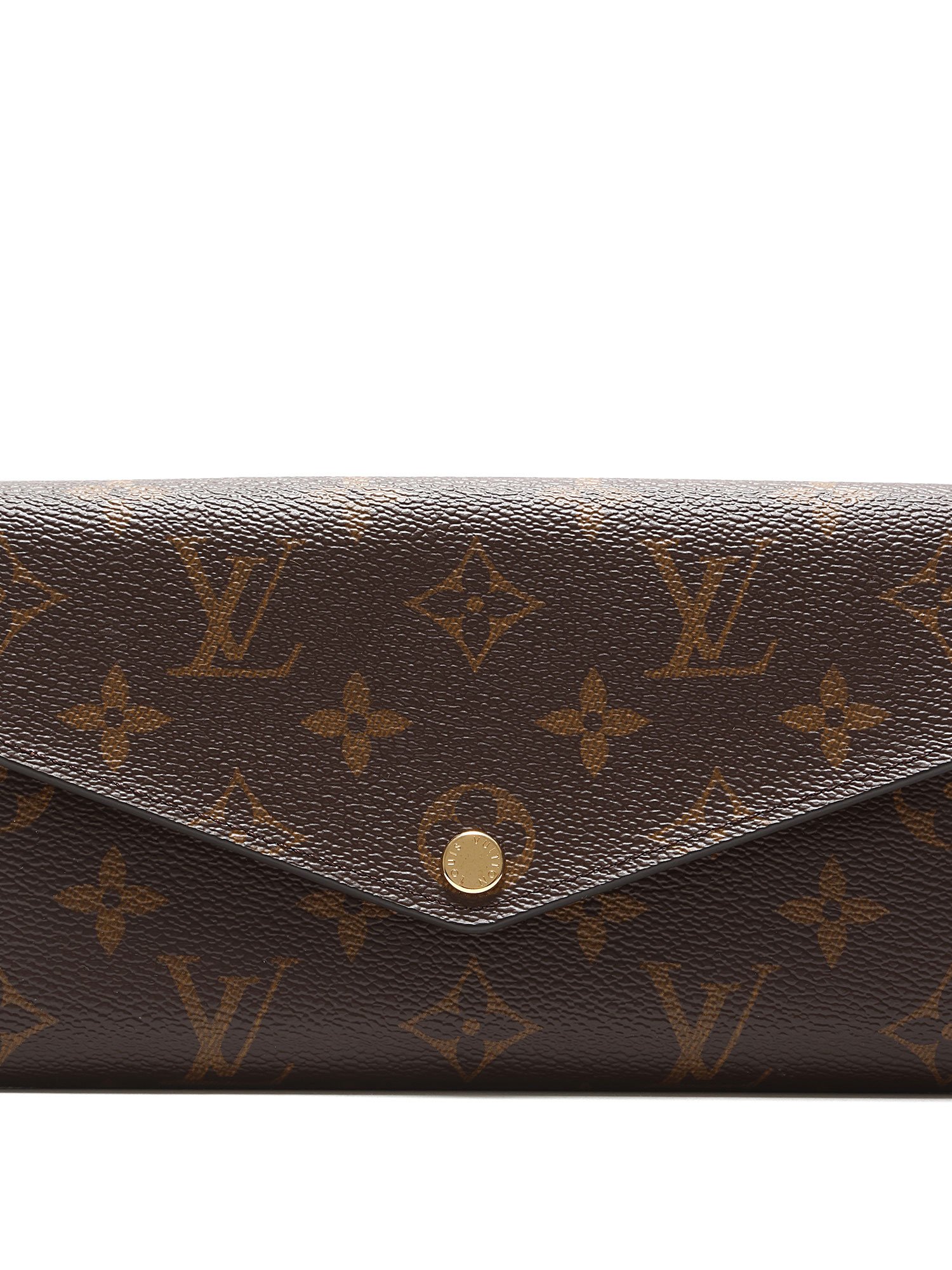 Portefeuille continental en toile enduite et monogramme iconique Louis Vuitton en tons de brun et beige. Fermeture à bouton pression. Ferrures en métal doré. Intérieur avec plusieurs fentes pour cartes, poche à monnaie zippée, et compartiments pour billets.