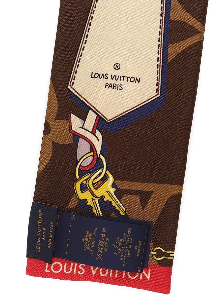 Bandeau en soie avec imprimé monogramme et sacs iconiques Louis Vuitton dans les tons de brun, beige, or, bleu et accents rouges. Livré avec boîte et sac.