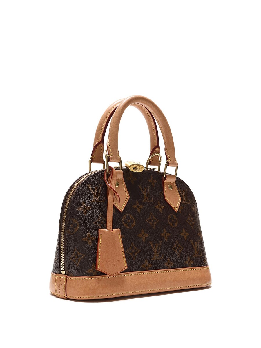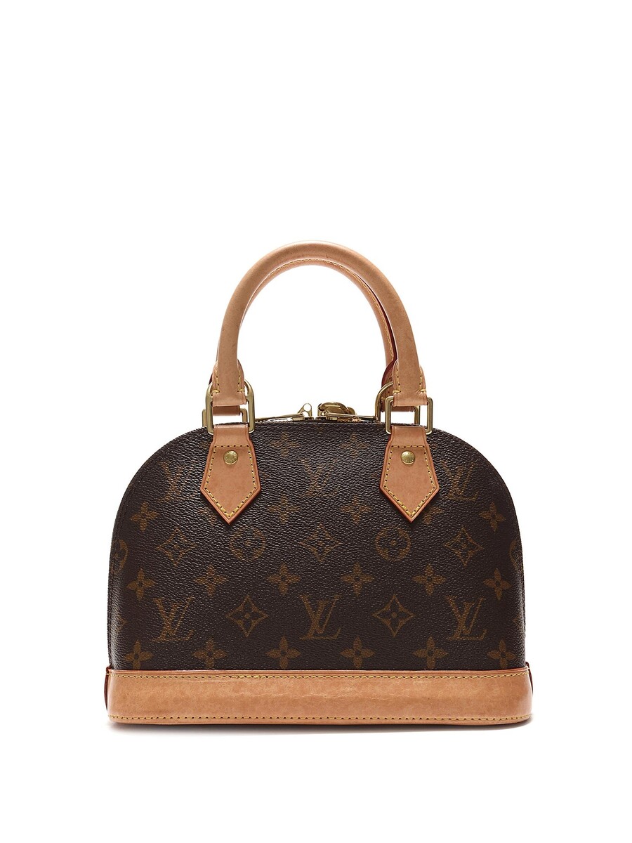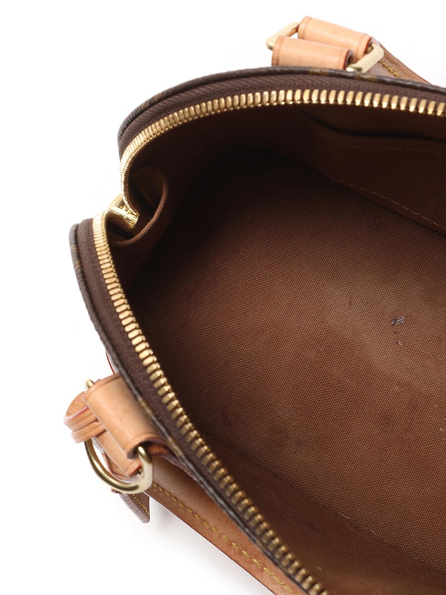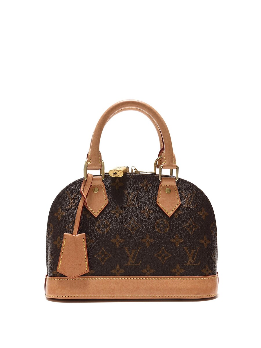 Sac en toile enduite monogramme avec garniture en cuir vachette marron. Ferrures dorées, fermeture à glissière avec cadenas et clé. Deux poignées roulées.
