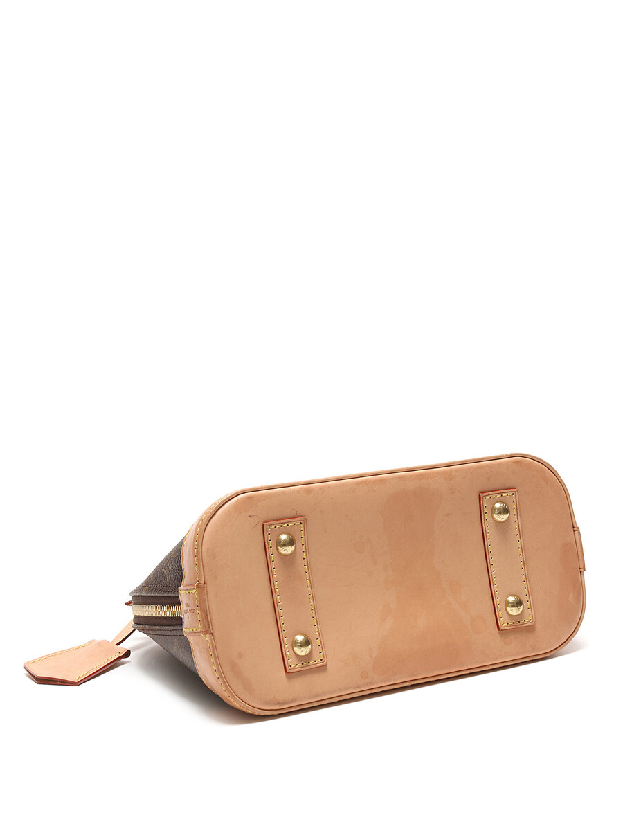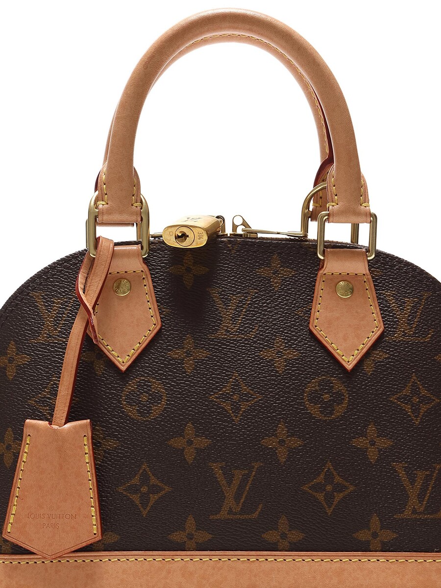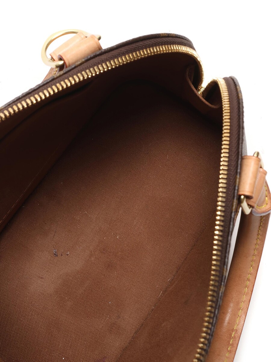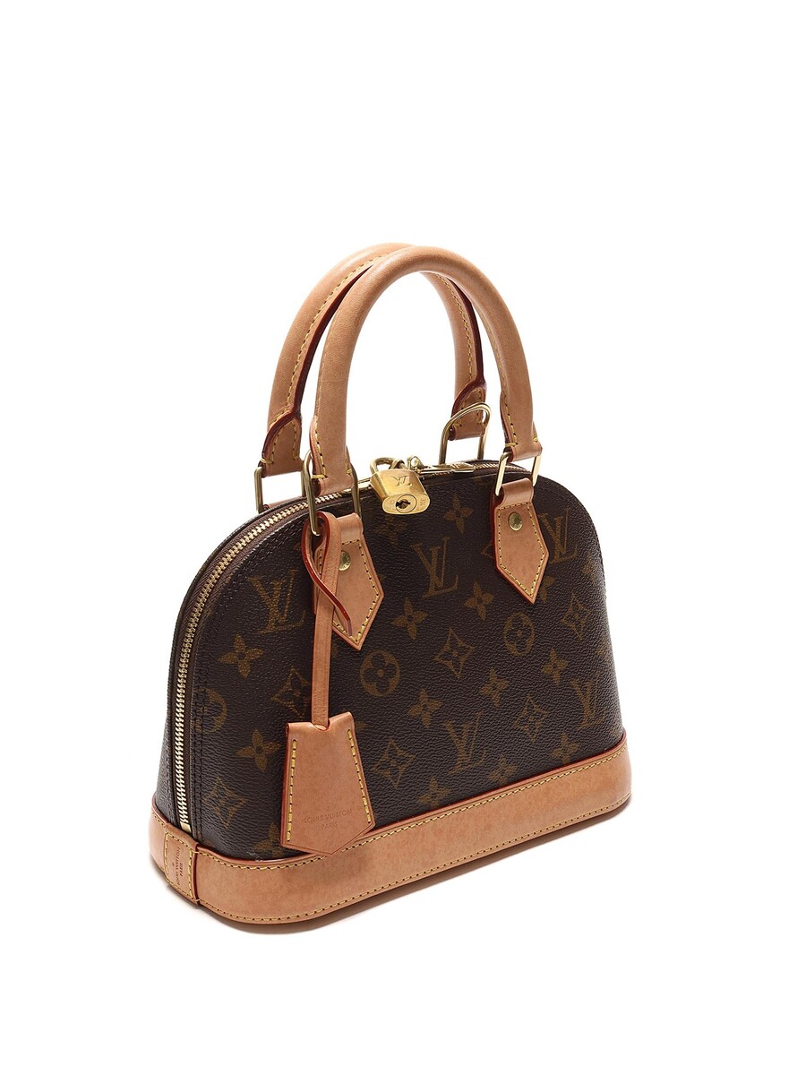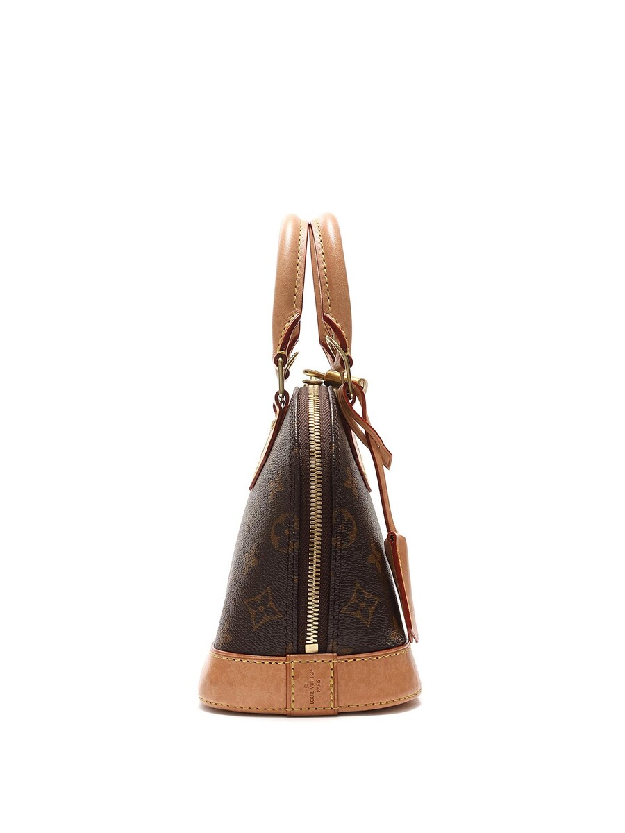 Sac en toile enduite monogramme avec garniture en cuir vachette marron. Ferrures dorées, fermeture à glissière avec cadenas et clé. Deux poignées roulées.