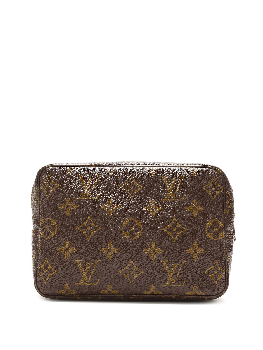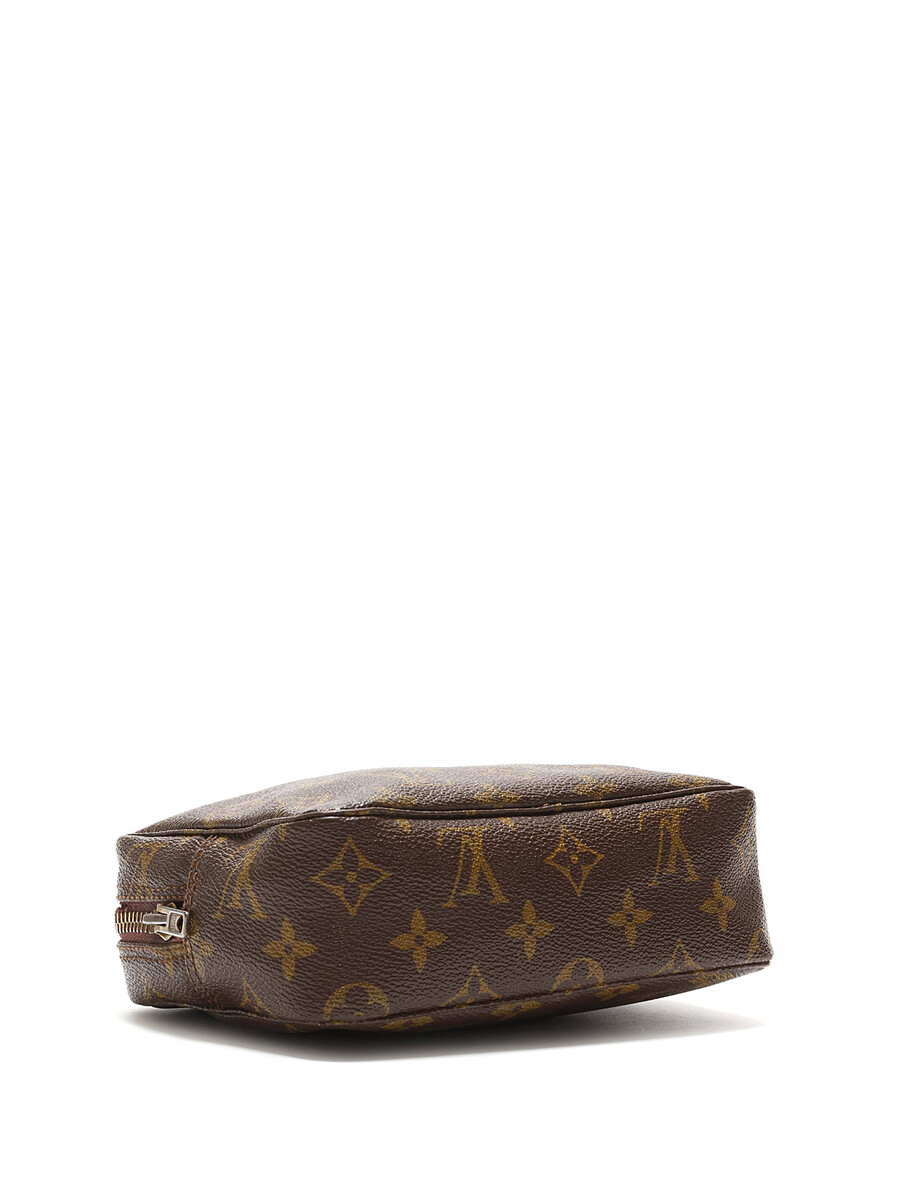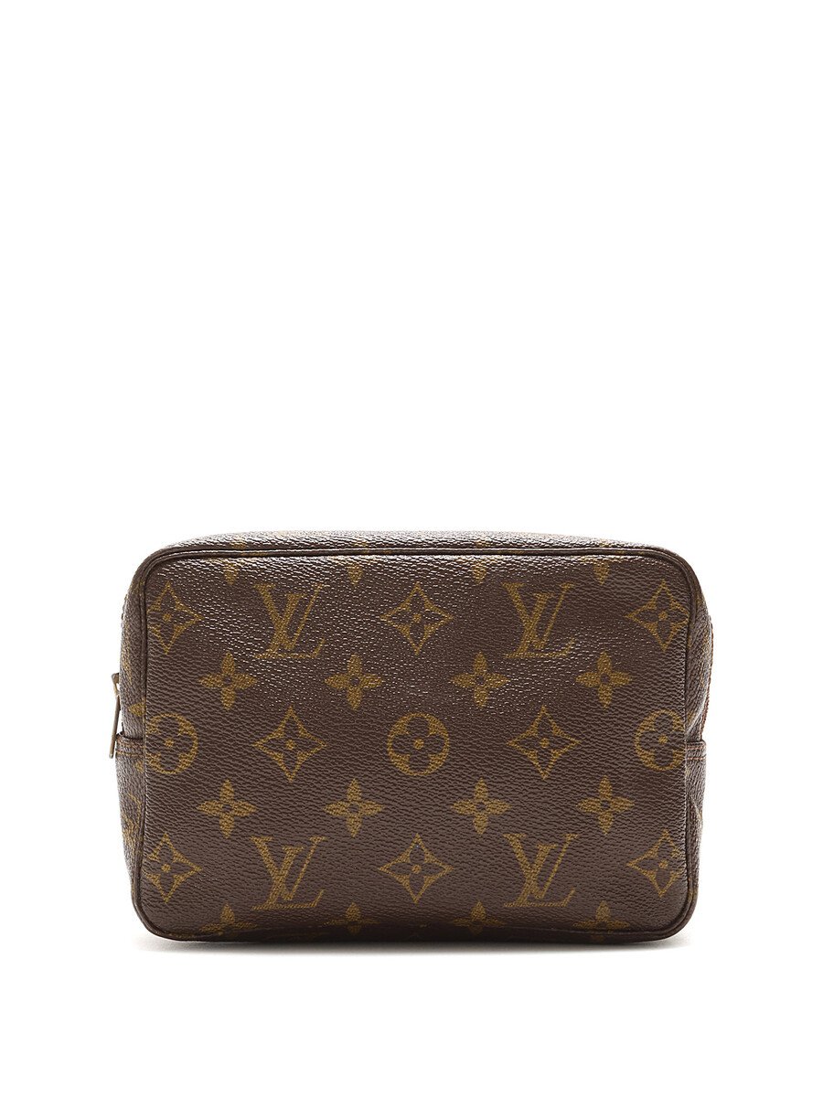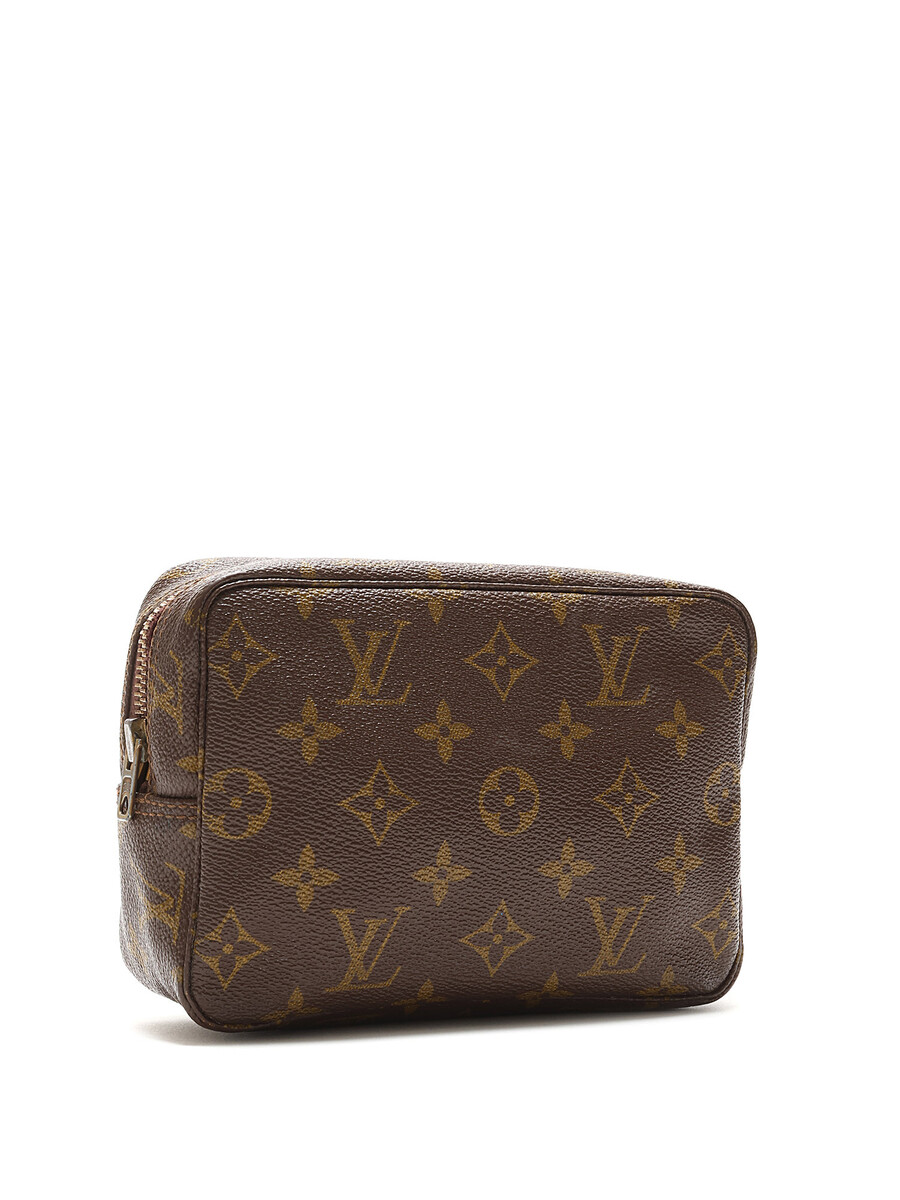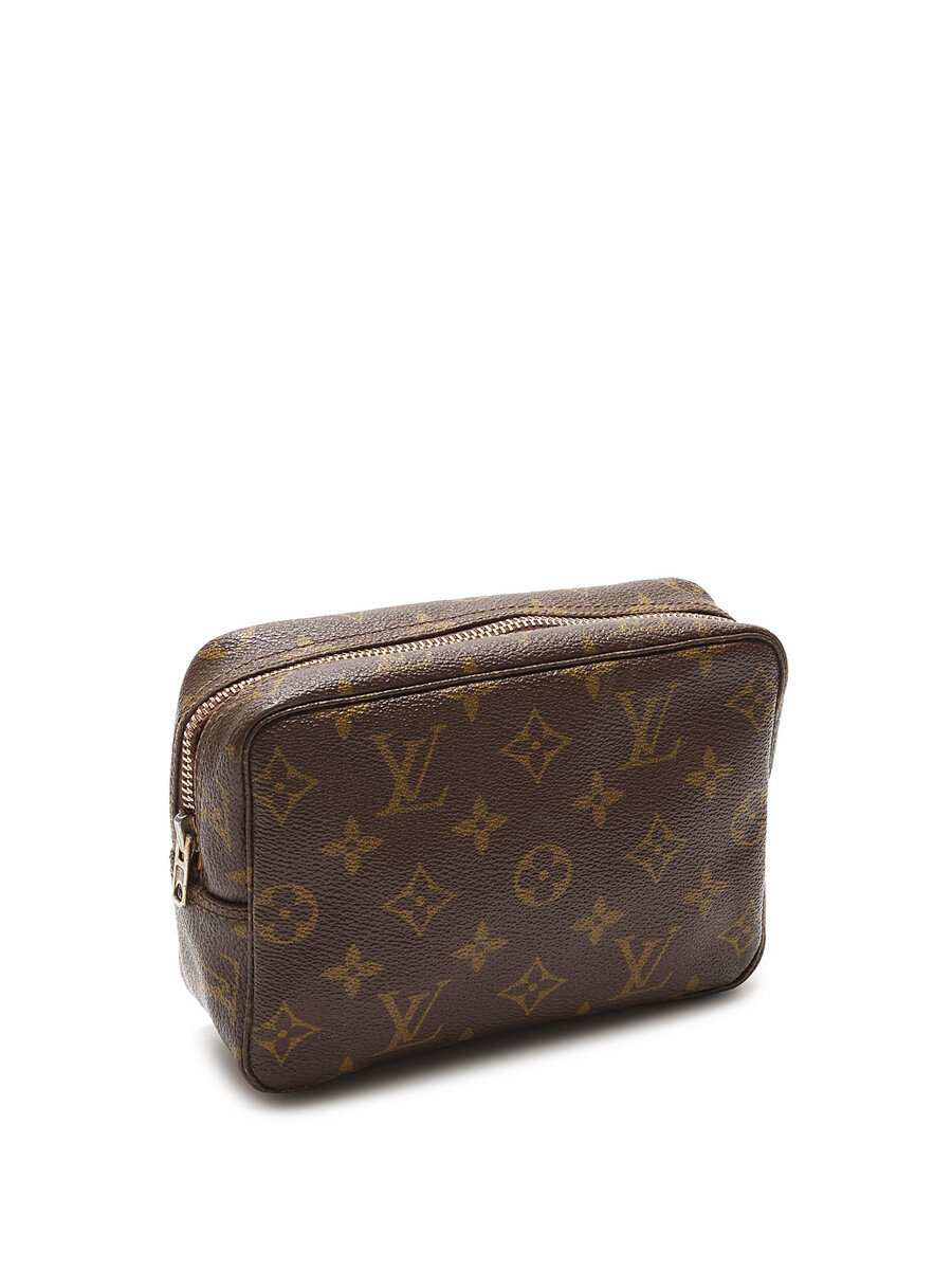 Trousse de toilette en toile enduite à motif monogramme dans les tons de brun. Fermeture à glissière.