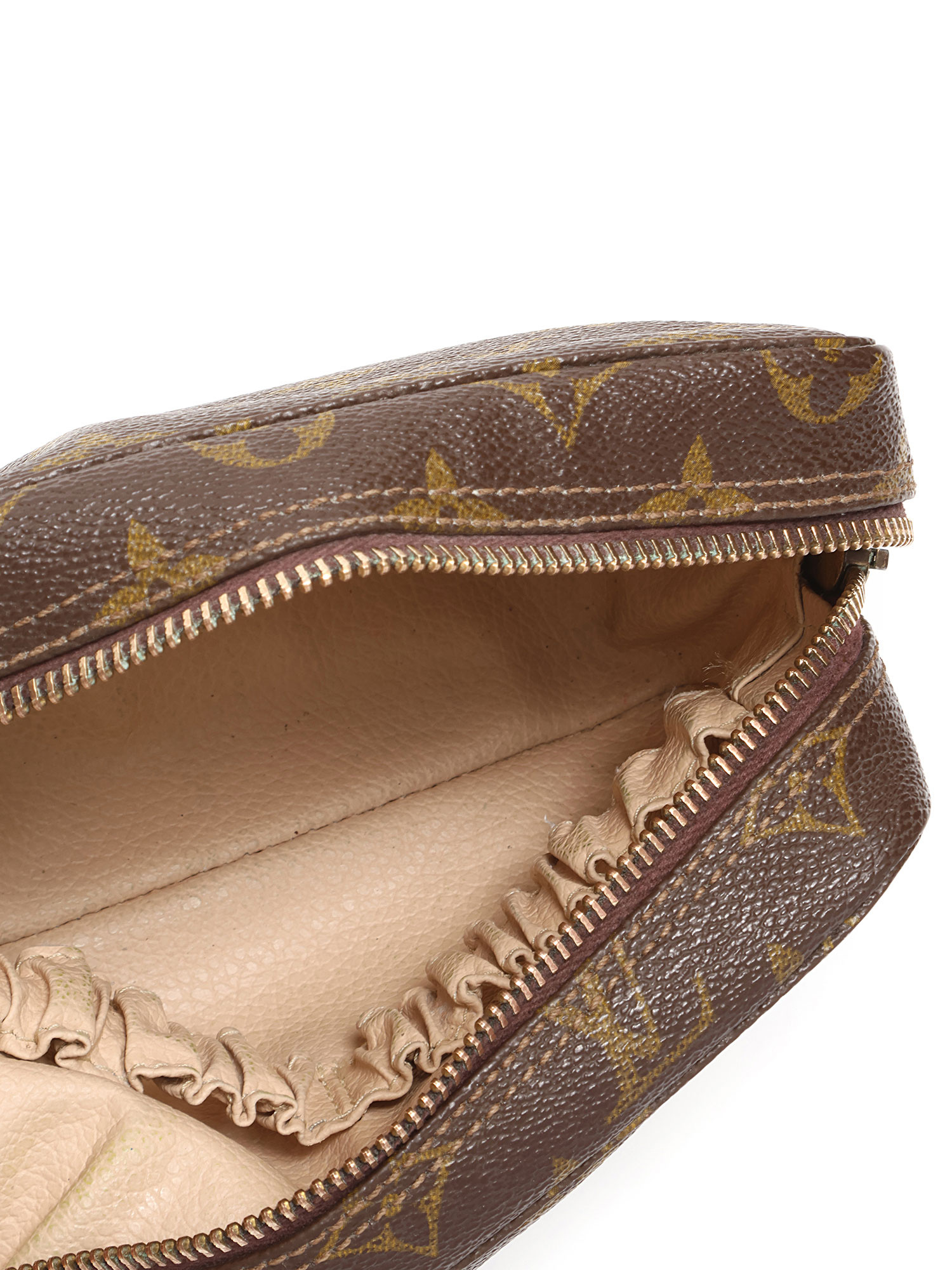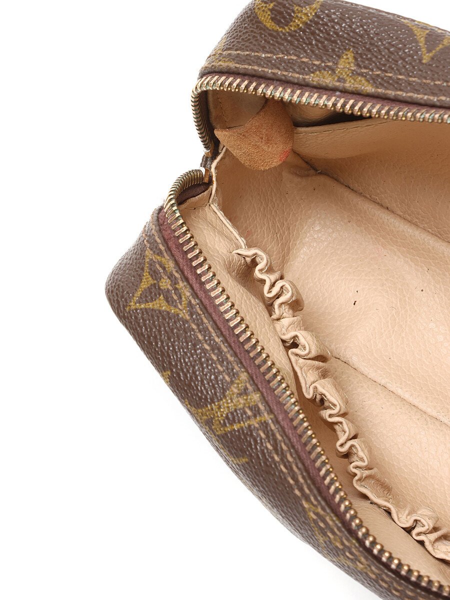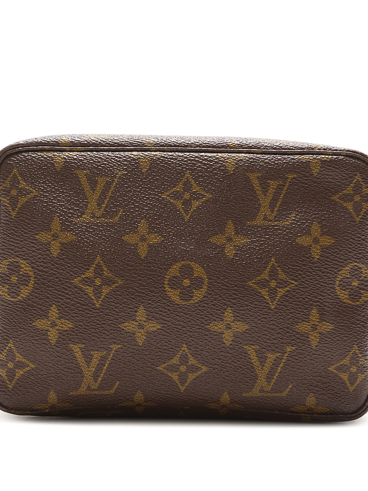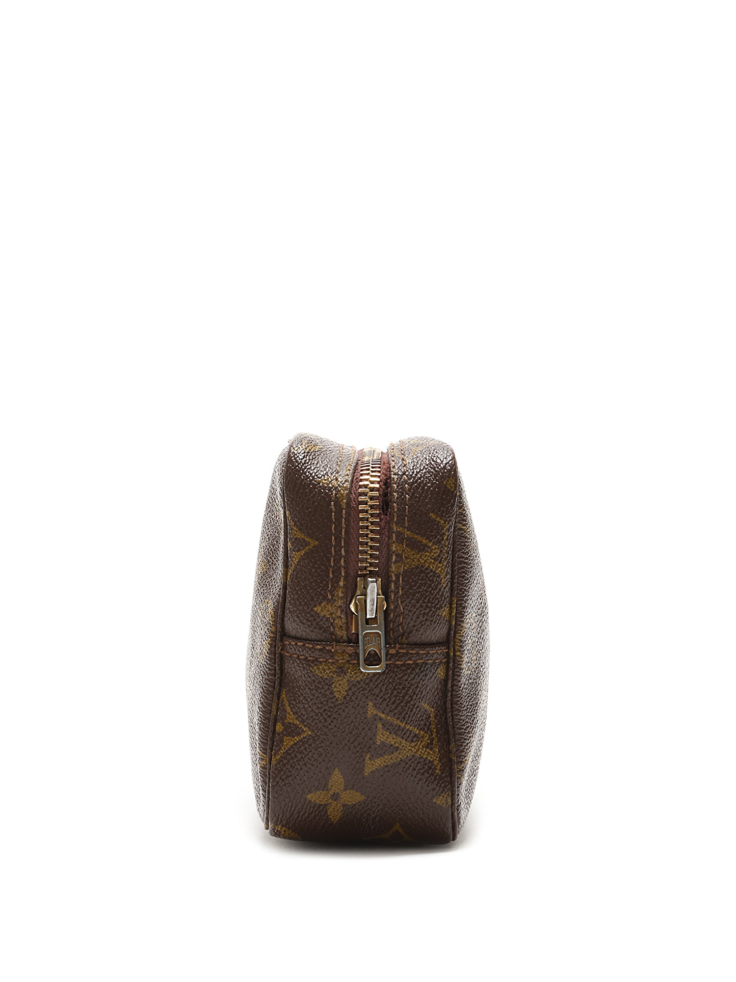 Trousse de toilette en toile enduite à motif monogramme dans les tons de brun. Fermeture à glissière.