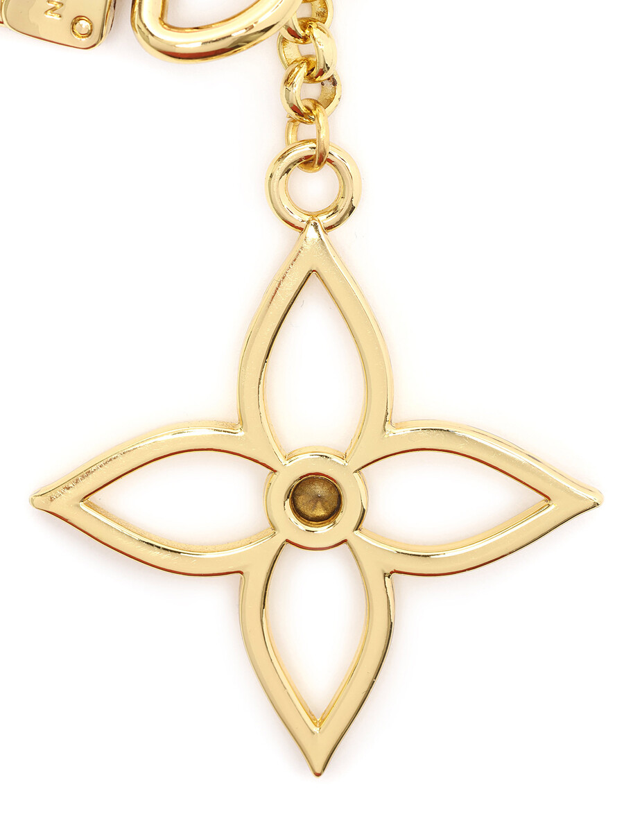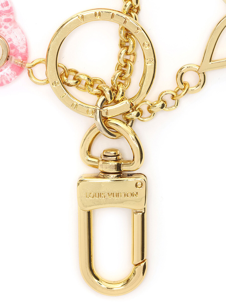 Porte-clés en métal doré avec des fleurs en émail monogrammées et un charm avec logo LV rose. Comprend un dust bag et une boîte.