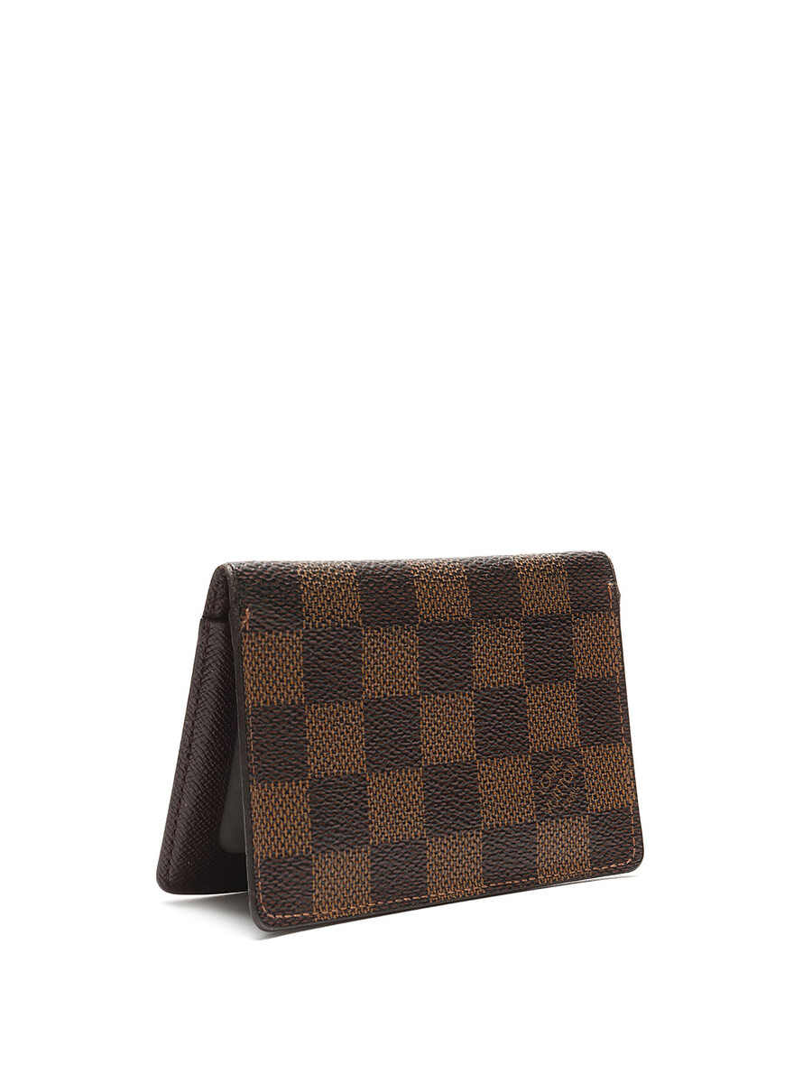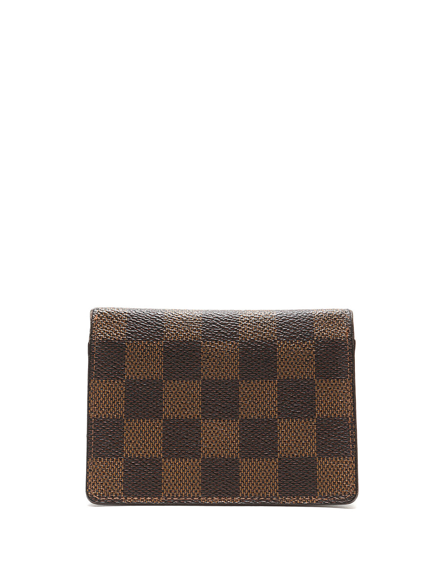 Porte-cartes en toile enduite arborant le motif Damier Ebene classique dans des tons marron et marron foncé. Coutures ton sur ton. Sac à poussière inclus.
