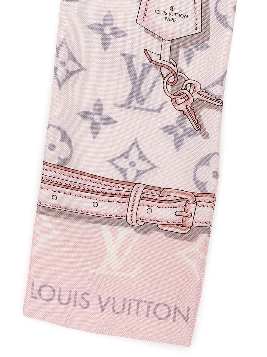 Twilly en soie avec motif de monogramme et de ceinture dans des tons de rose. Foulard fin et polyvalent, conçu pour être noué autour du cou, du poignet ou d’un sac.