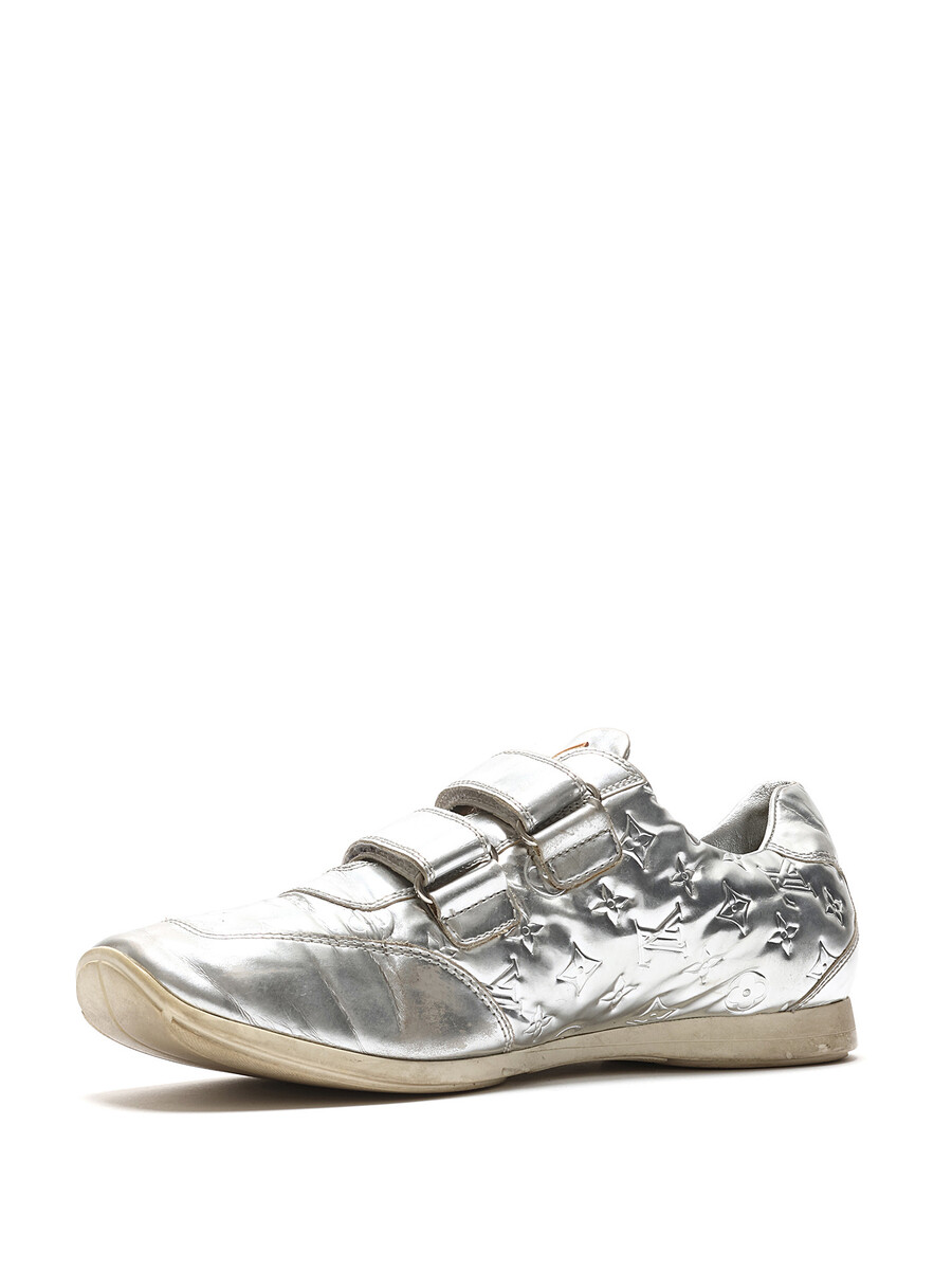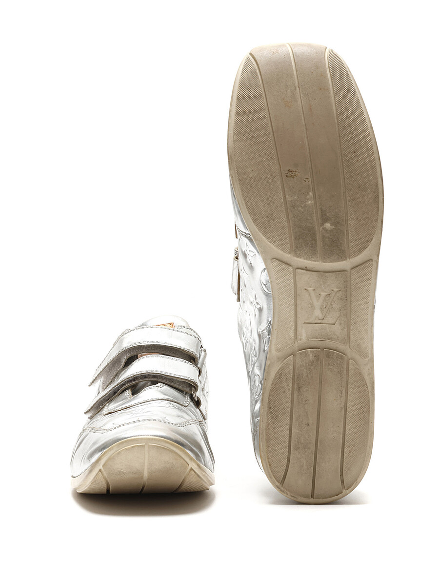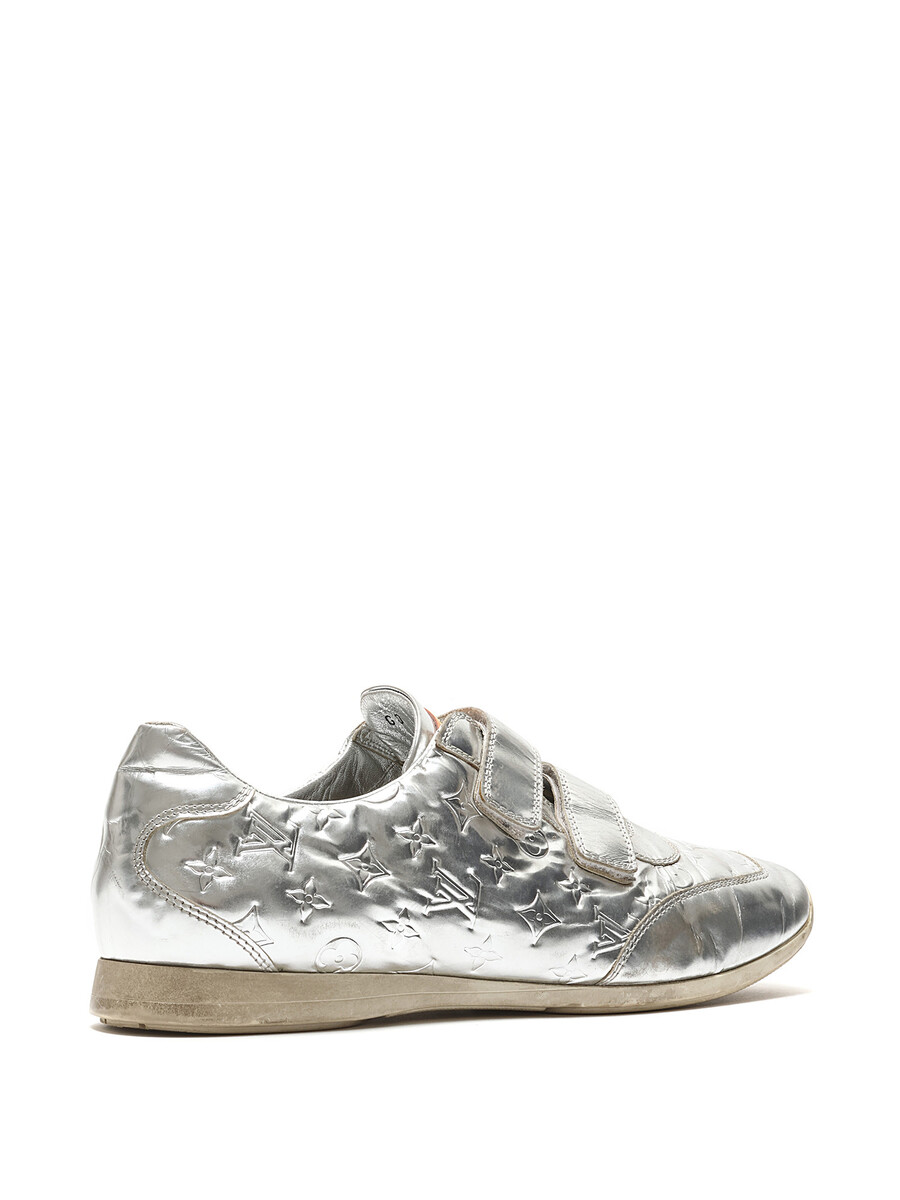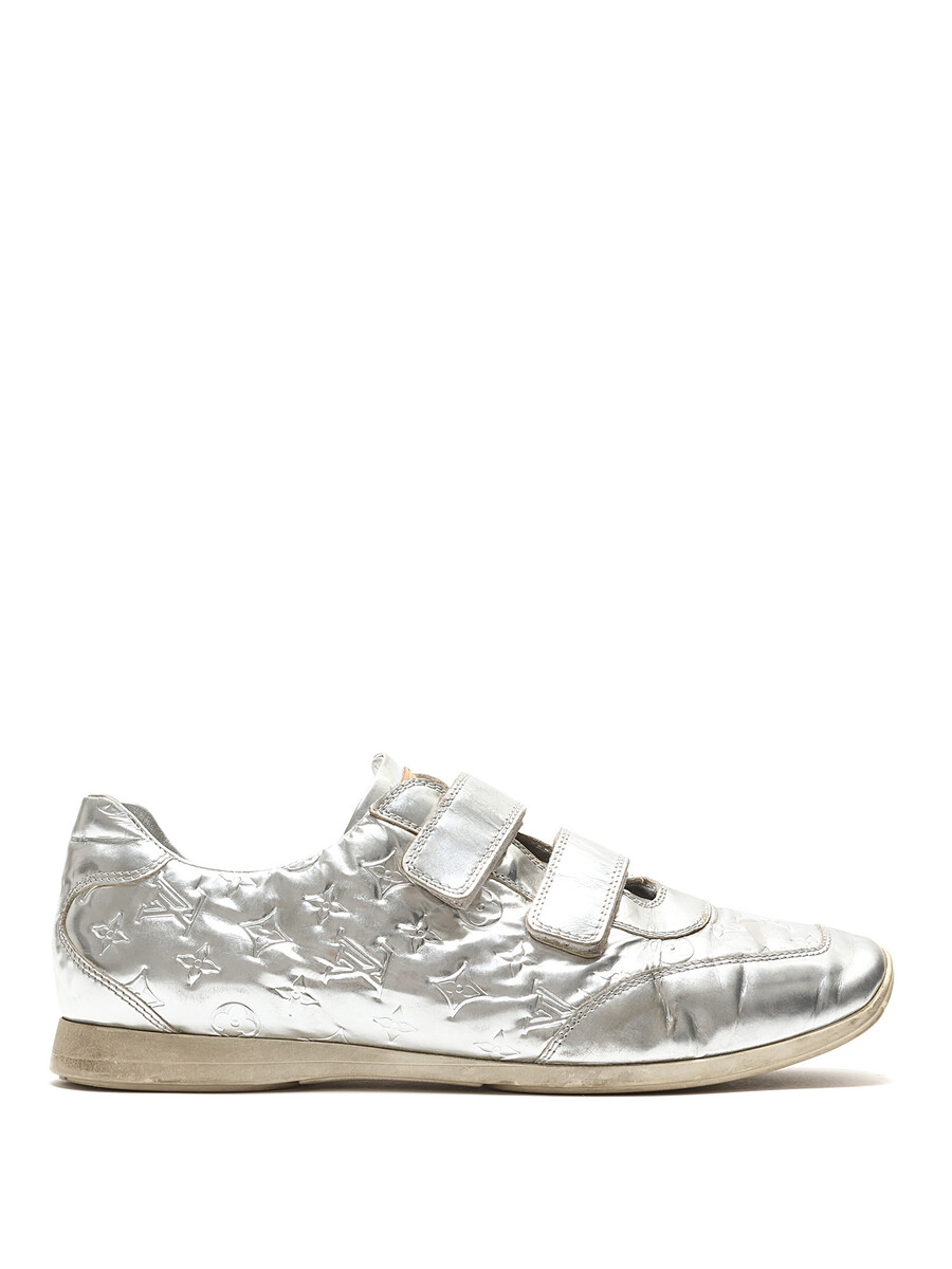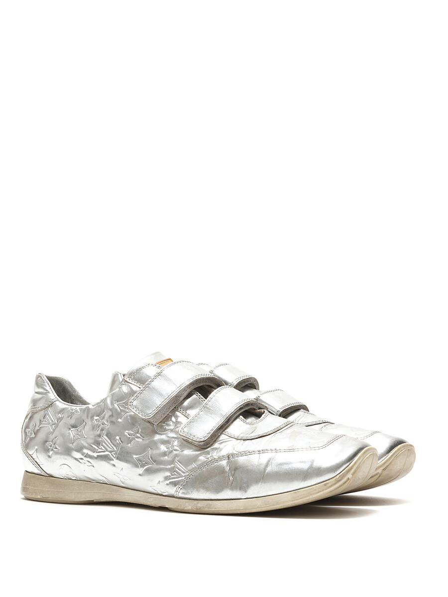 Baskets basses en cuir argent métallique à motif monogramme embossé. Fermeture à velcro. Bout carré. Semelle en caoutchouc. Avec dust bag.
