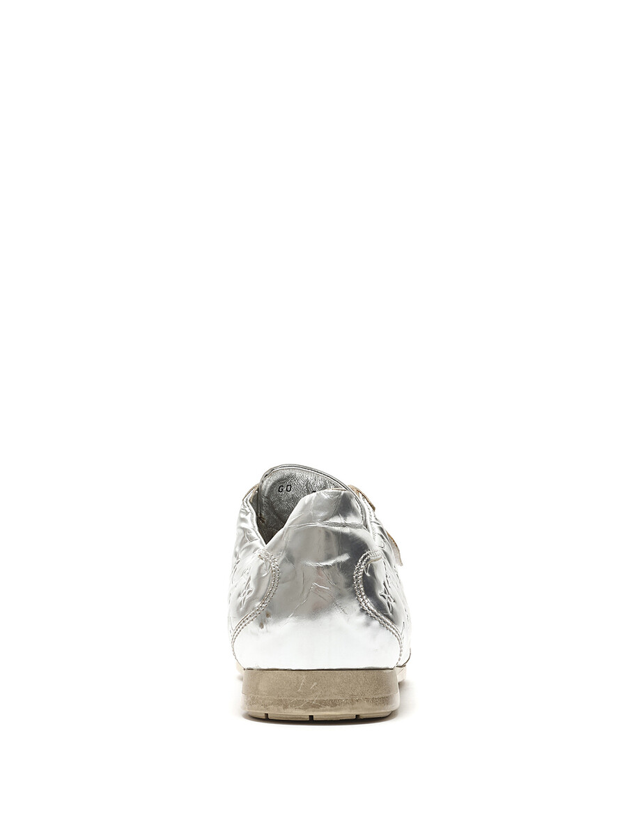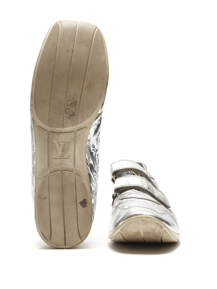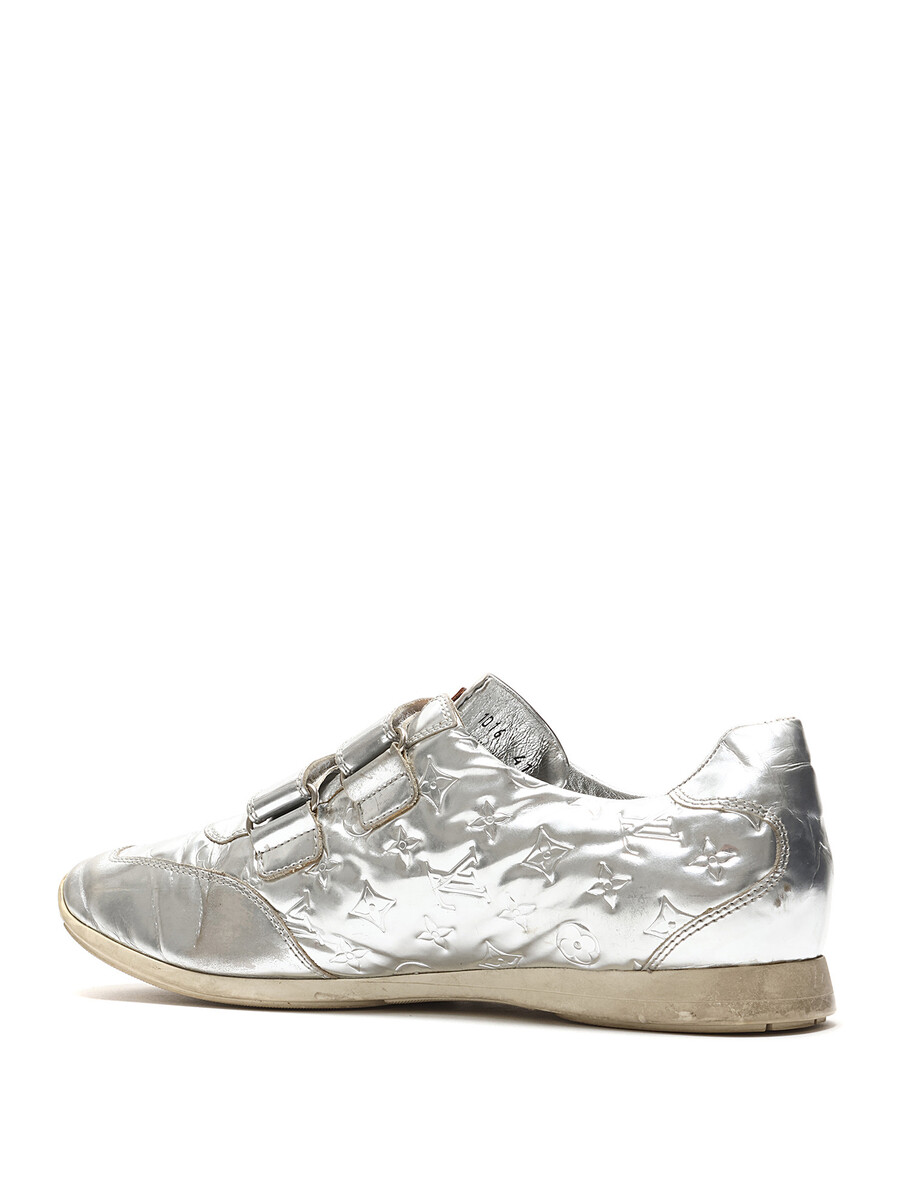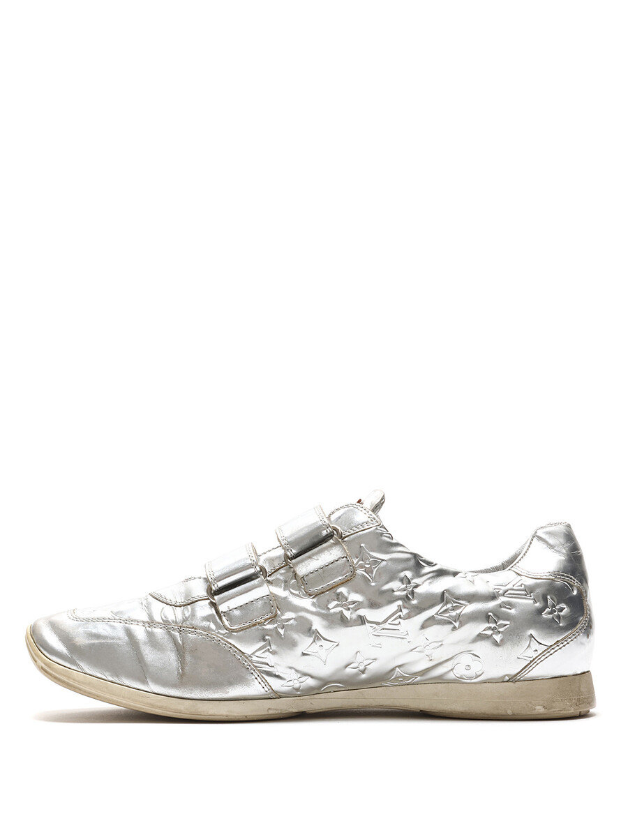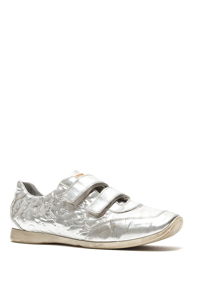 Baskets basses en cuir argent métallique à motif monogramme embossé. Fermeture à velcro. Bout carré. Semelle en caoutchouc. Avec dust bag.