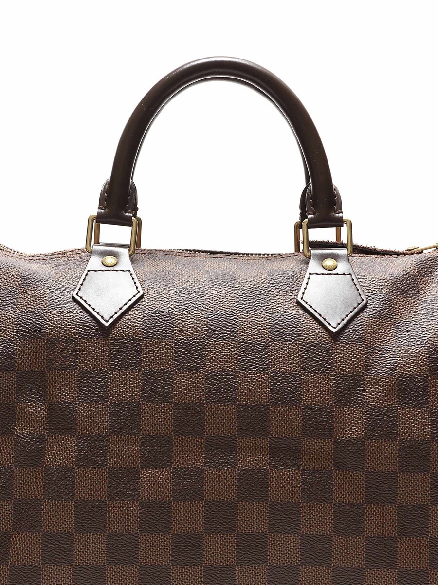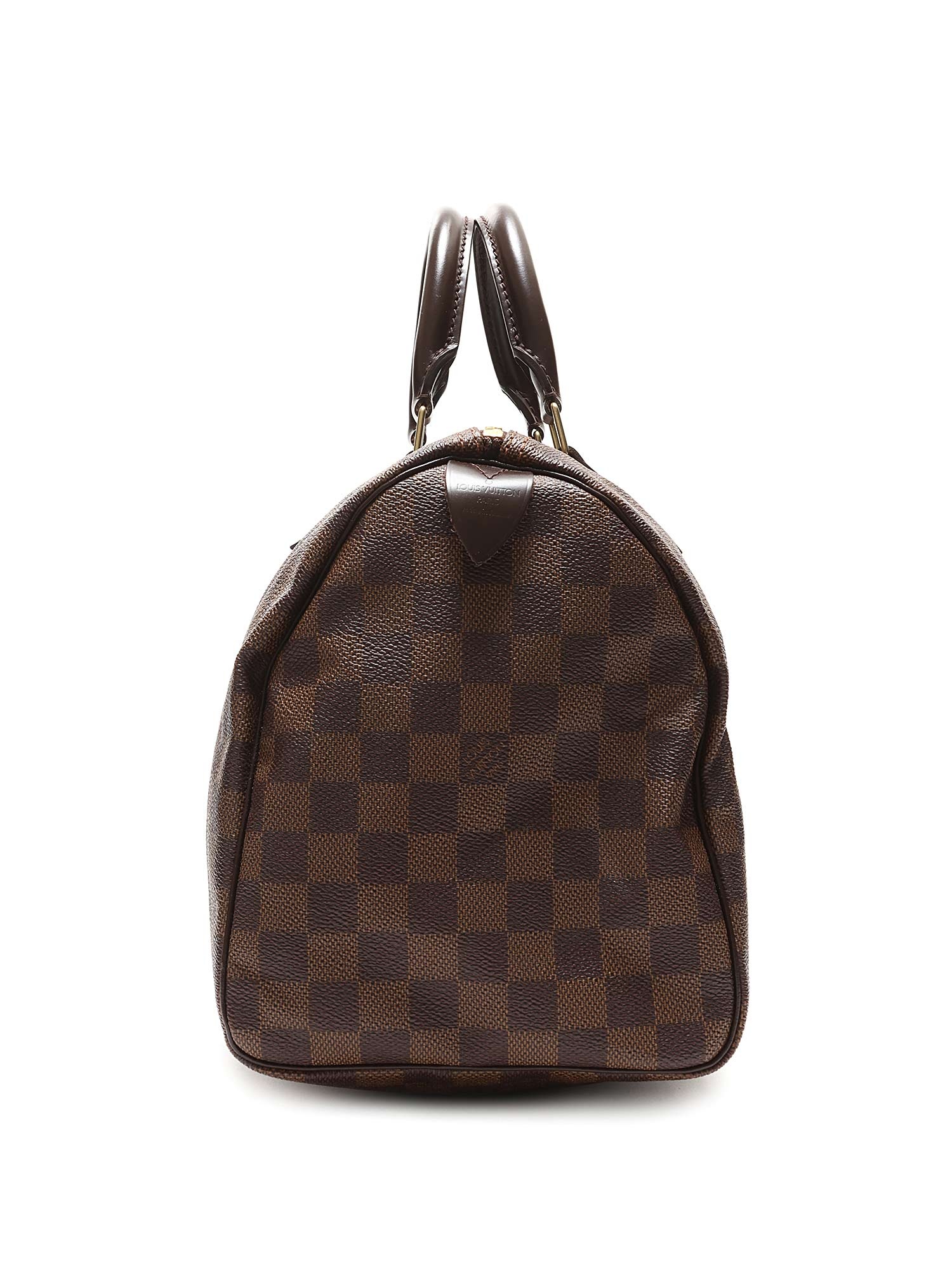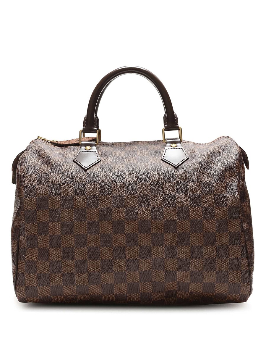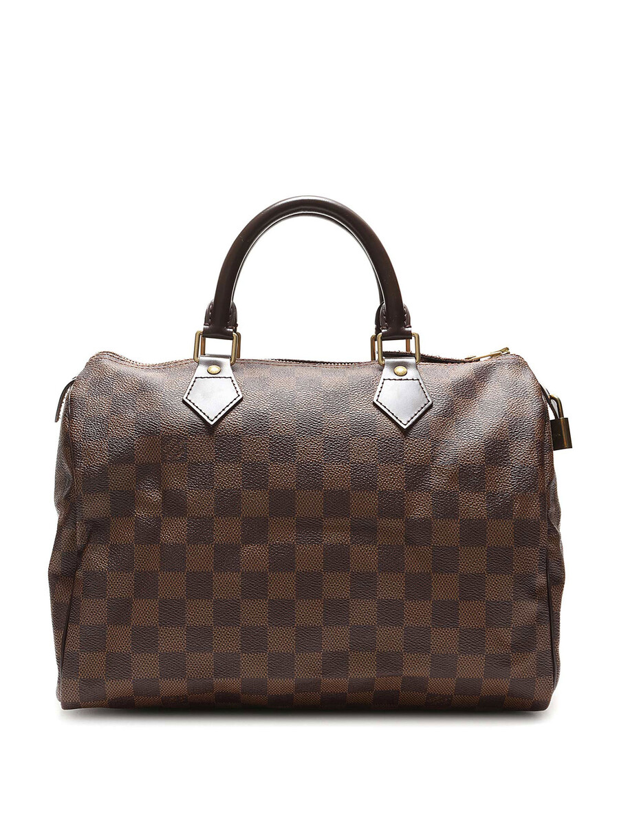 Sac Boston en toile enduite au motif emblématique Damier Ebene. Fermeture à glissière avec cadenas, poignées en cuir roulé, et garnitures en cuir. Ferrures dorées. Avec dustbag.