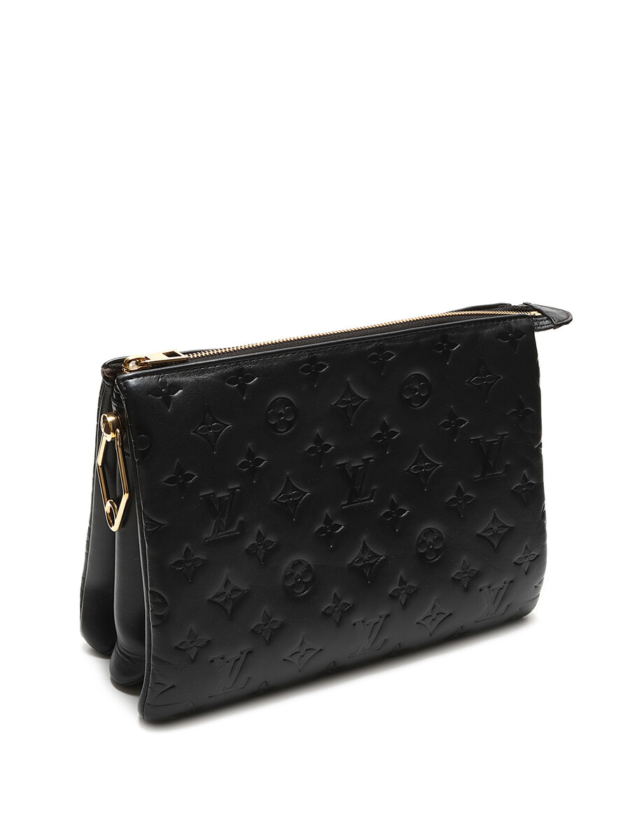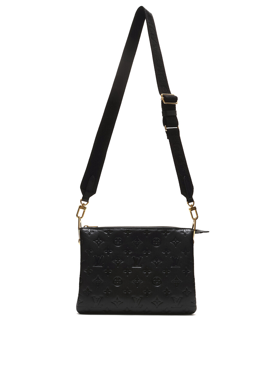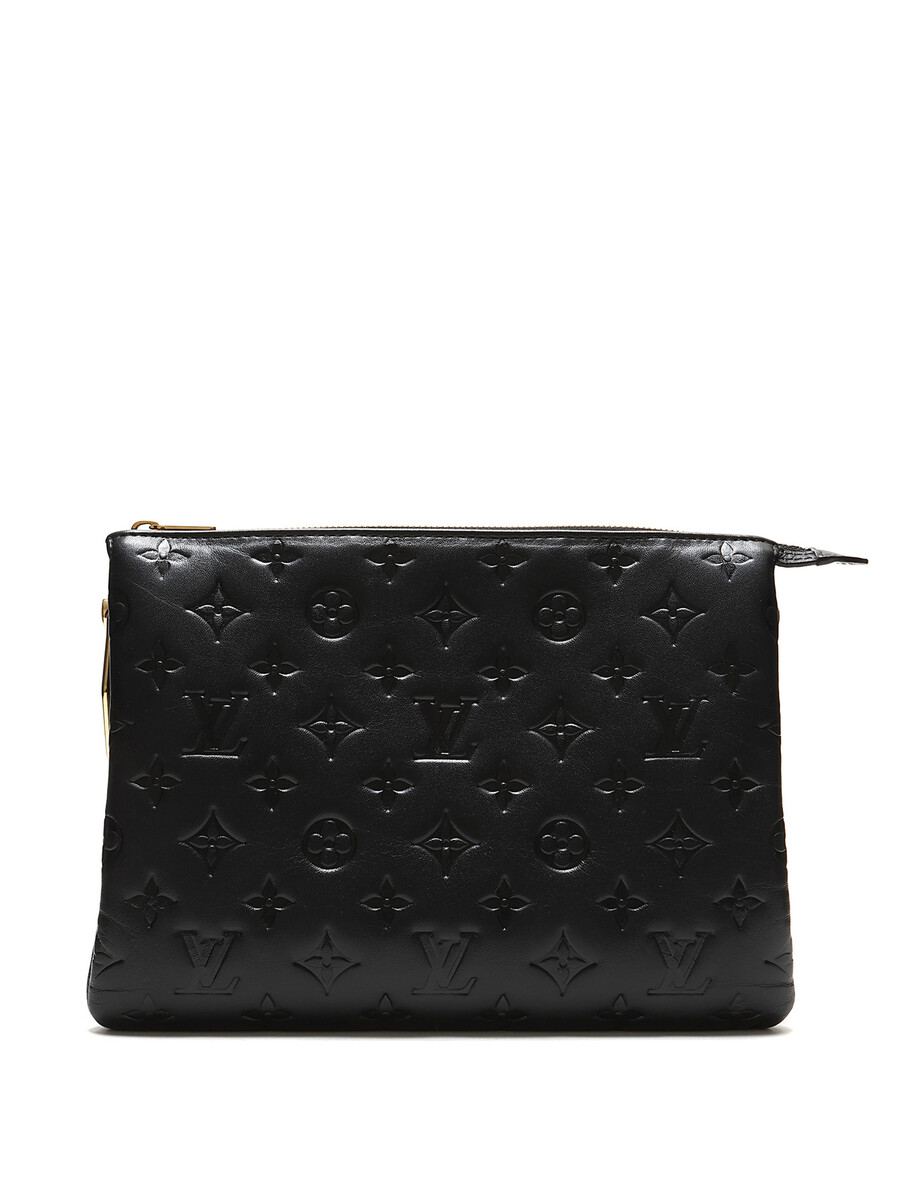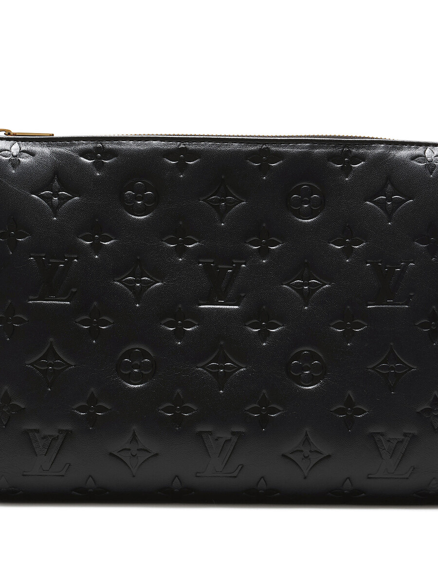 Pochette en cuir noir à motif monogramme embossé. Ferrures dorées. Fermeture à glissière. Bandoulière amovible et ajustable. Avec dust bag.