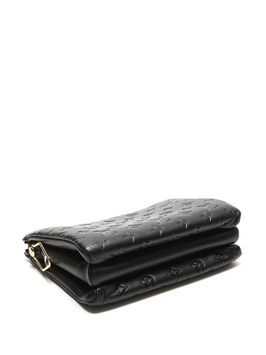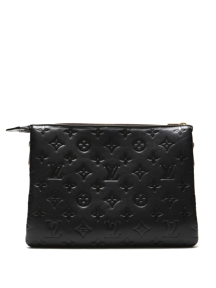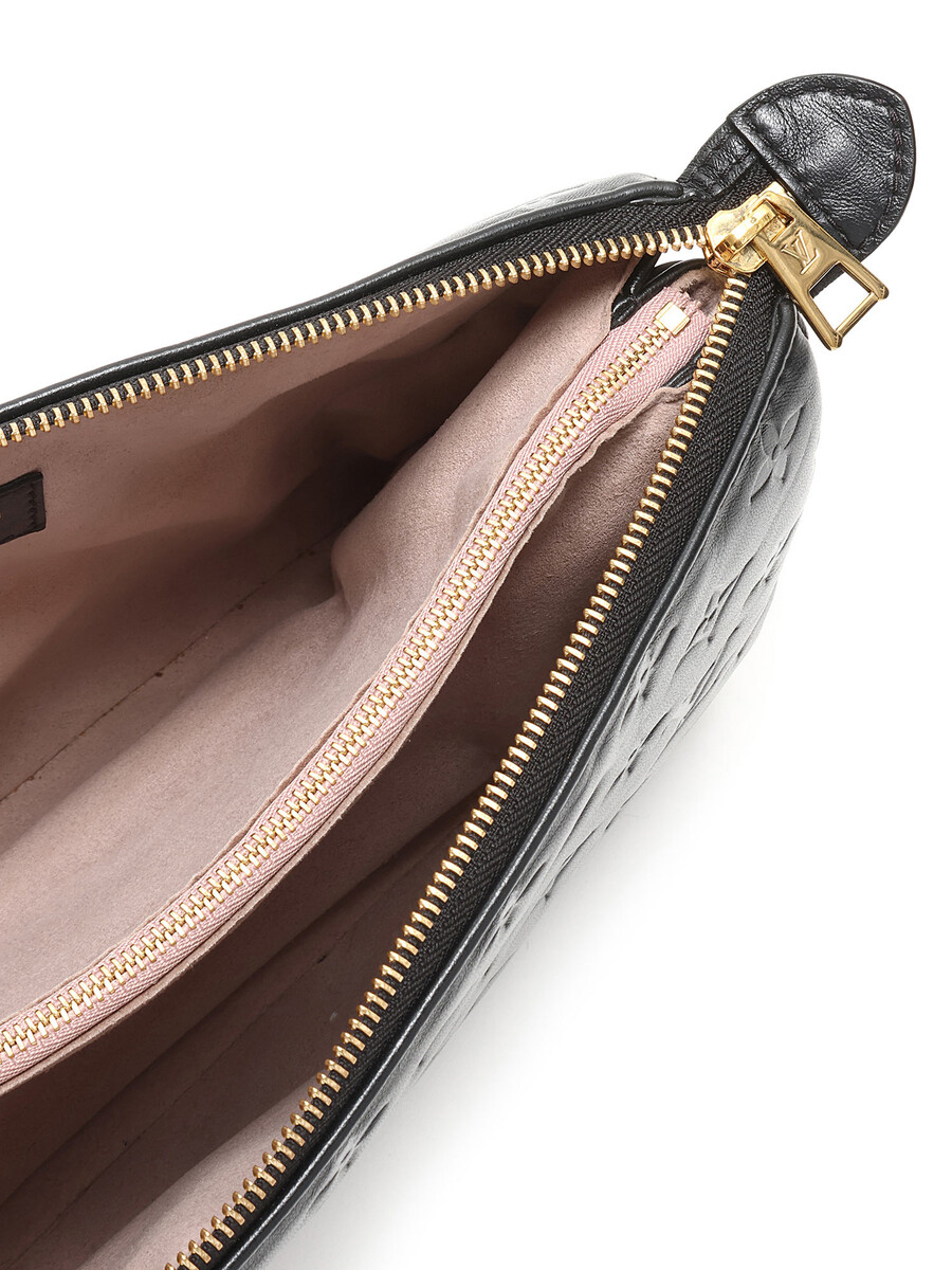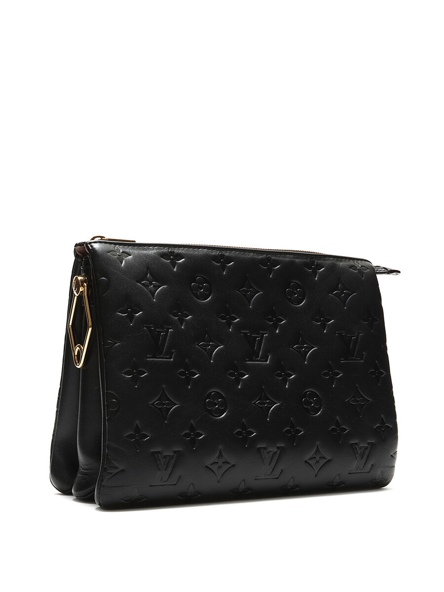 Pochette en cuir noir à motif monogramme embossé. Ferrures dorées. Fermeture à glissière. Bandoulière amovible et ajustable. Avec dust bag.