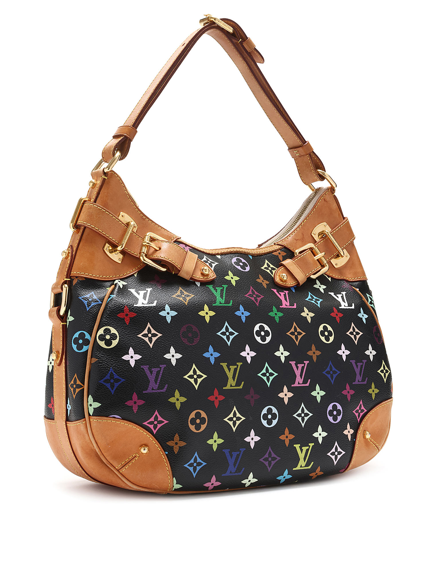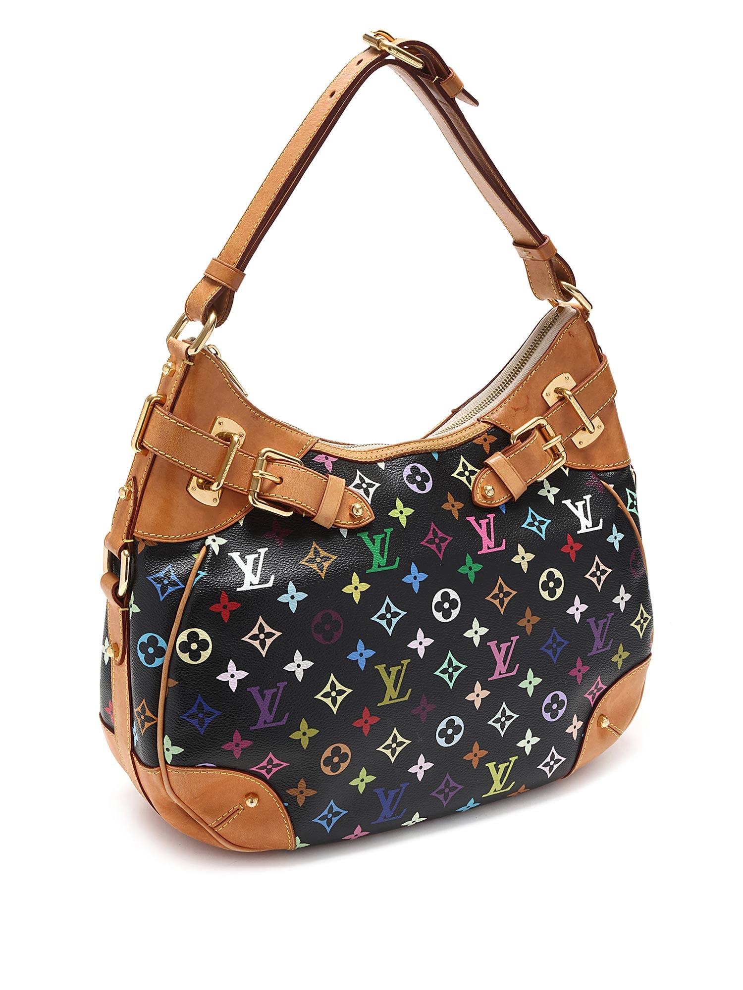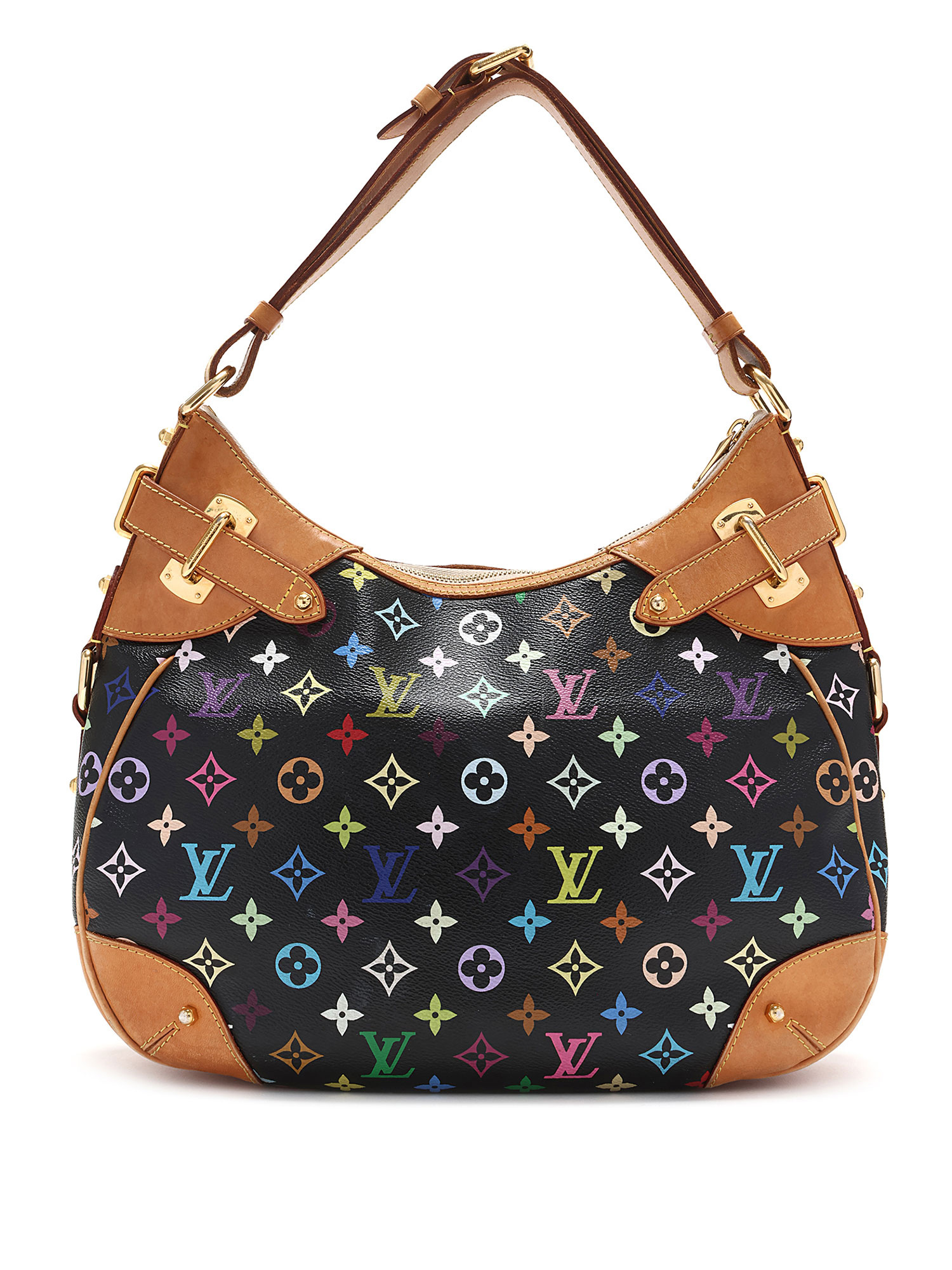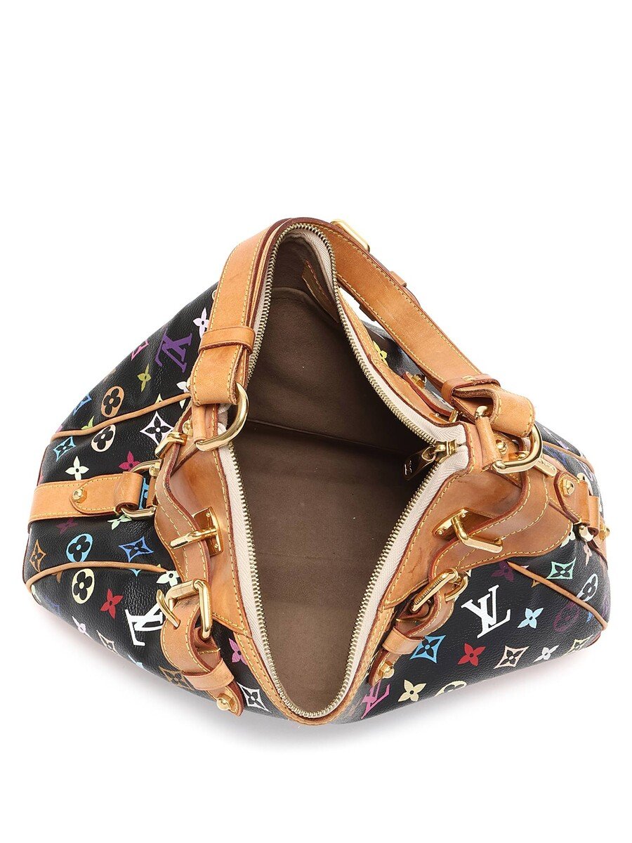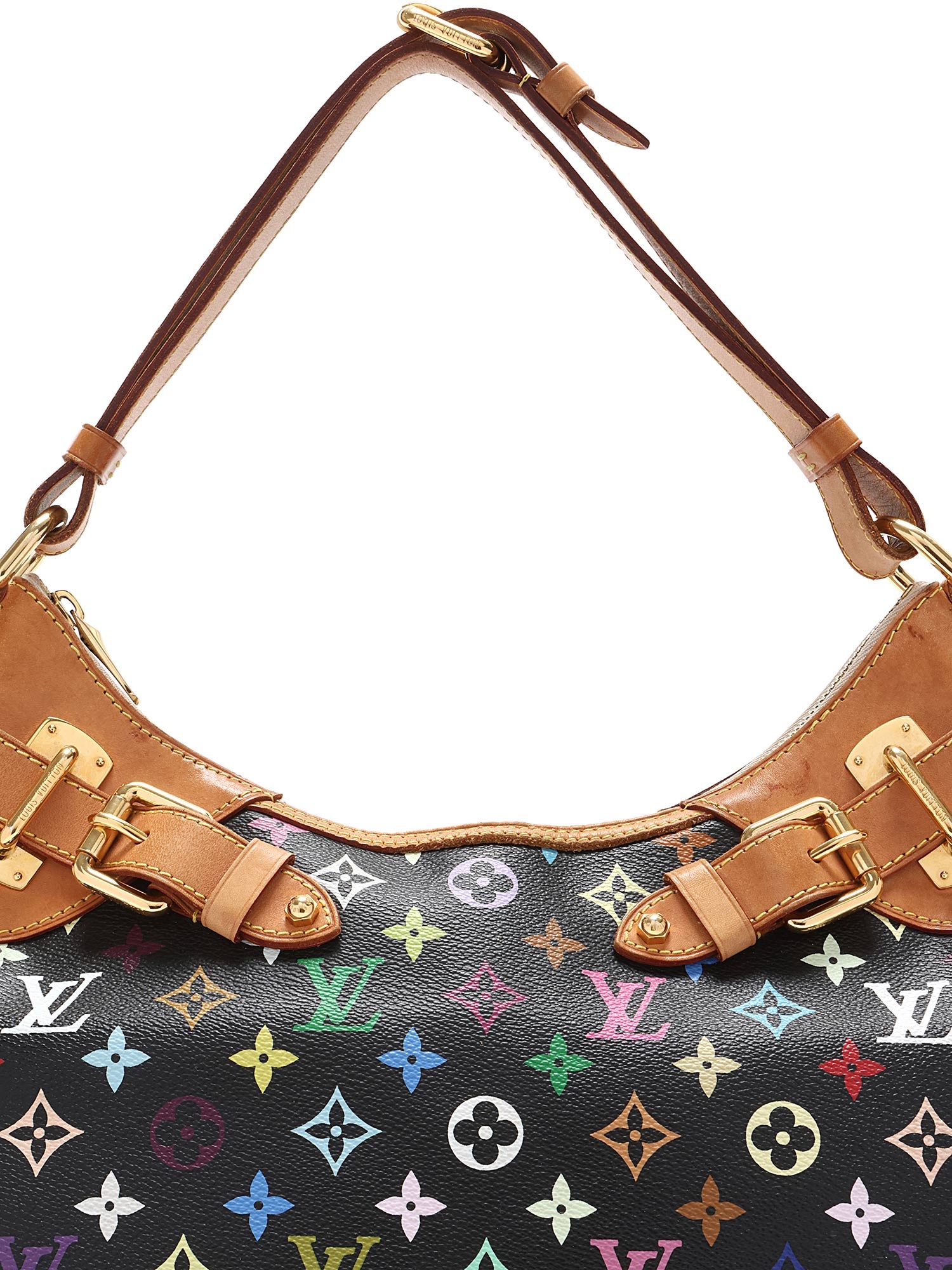 Sac bandoulière en toile enduite noir à motif multicolore. Bordures en cuir vachetta. Quincaillerie en laiton doré. Bandoulière en cuir réglable. Fermeture à glissière.