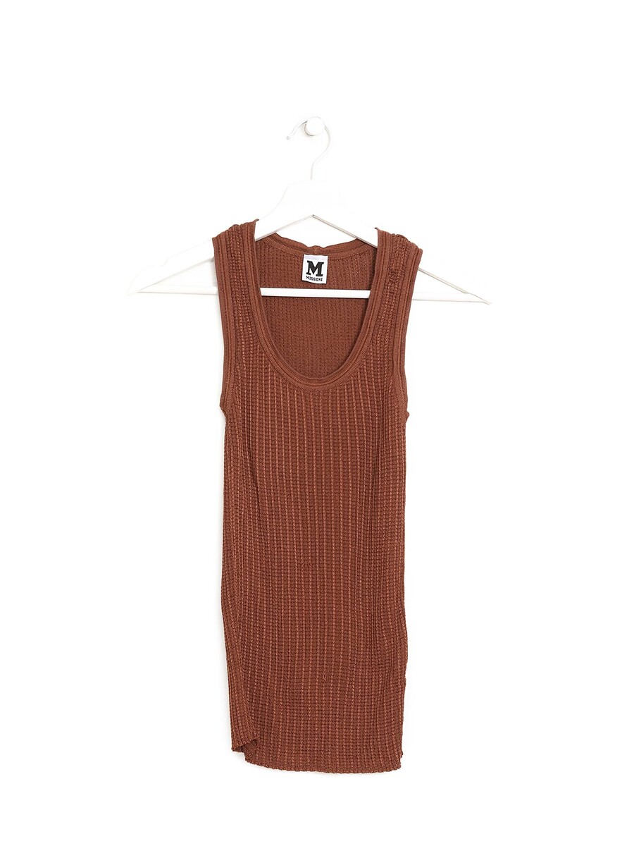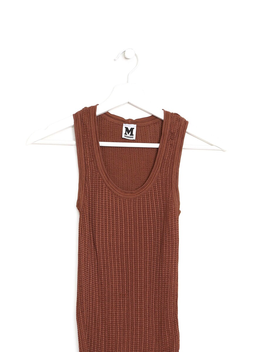 Débardeur en tricot brun, sans manches. Texture douce et légère.