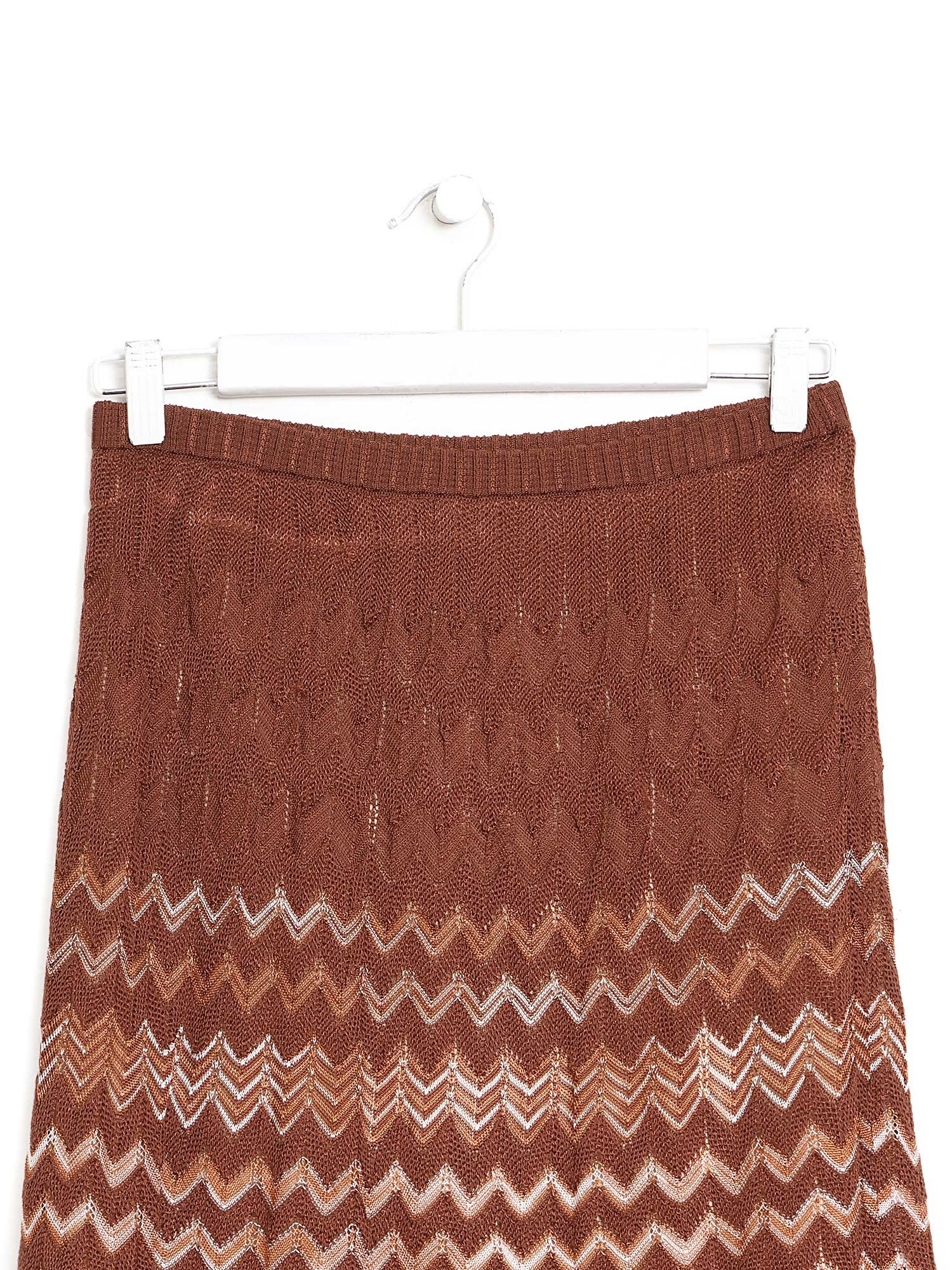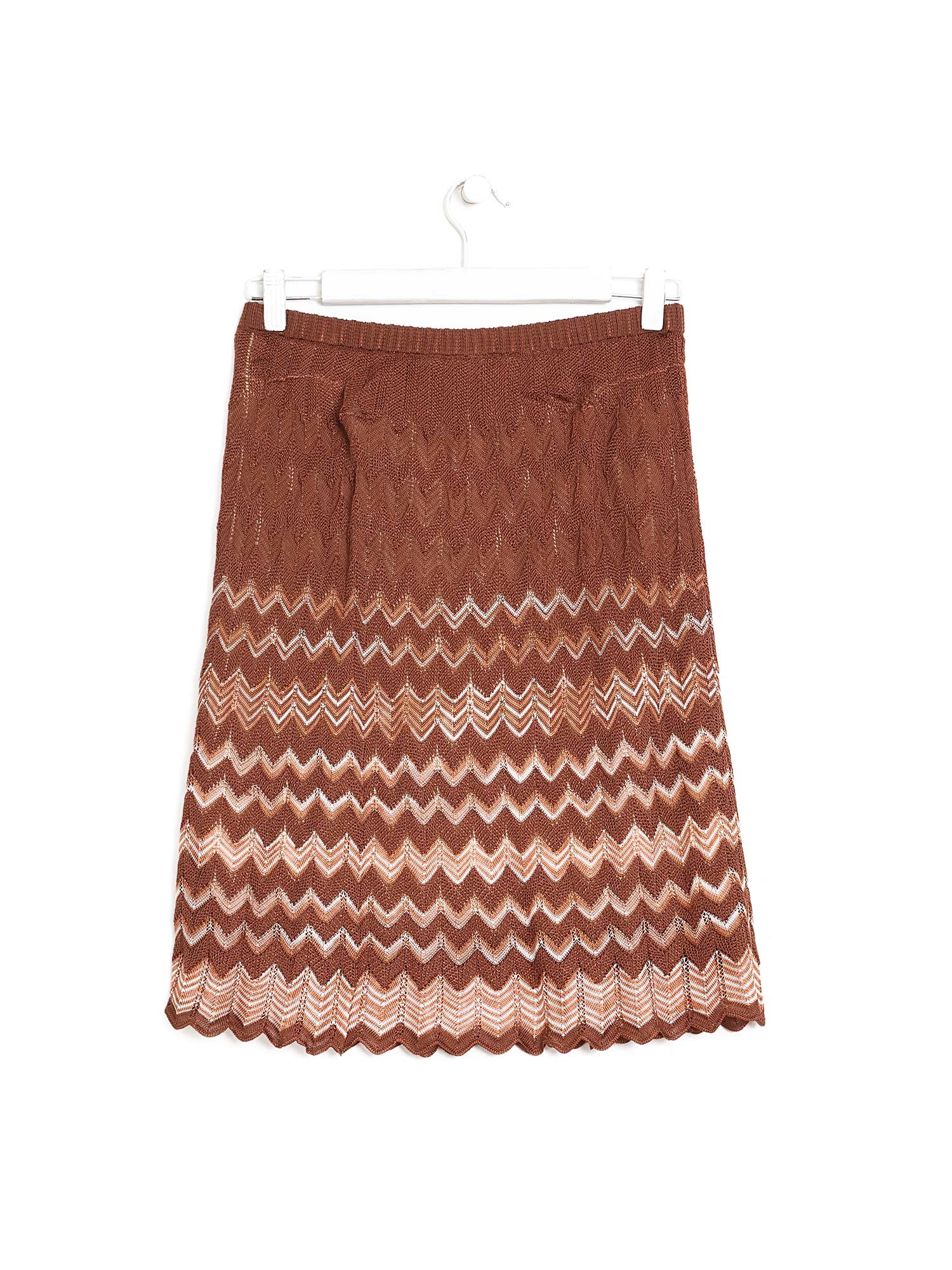 Jupe midi en brun à motif zigzag. Taille élastique.