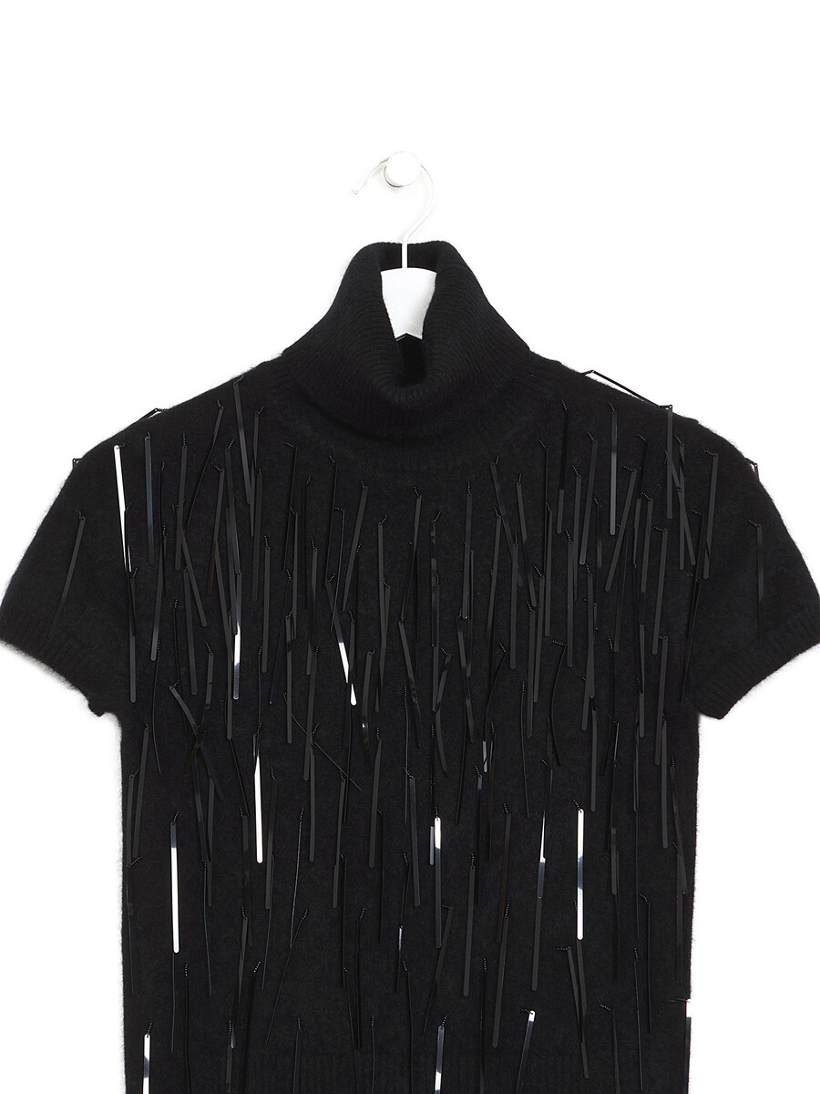 Pull à manches courtes et col roulé en cachemire noir. Doté de sequins et de franges.