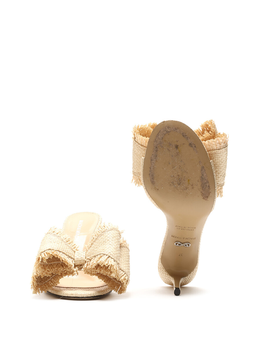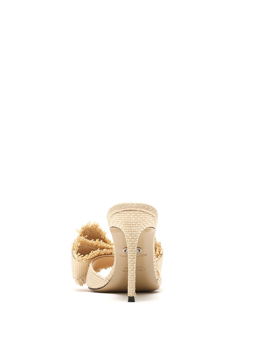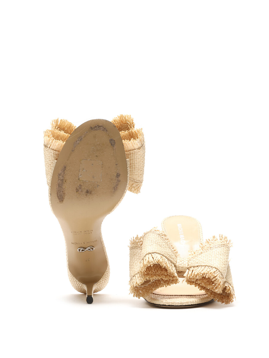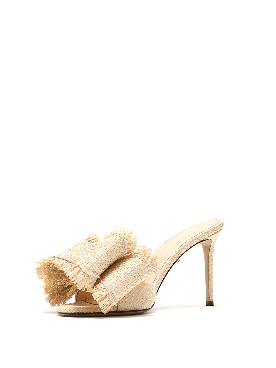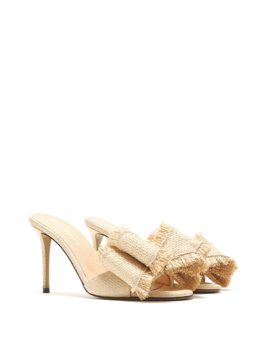 Mules à talons en raphia avec un grand nœud décoratif sur le dessus. Style à enfiler avec bout ouvert. Semelle en cuir.