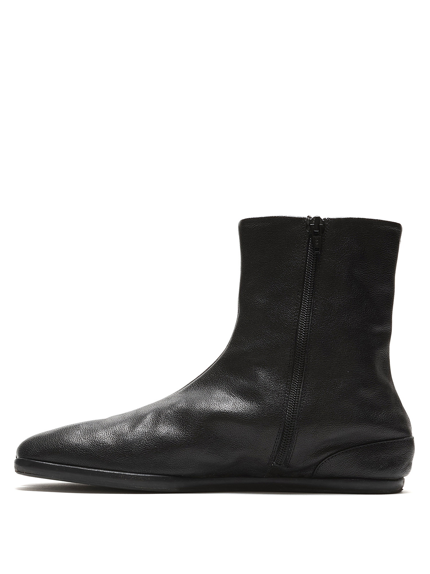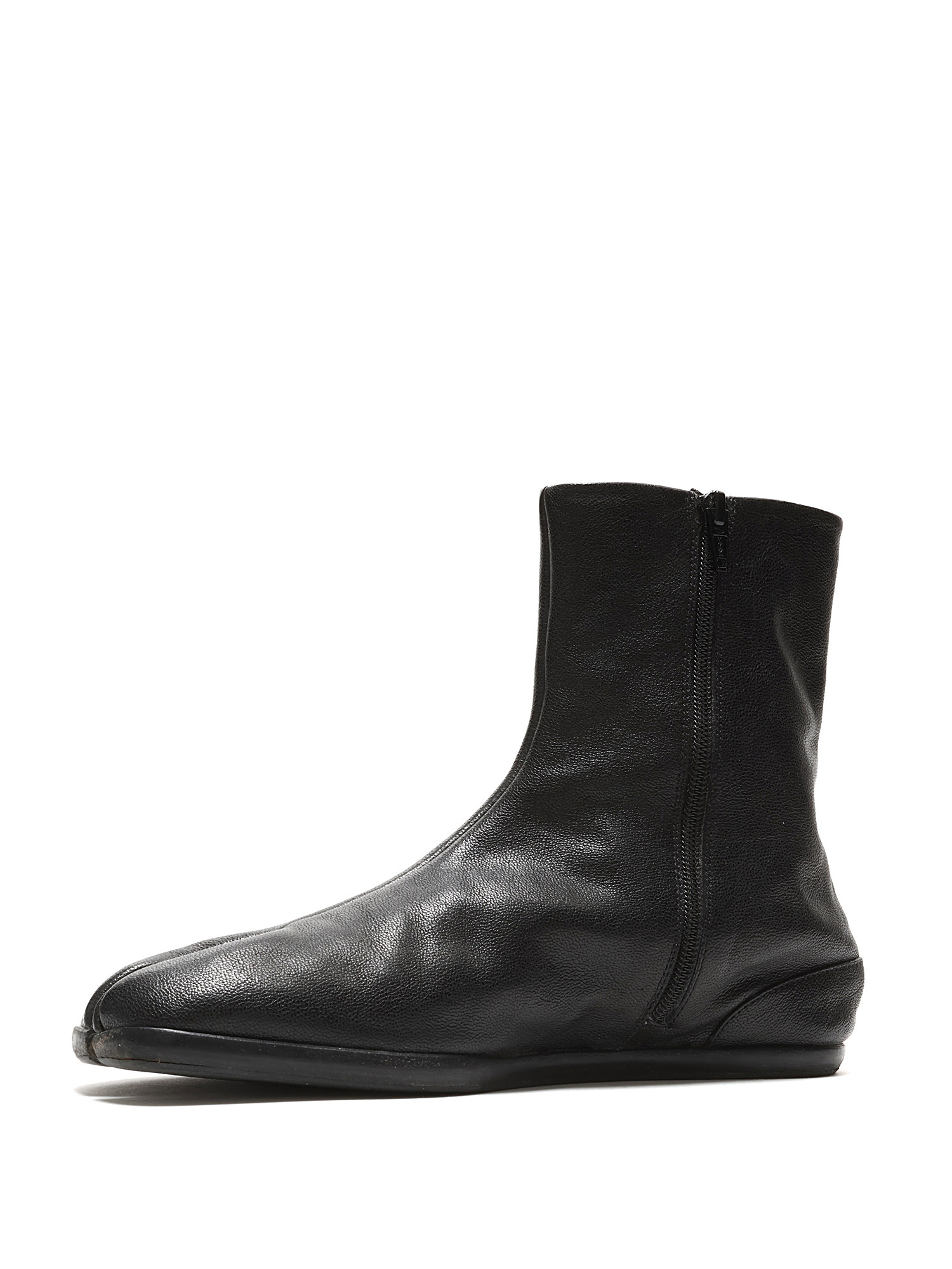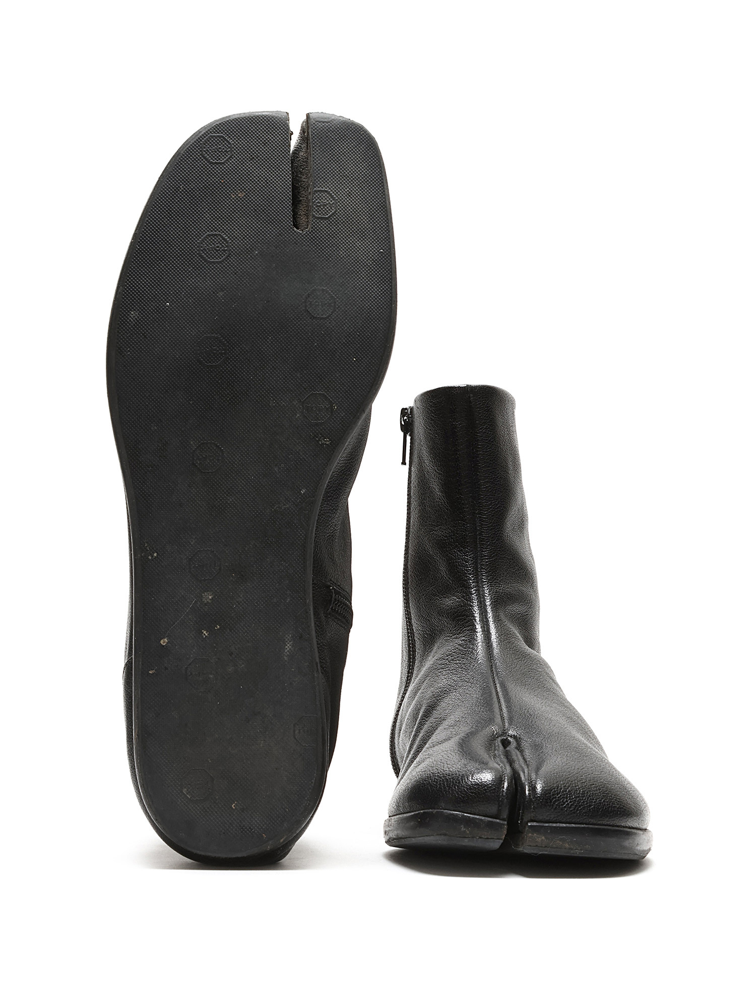 Bottes en cuir noir à bout fendu avec fermeture à glissière. Coutures ton sur ton et doublure en cuir. Semelle remplacée avec signes d'usure et décollement au talon.