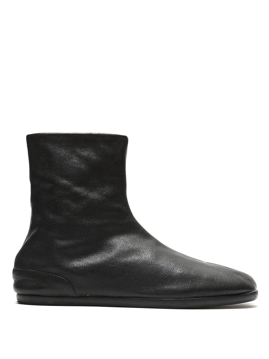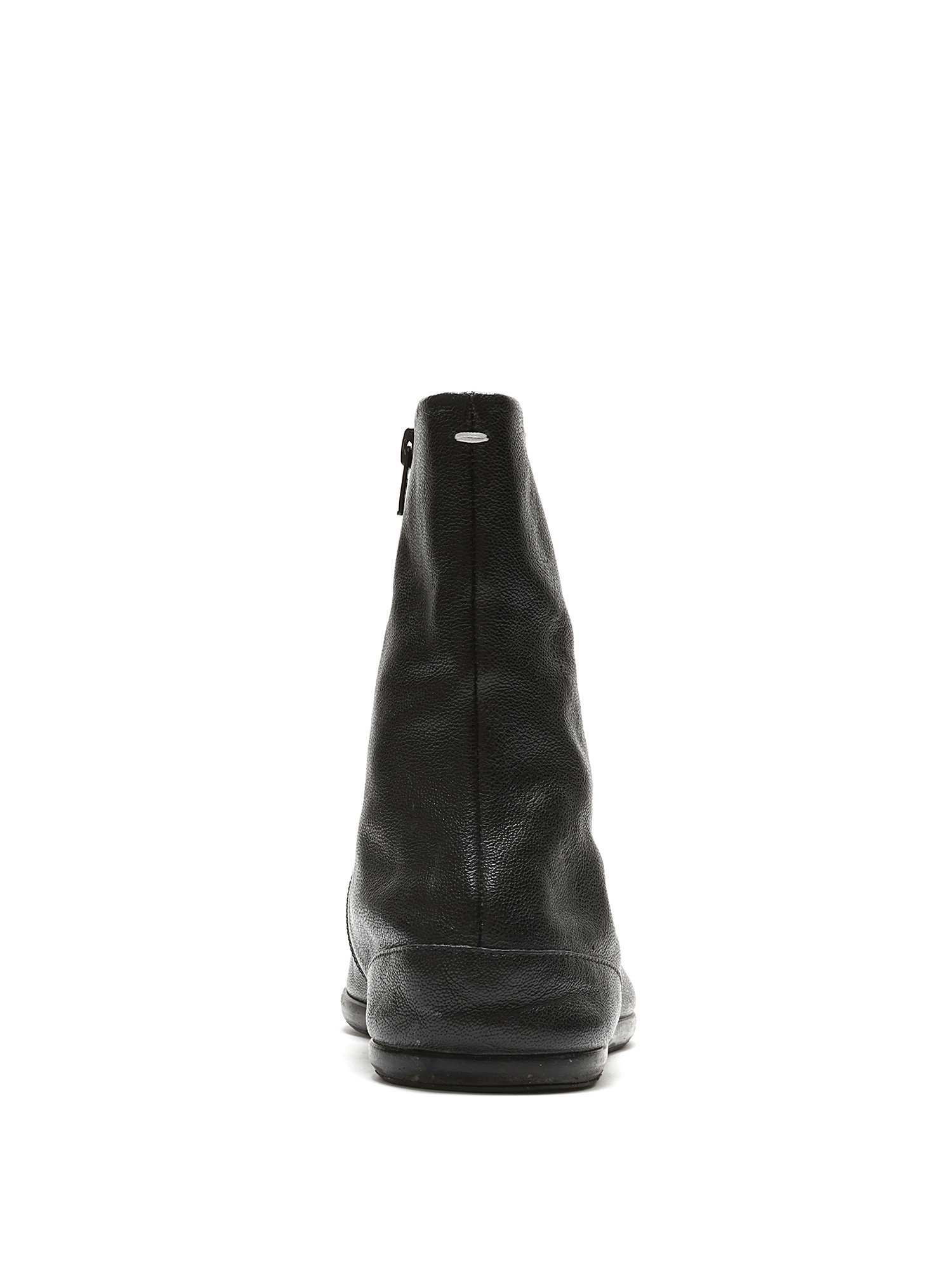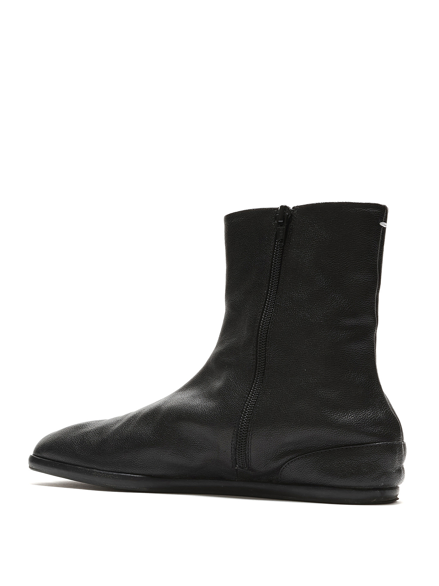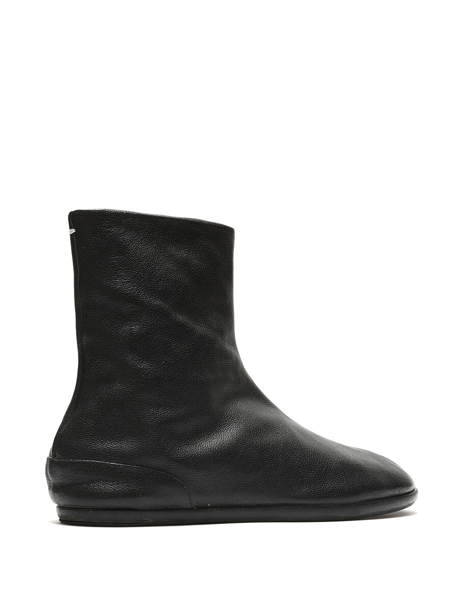 Bottes en cuir noir à bout fendu avec fermeture à glissière. Coutures ton sur ton et doublure en cuir. Semelle remplacée avec signes d'usure et décollement au talon.