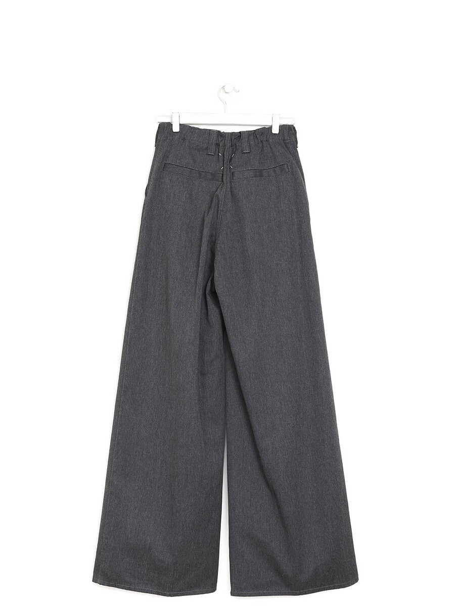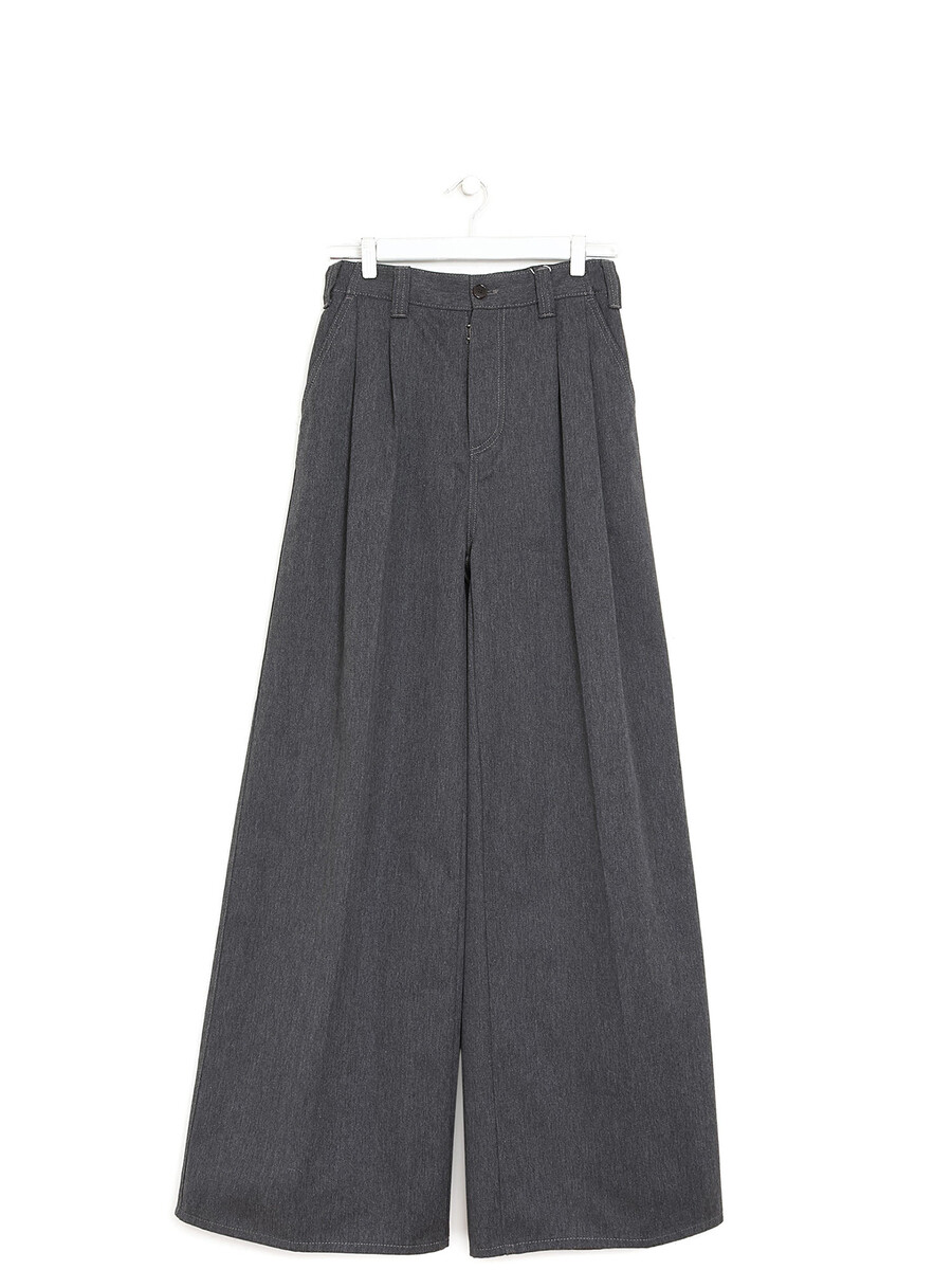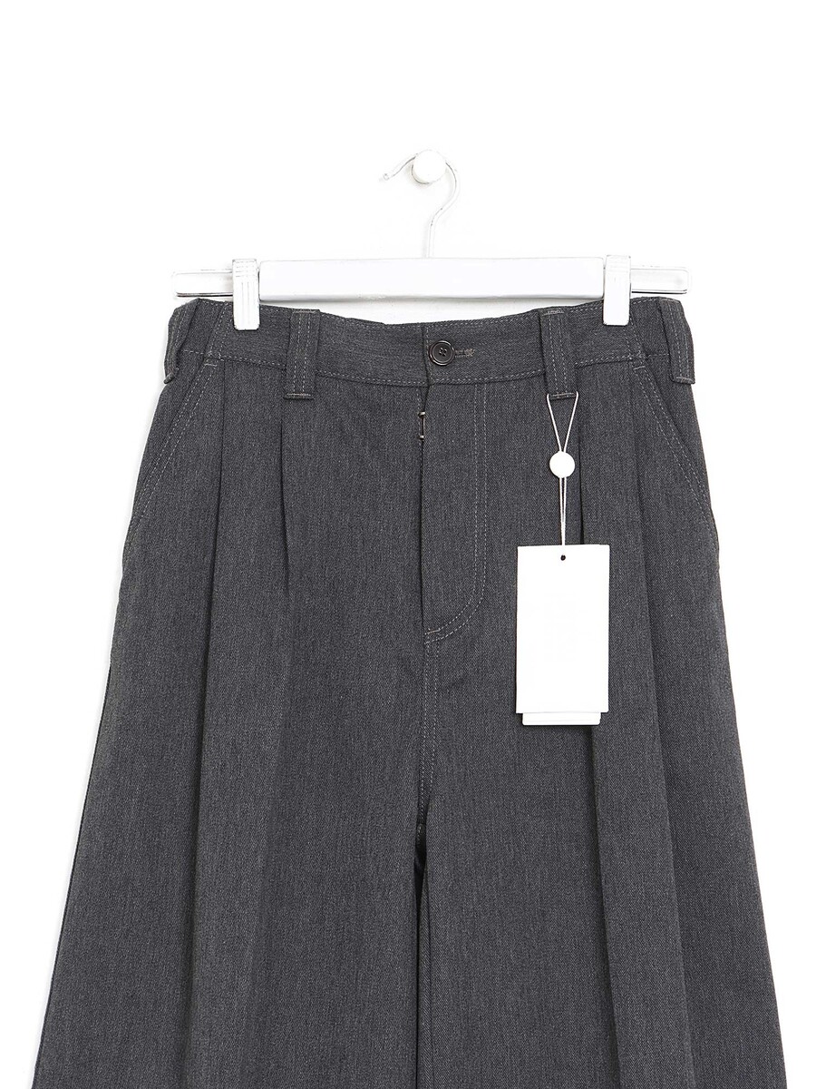 Pantalon ample en laine grise. Fermeture frontale à glissière et bouton. Poches latérales.
