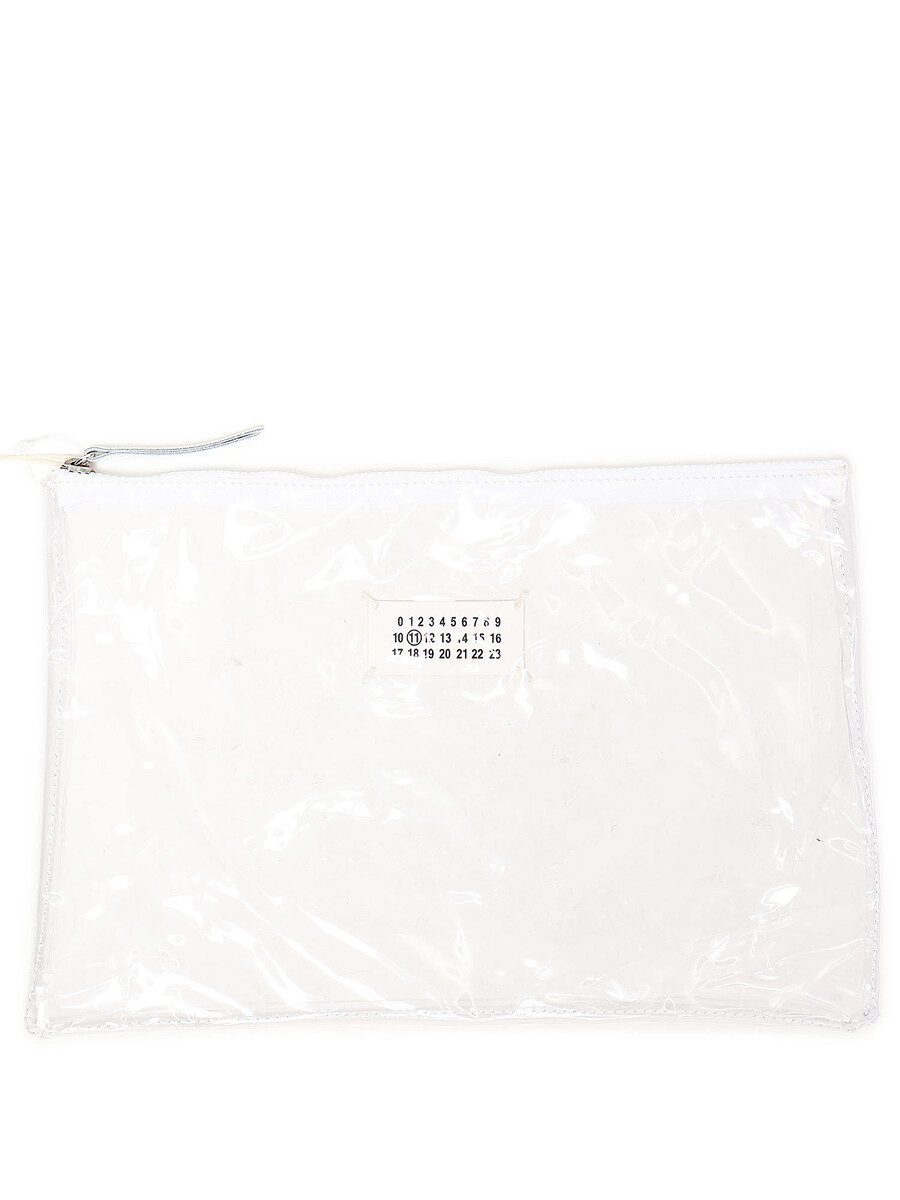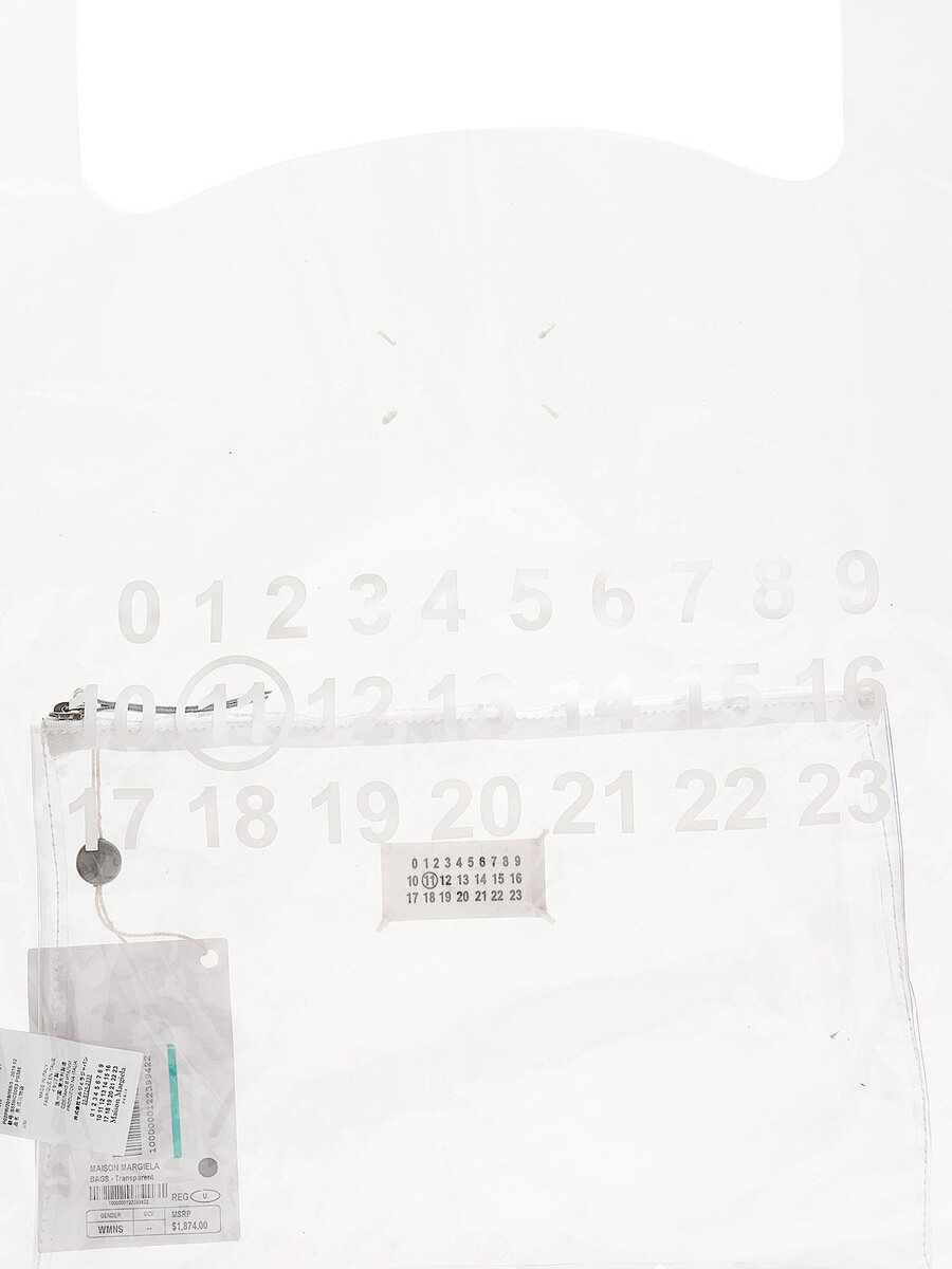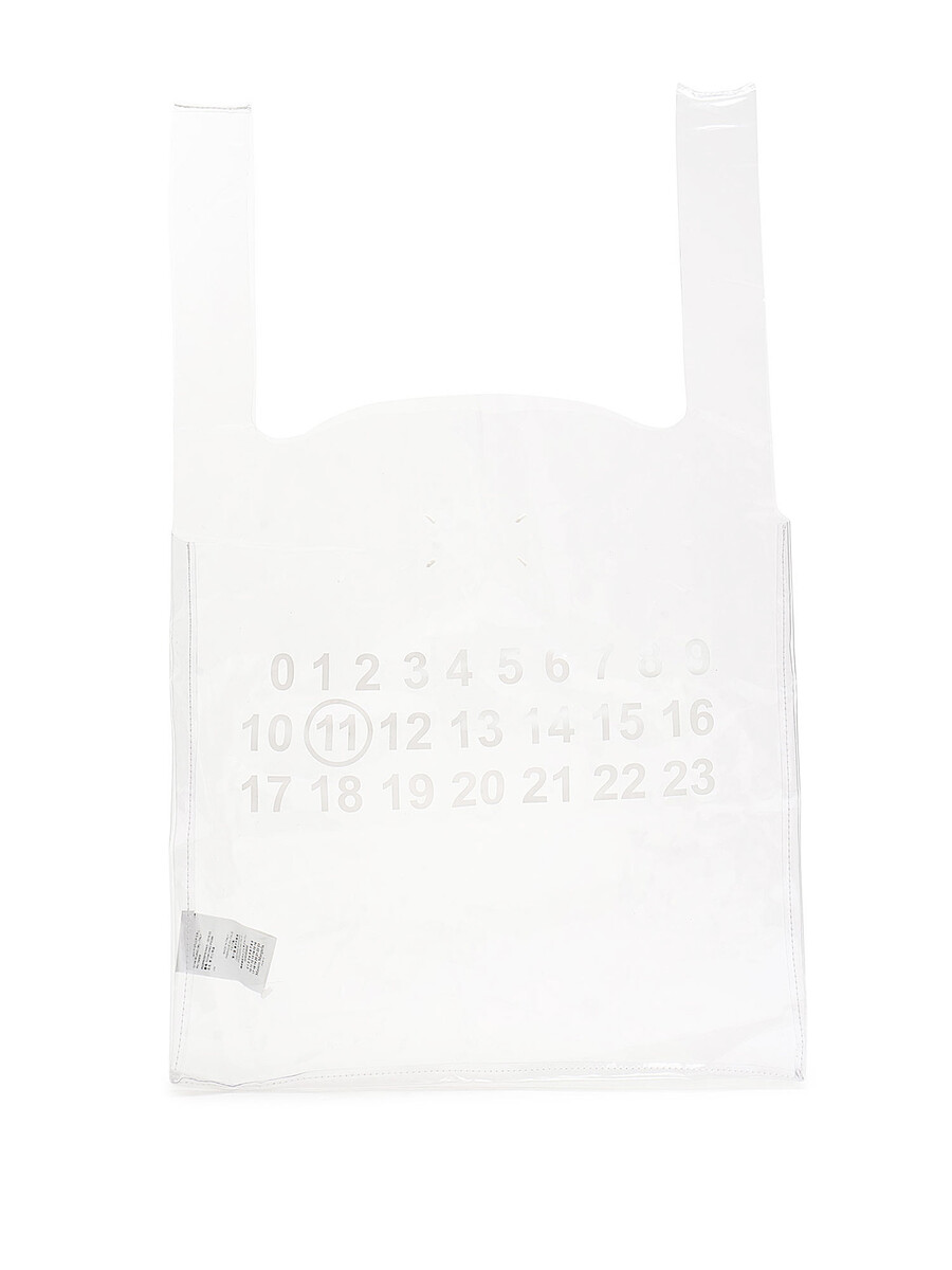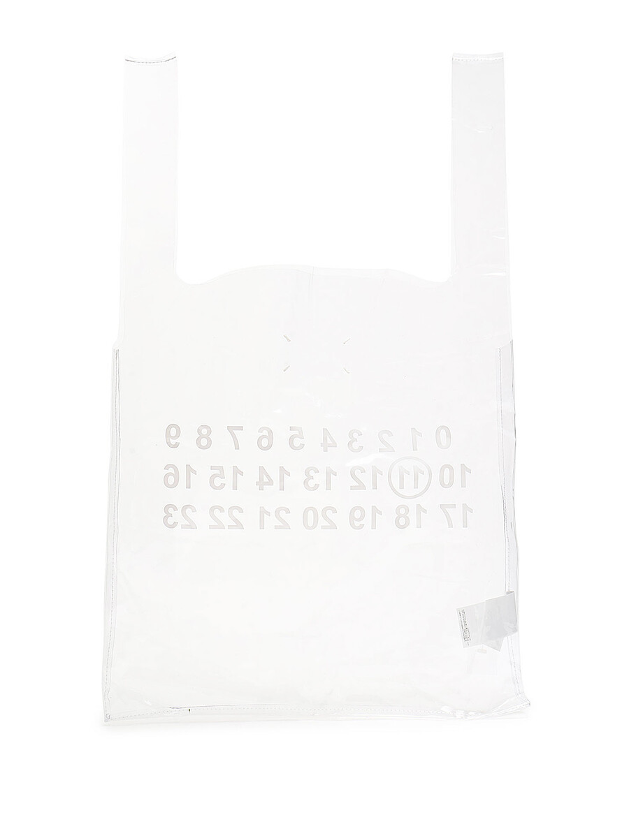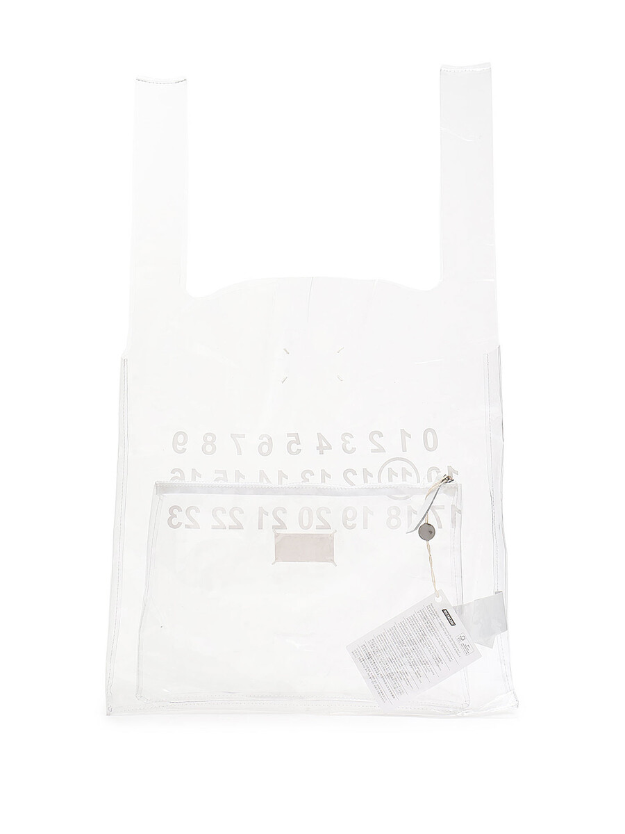 Sac à main en PVC transparent avec logo imprimé en blanc. Deux poignées supérieures. Pochette intérieure amovible avec écusson à logo noir et blanc. Fermeture à glissière supérieure. Couture emblématique au dos. Avec dust bag.