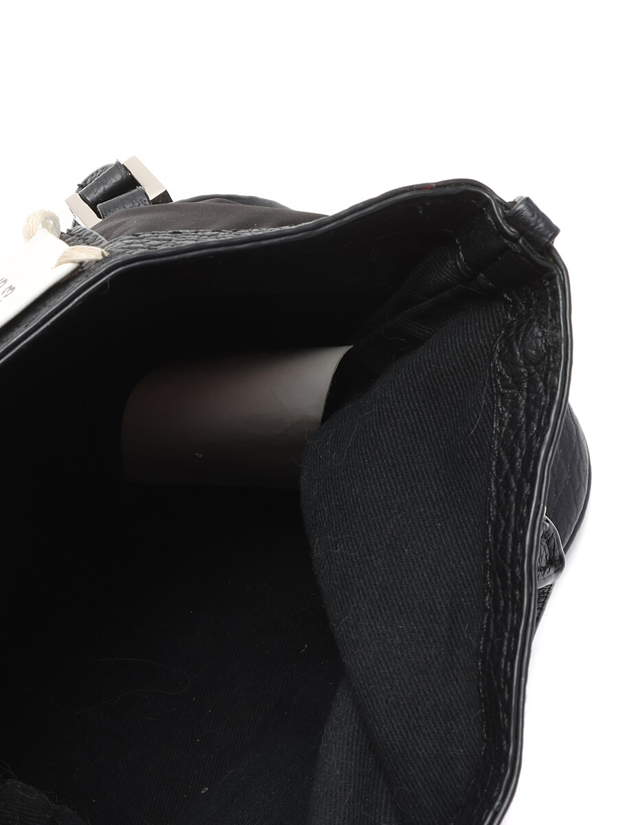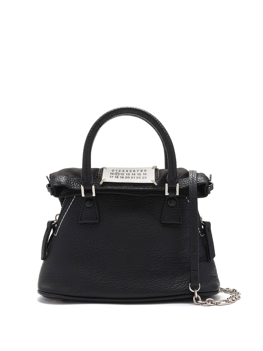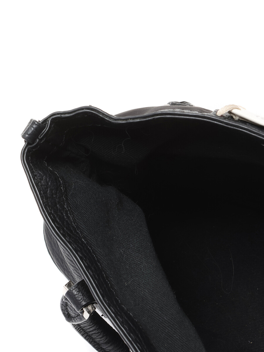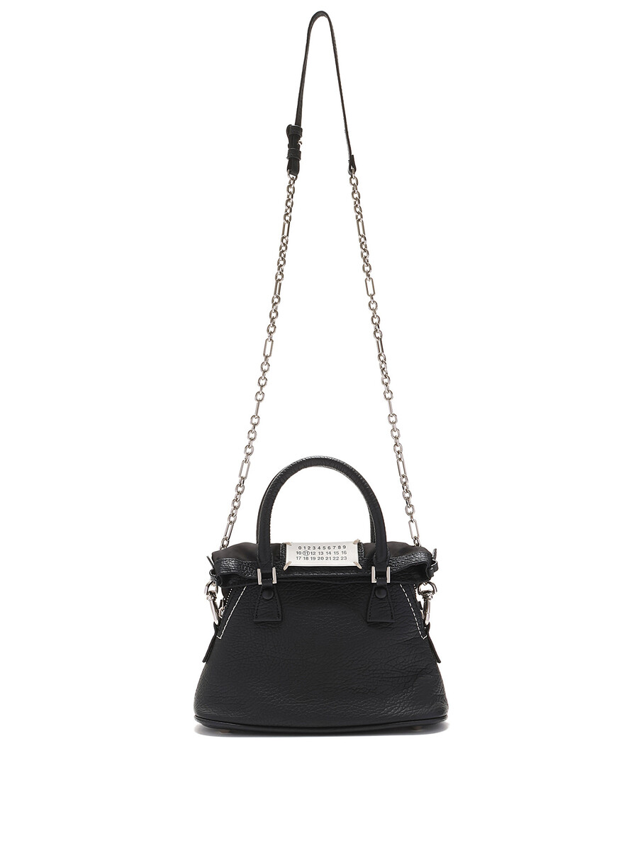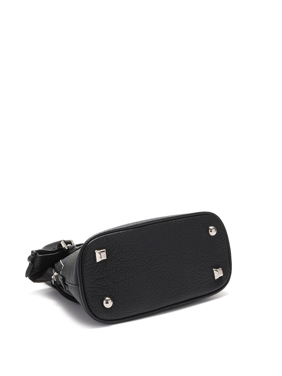 Mini sac en cuir grainé noir avec une bandoulière en chaîne en métal argenté. Fermeture à pression. Double poignées supérieures. Bandoulière en chaîne détachable. Quincaillerie argentée.