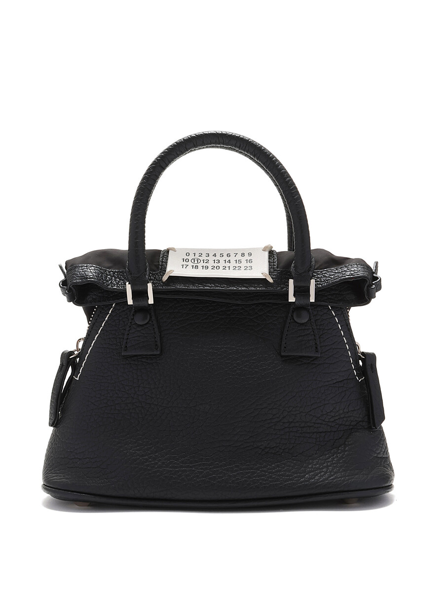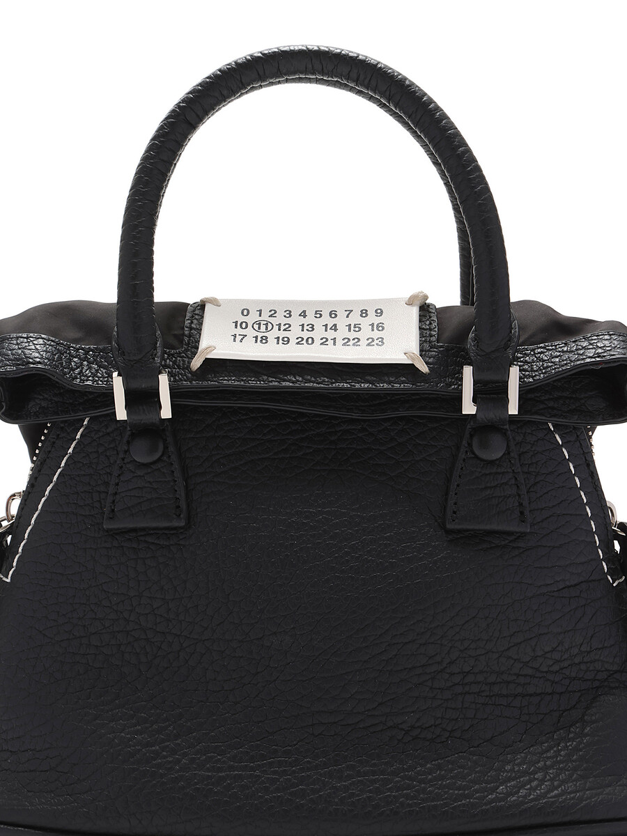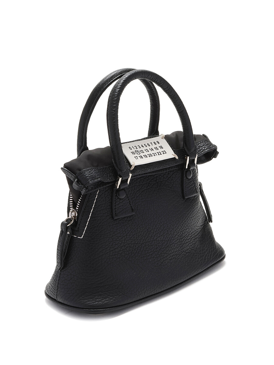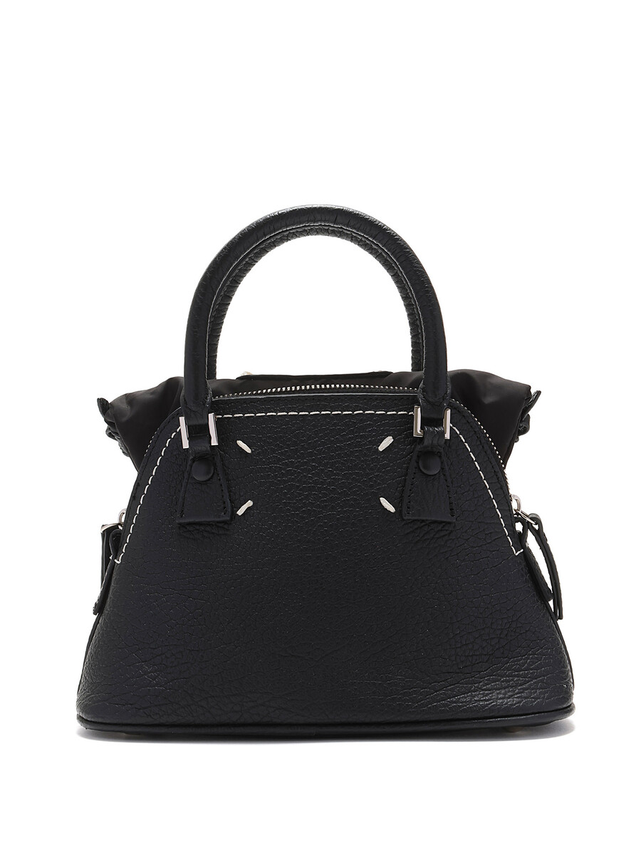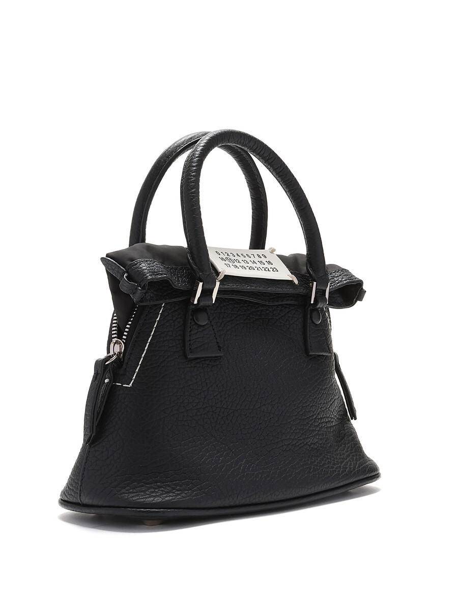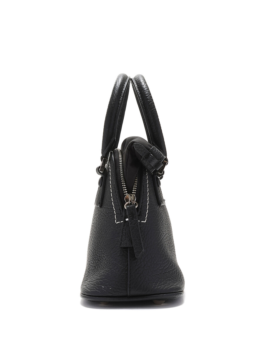 Mini sac en cuir grainé noir avec une bandoulière en chaîne en métal argenté. Fermeture à pression. Double poignées supérieures. Bandoulière en chaîne détachable. Quincaillerie argentée.