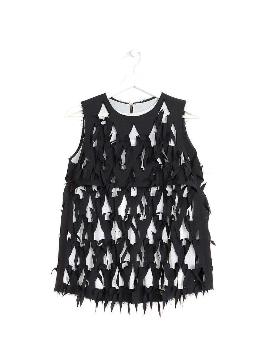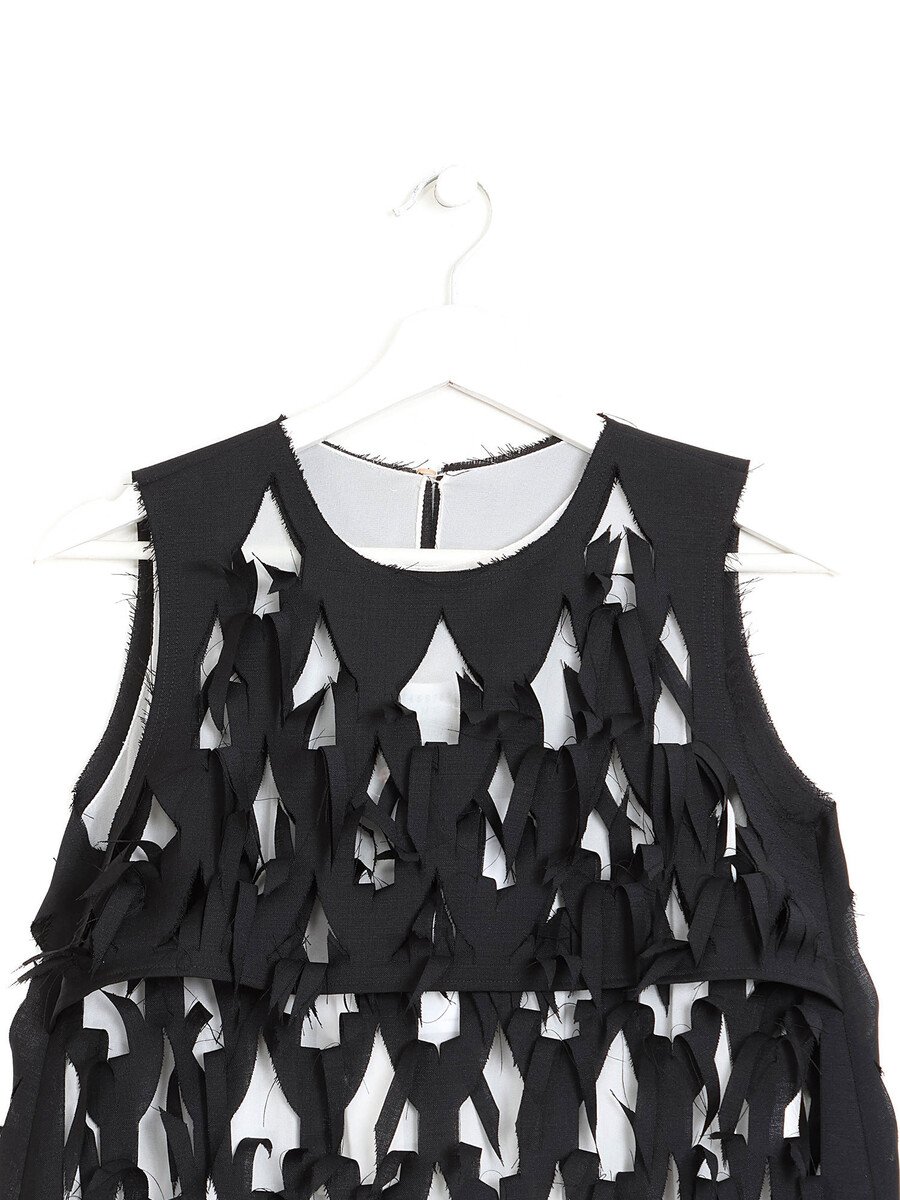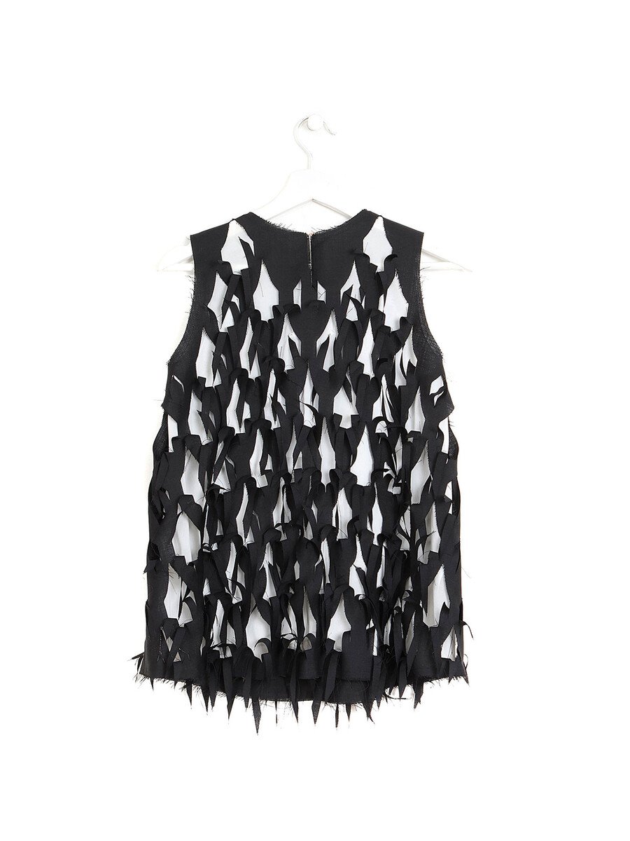 Haut sans manches bi-matière à découpes et doublure contrastée en noir et blanc. Texture tissée ouverte avec détails de rubans noirs.