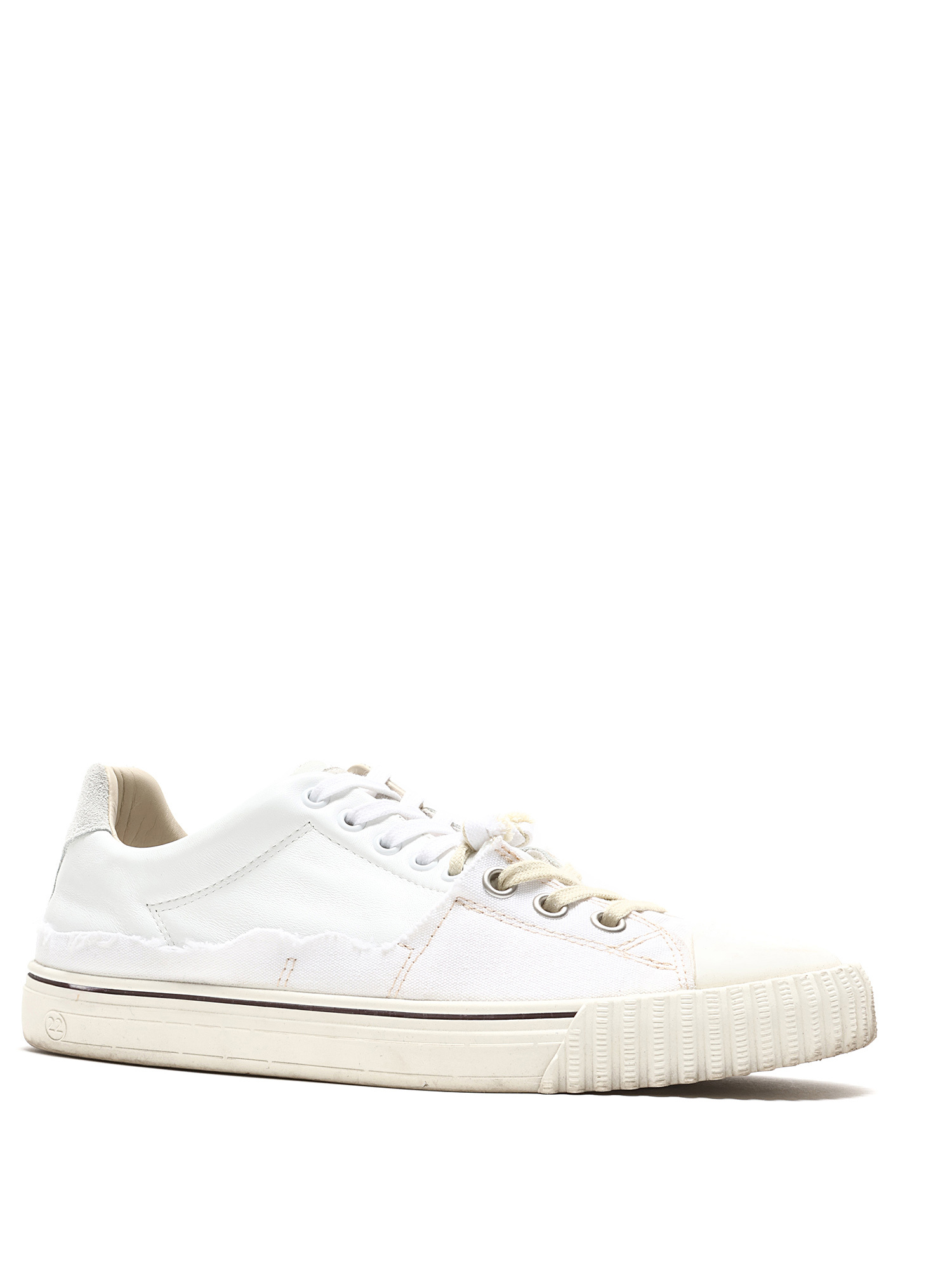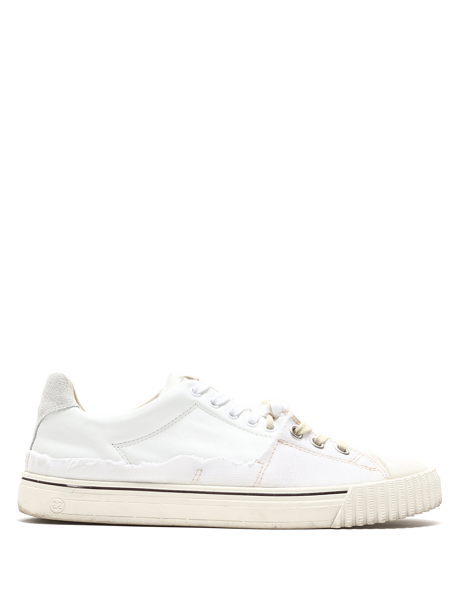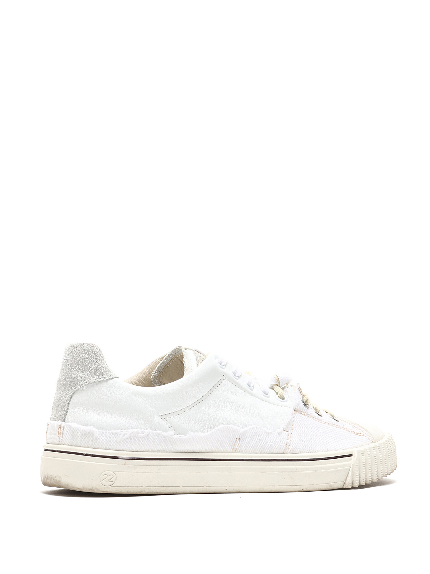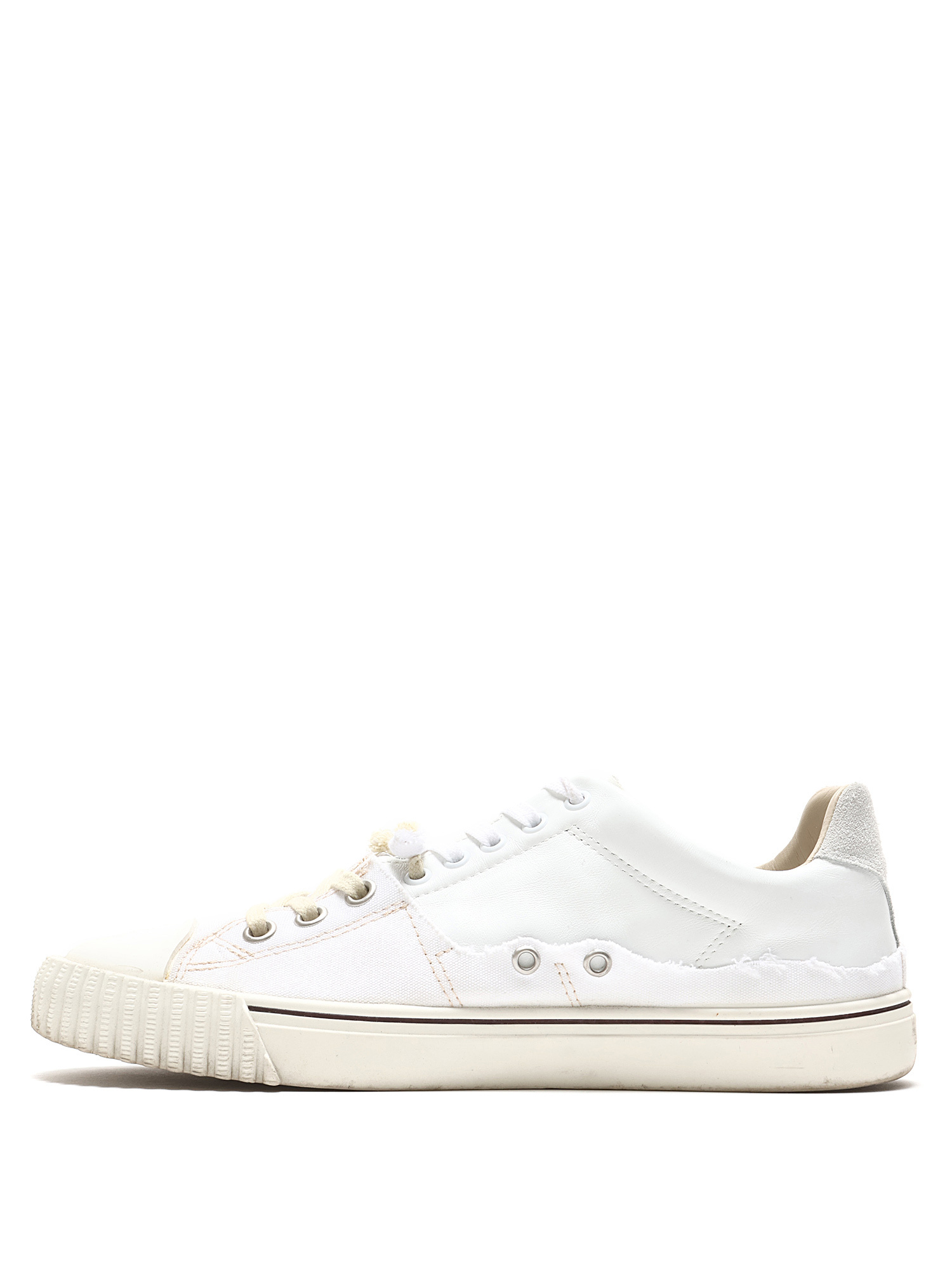Baskets basses en cuir blanc avec fermeture à lacets. Style à bout rond et semelle en caoutchouc. Avec boîte.