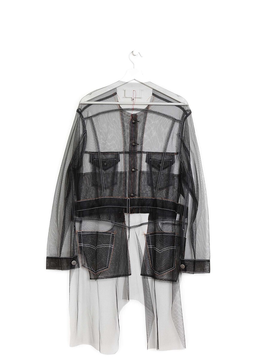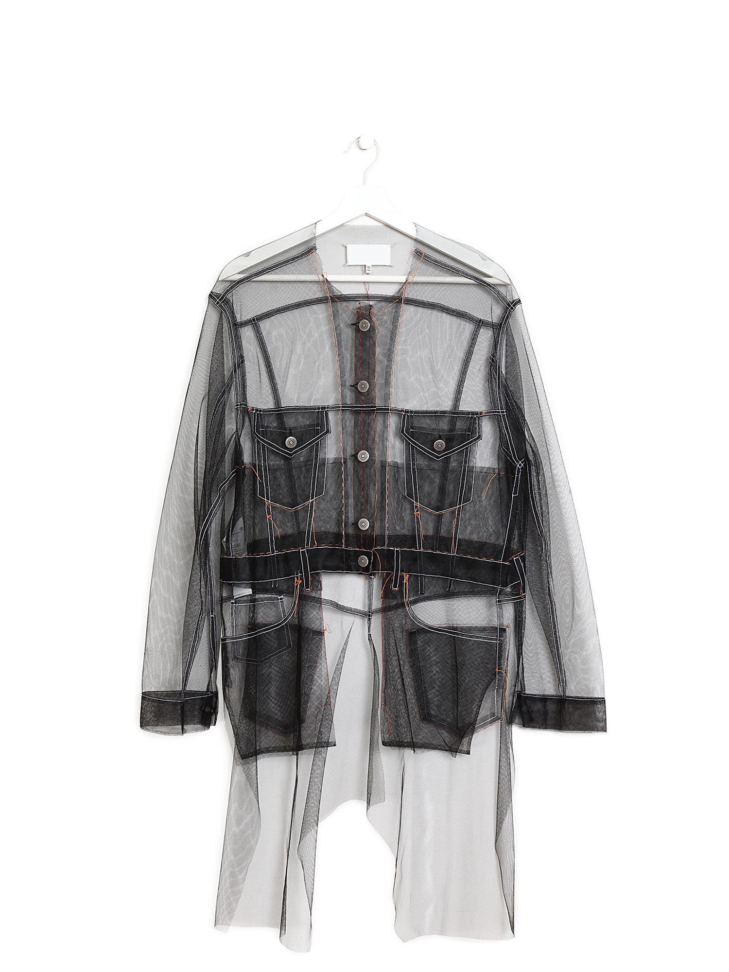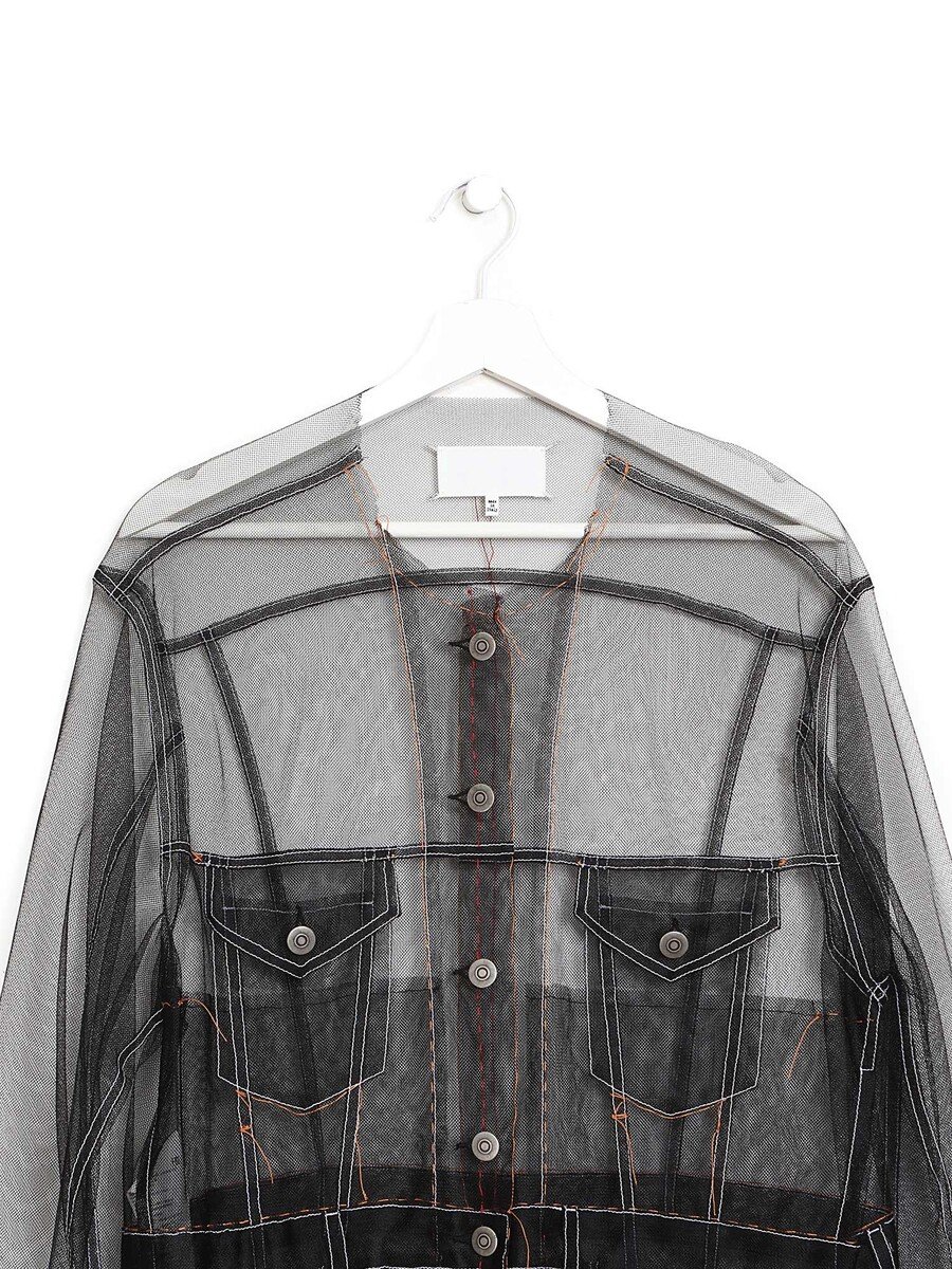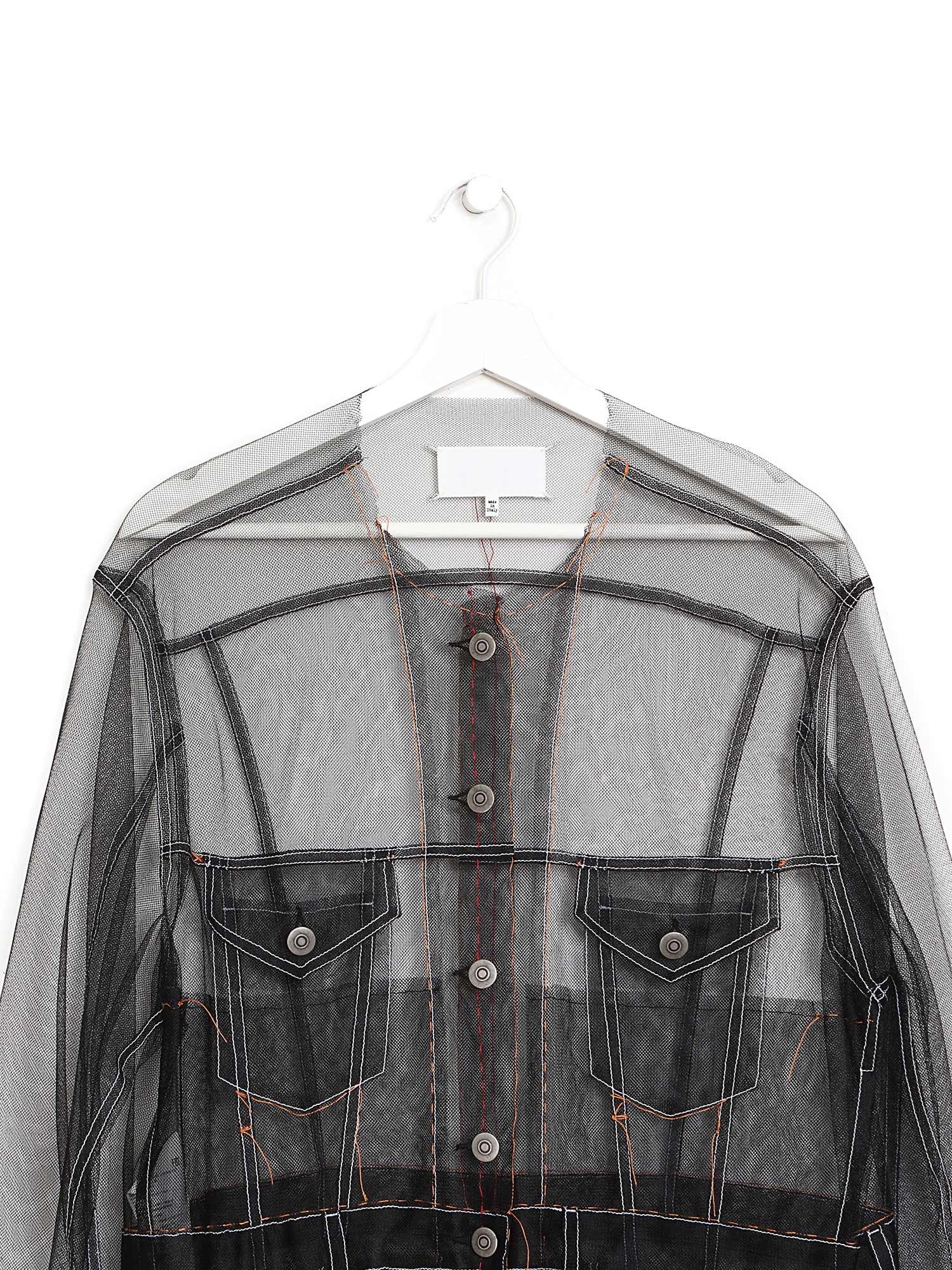 Veste en maille transparente noire avec des surpiqûres blanches. Fermeture à boutons en métal argenté. Quatre poches à l'avant. Col rond. Légère et respirante.