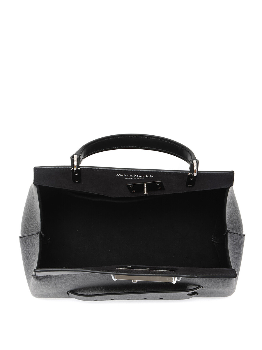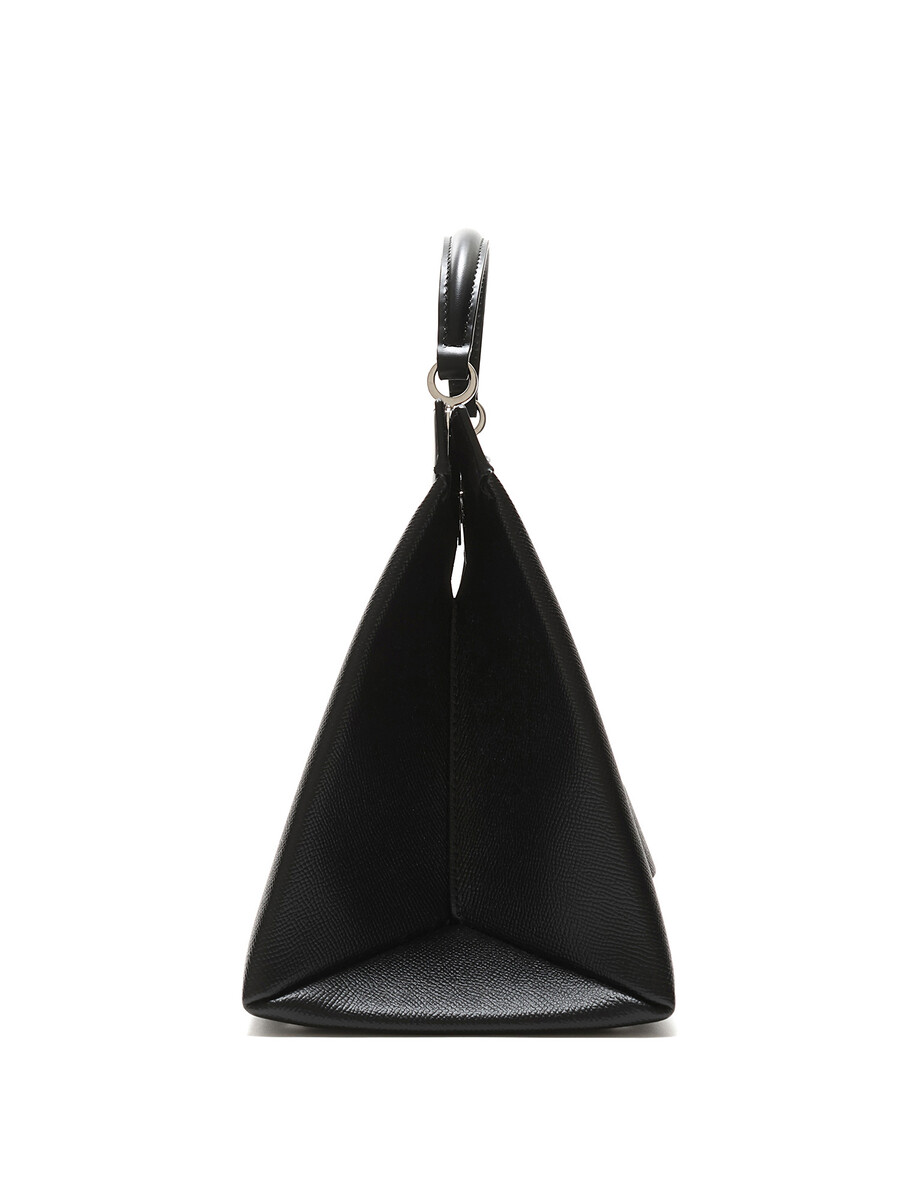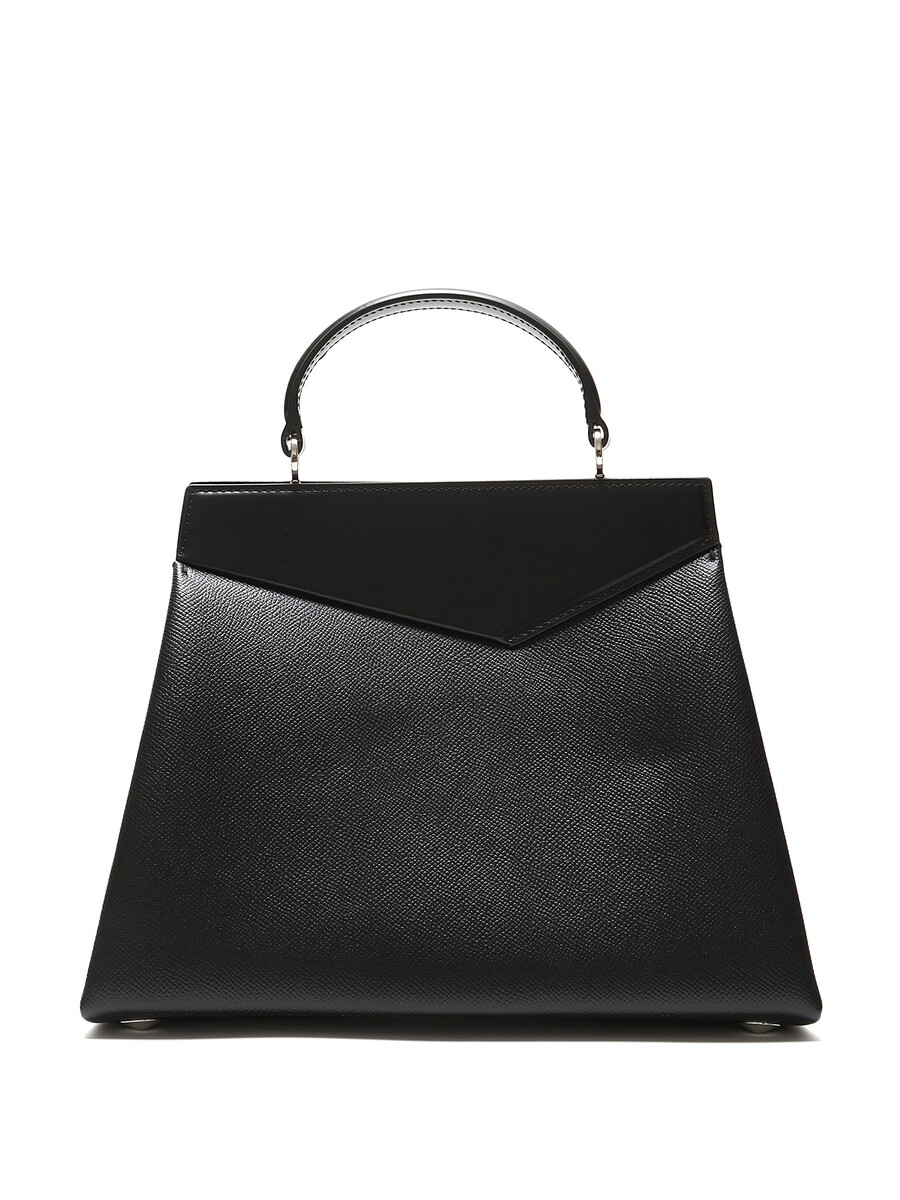 Sac à main structuré en cuir de veau noir. Fermeture à rabat avec ferrures en métal argenté. Comprend une bandoulière détachable.