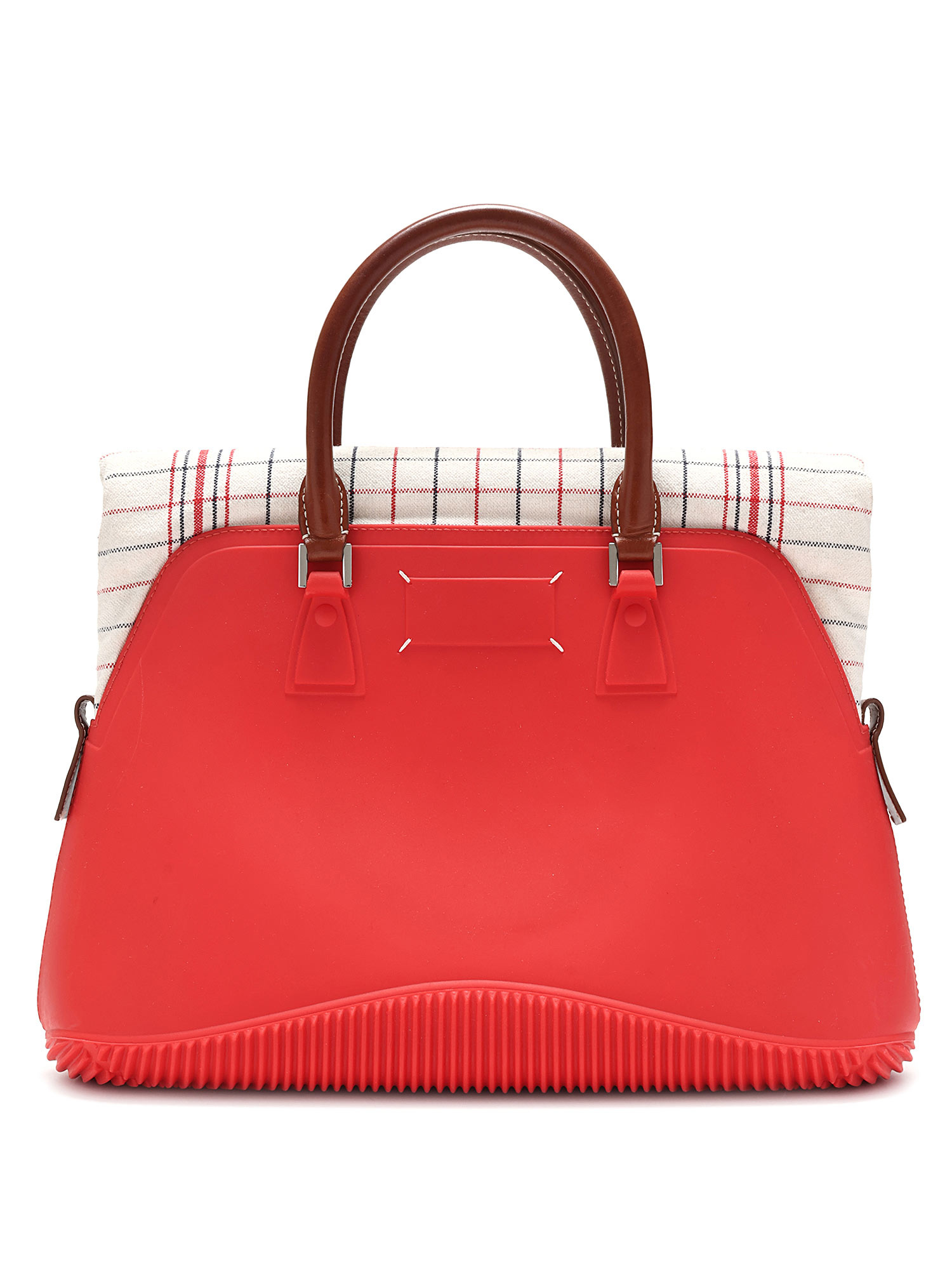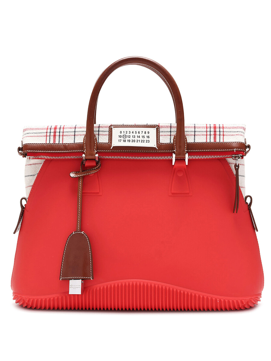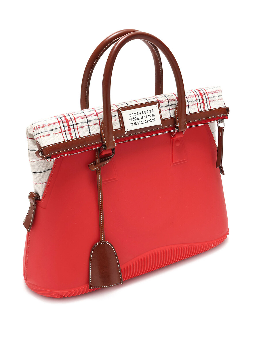 Sac à main en caoutchouc rouge et tissu à carreaux blanc, bleu et rouge. Garnitures en cuir brun à surpiqûres blanches. Deux poignées en cuir roulé sur le dessus. Ferrures en métal argenté. Écusson à logo au devant et détail quatre coutures au dos. Fermeture à glissière au-dessus du rabat. Comprend un cadenas et une sangle.