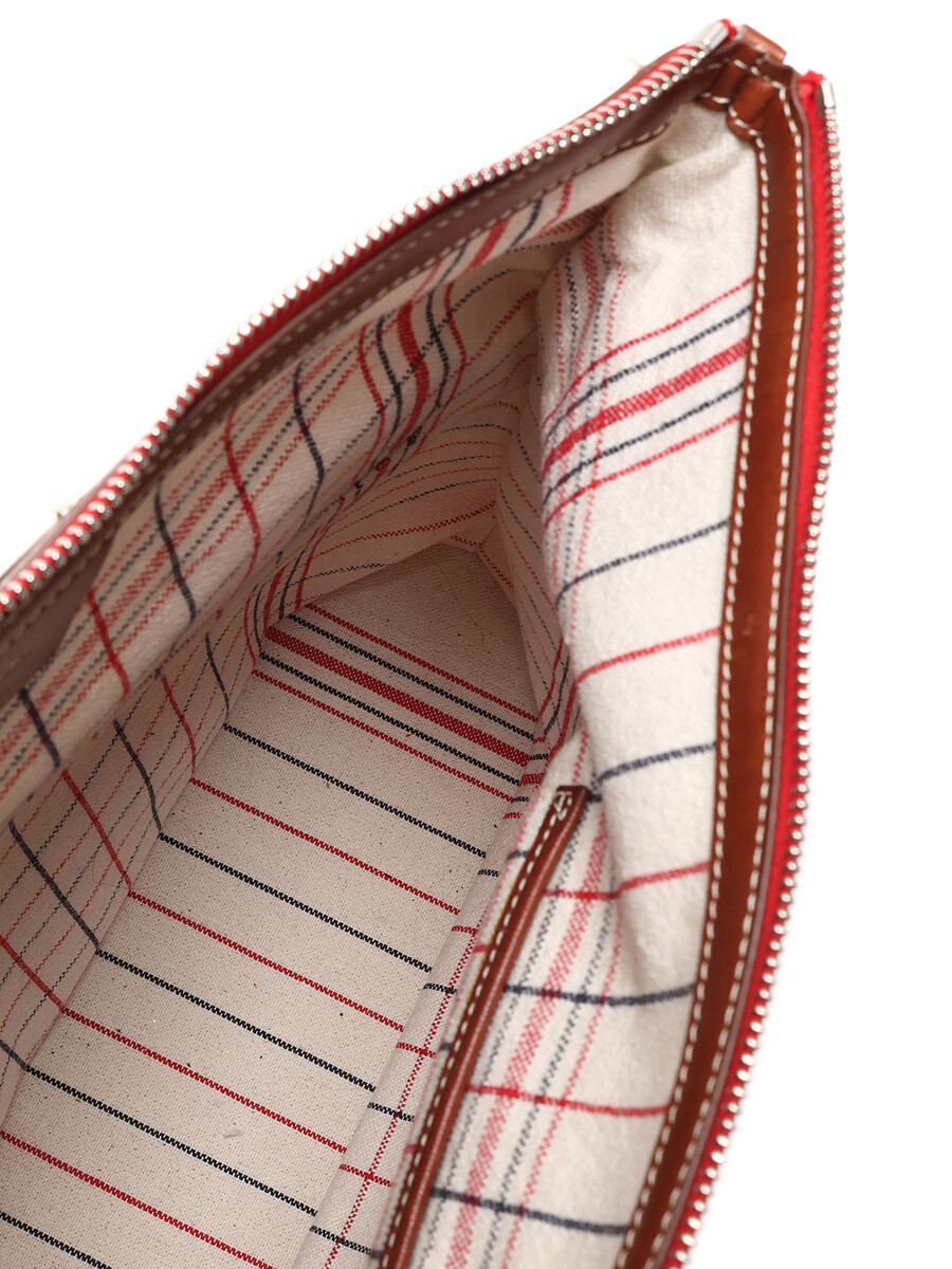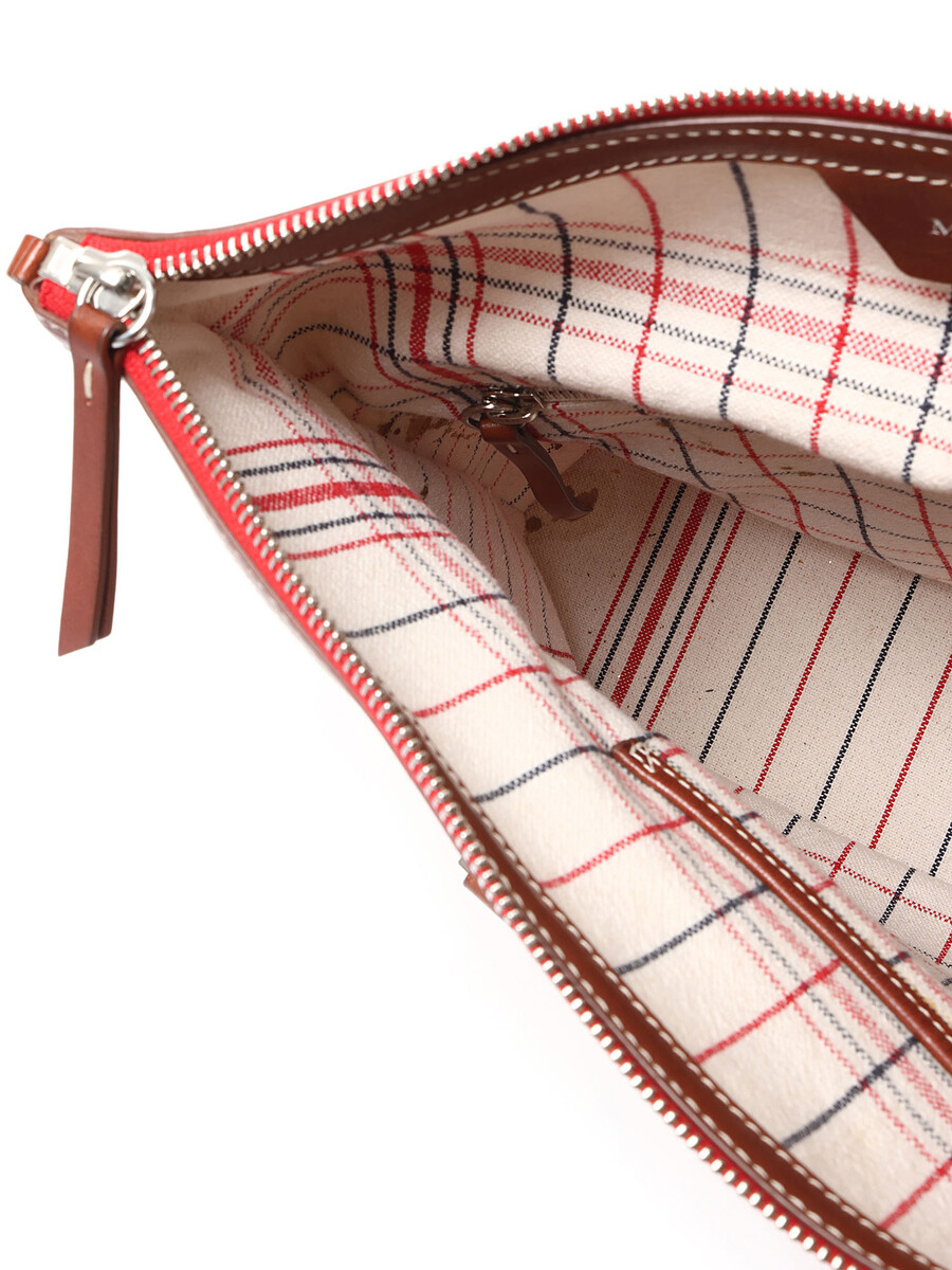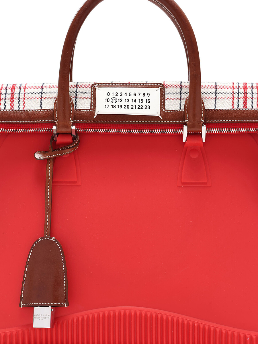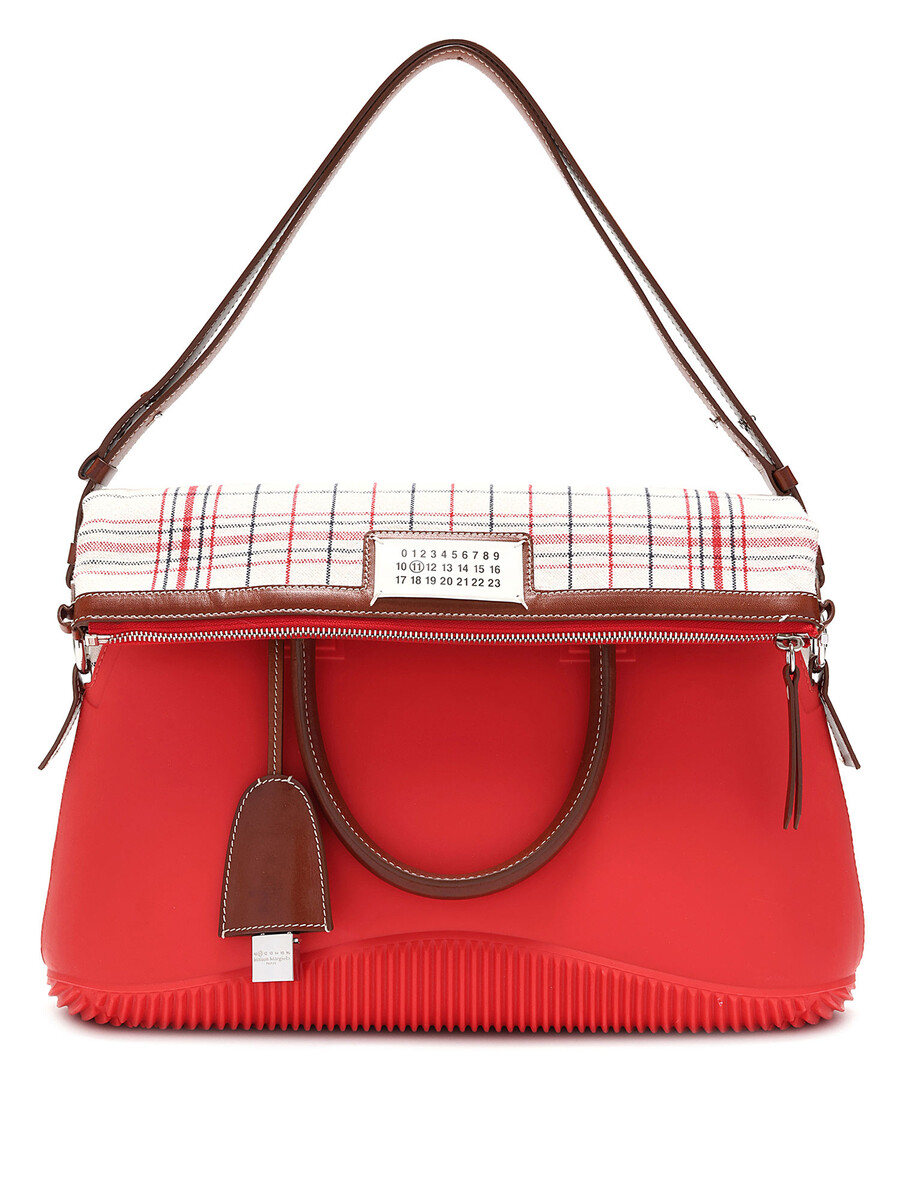 Sac à main en caoutchouc rouge et tissu à carreaux blanc, bleu et rouge. Garnitures en cuir brun à surpiqûres blanches. Deux poignées en cuir roulé sur le dessus. Ferrures en métal argenté. Écusson à logo au devant et détail quatre coutures au dos. Fermeture à glissière au-dessus du rabat. Comprend un cadenas et une sangle.