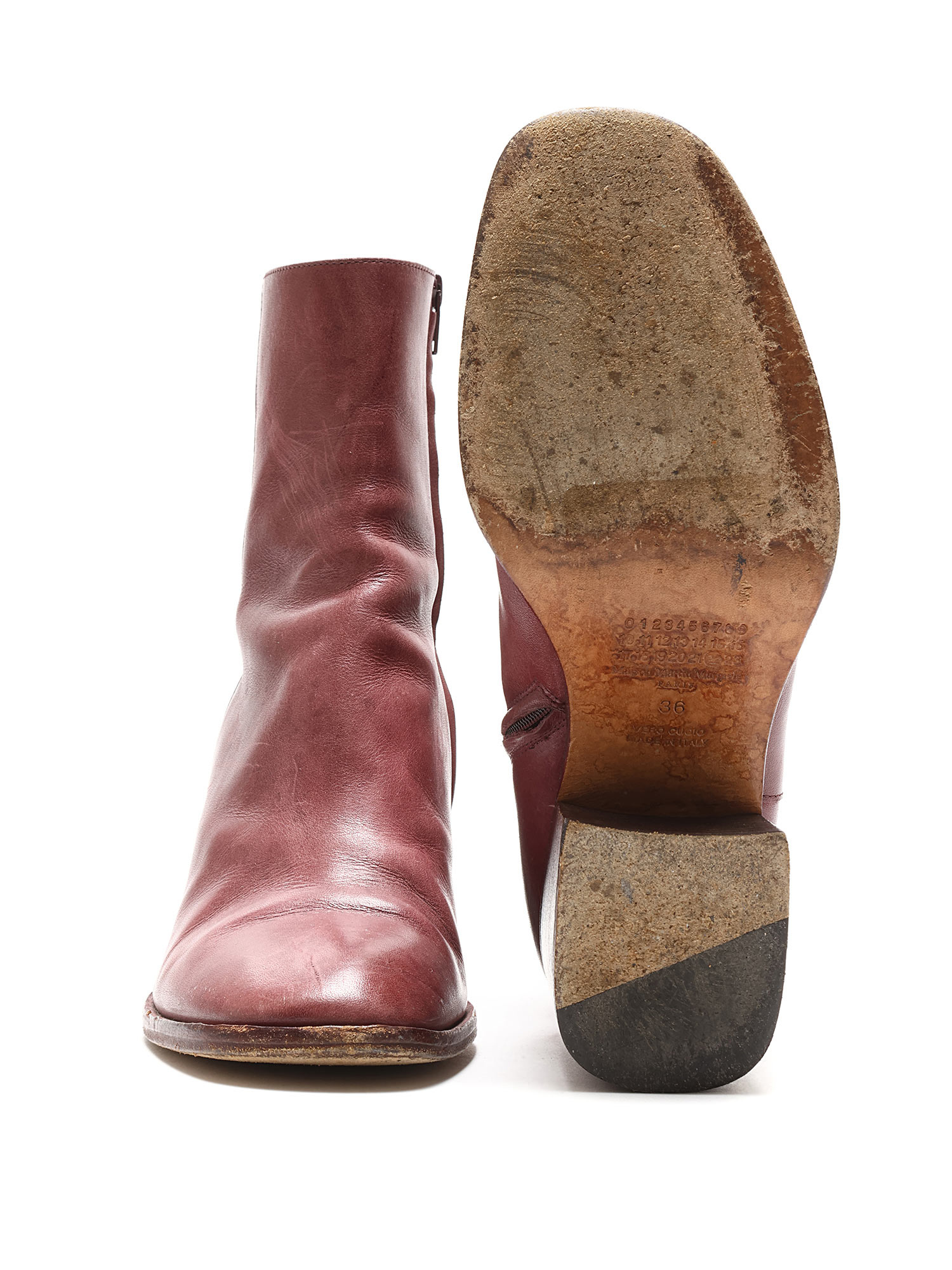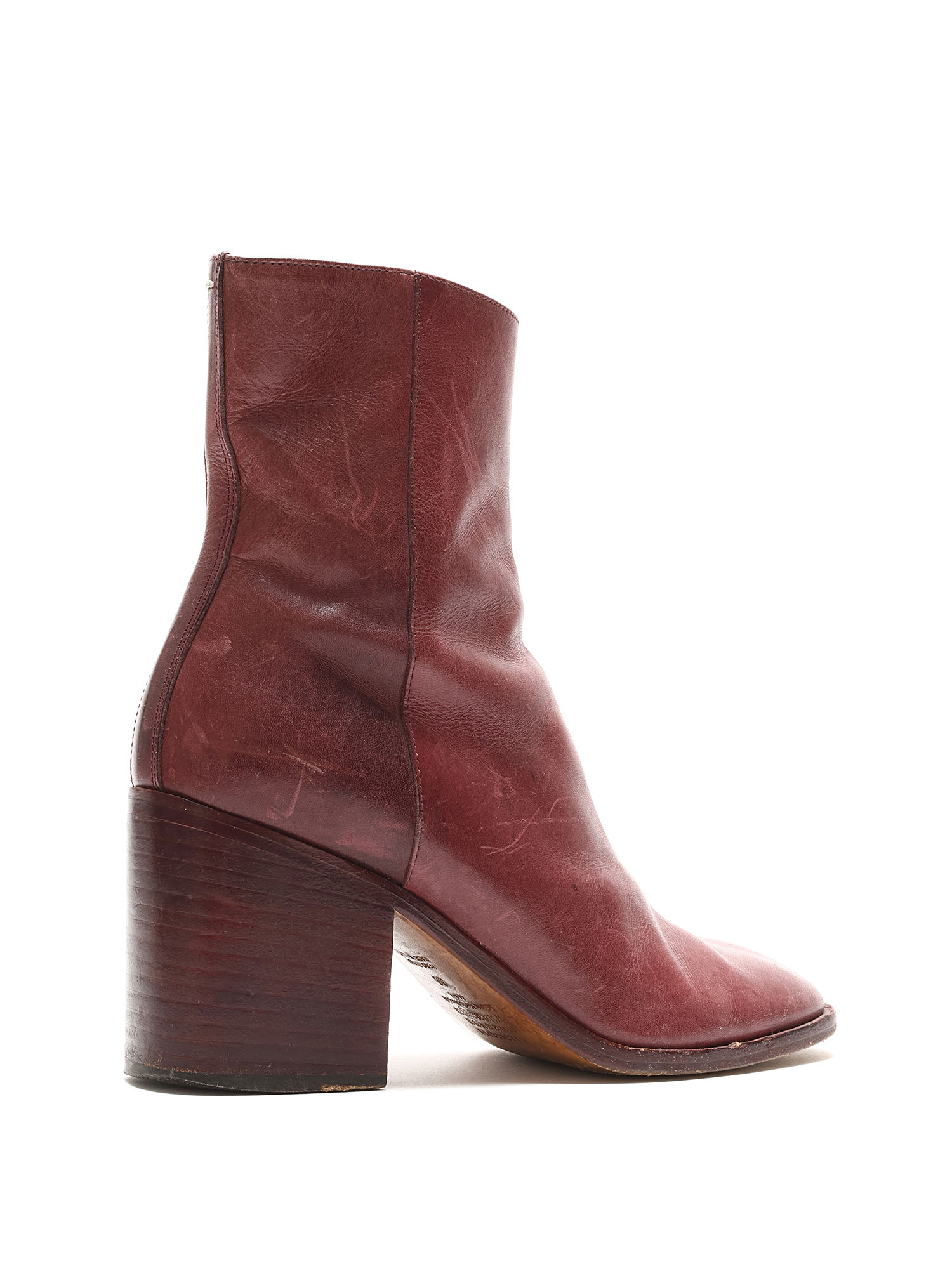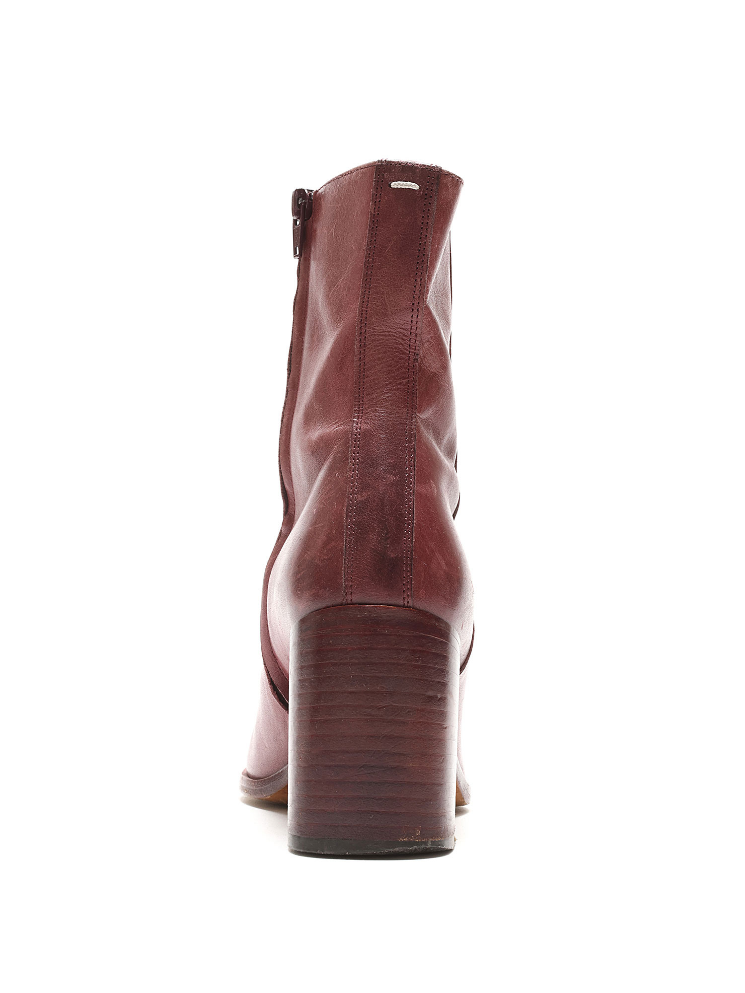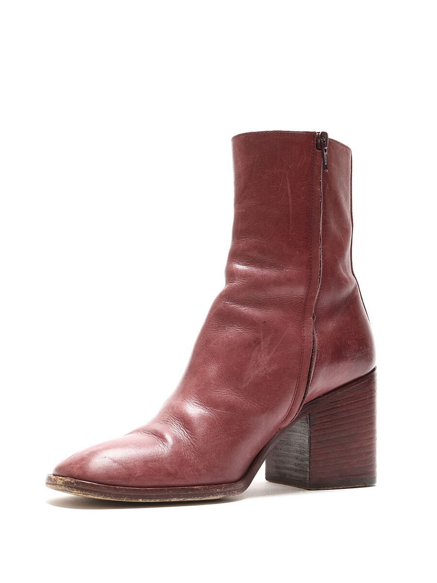 Bottes en cuir bordeaux à la cheville. Fermeture Éclair discrète sur le côté. Bout rond. Talon bloc en cuir.