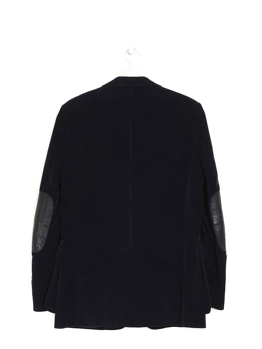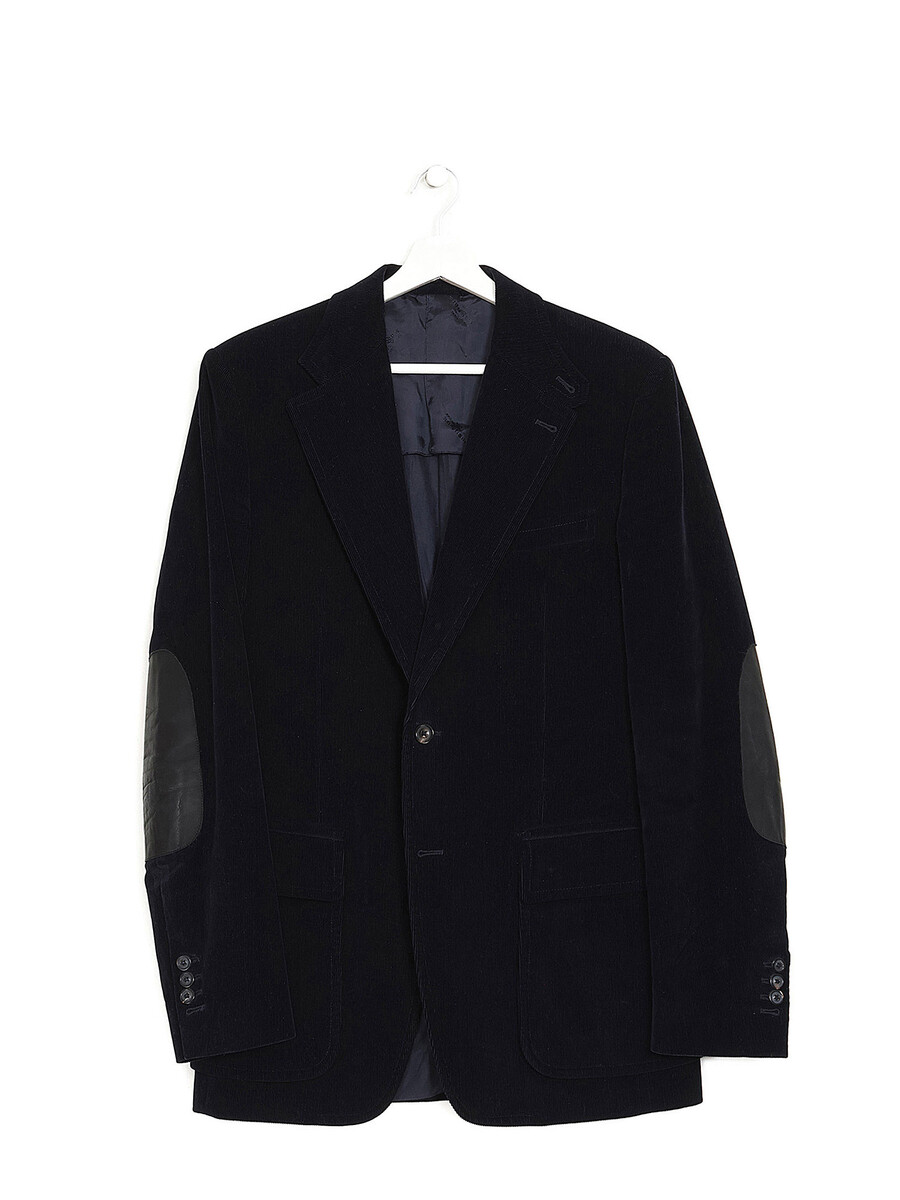 Veston en corduroy bleu marine. Col à revers encoché avec fermeture à boutons devant. Poches à rabat de chaque côté.