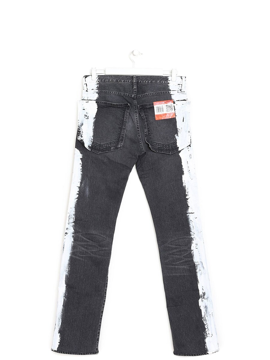 Jean slim noir avec ourlet effiloché et détails de peinture blanche. Design unique avec poche arrière simple. Fermeture boutonnée et zippée sur le devant. Poches classiques à l'avant et à l'arrière.