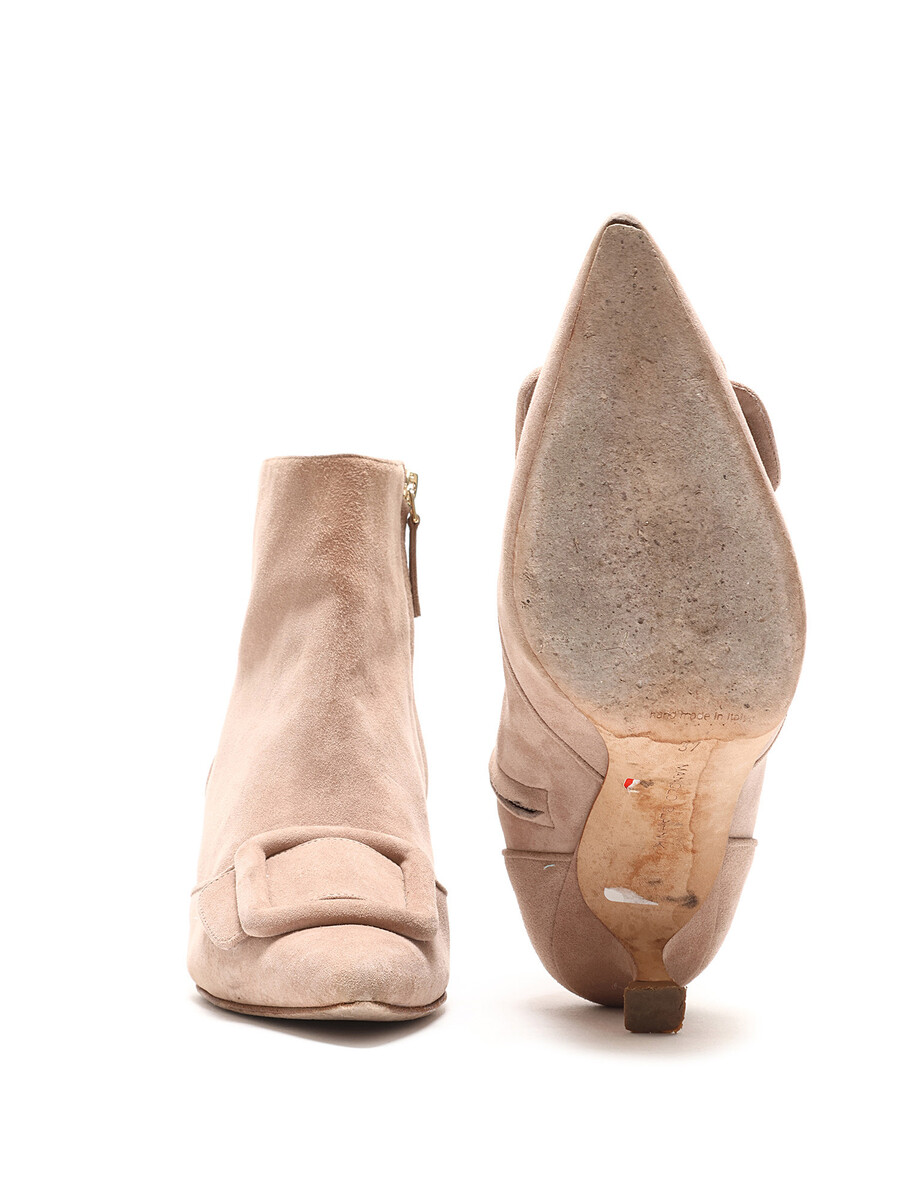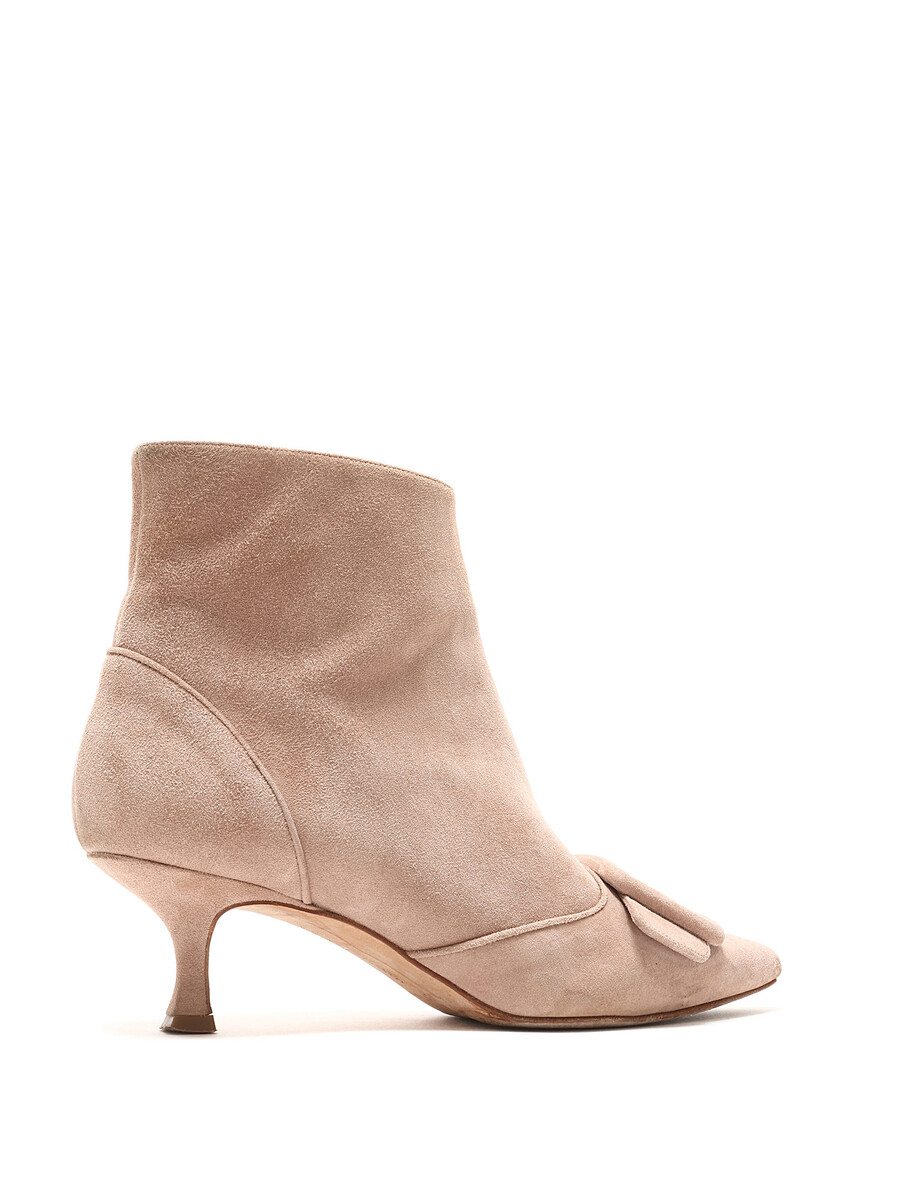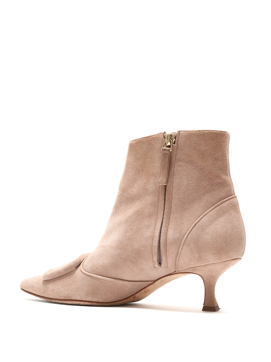 Bottes en suède à cheville avec une grande boucle décorative en taupe. Fermeture à glissière latérale. Bout pointu. Semelle en cuir.