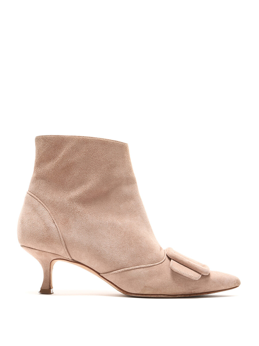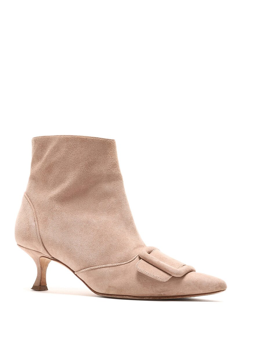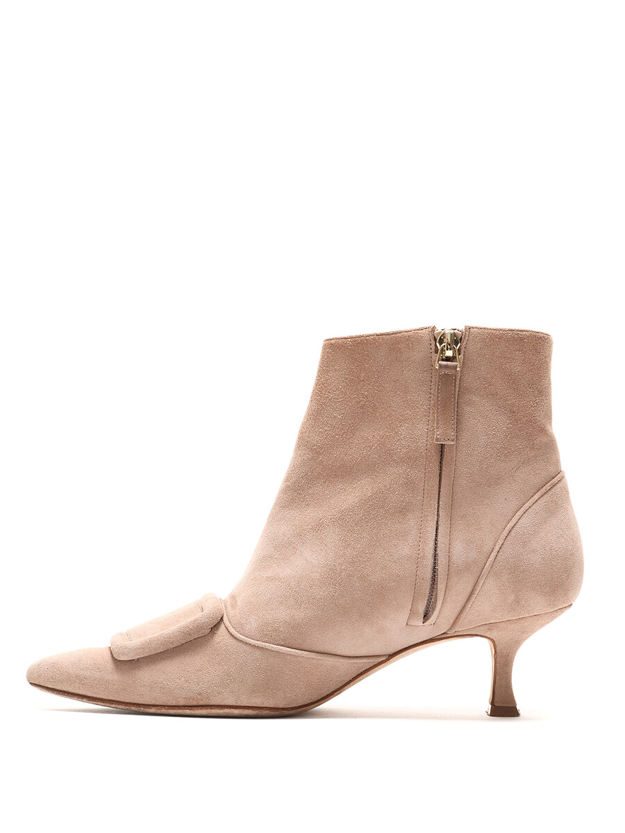 Bottes en suède à cheville avec une grande boucle décorative en taupe. Fermeture à glissière latérale. Bout pointu. Semelle en cuir.