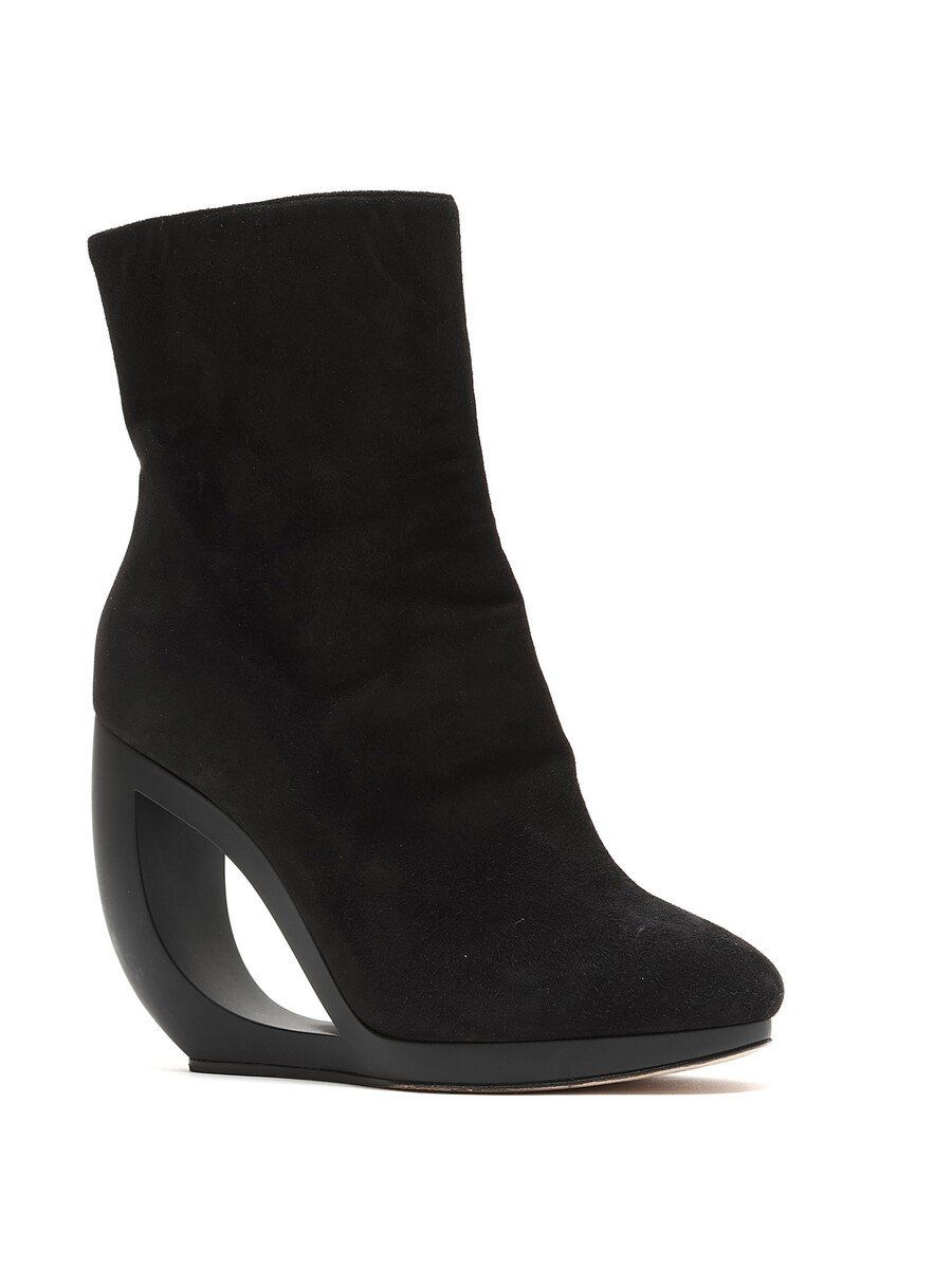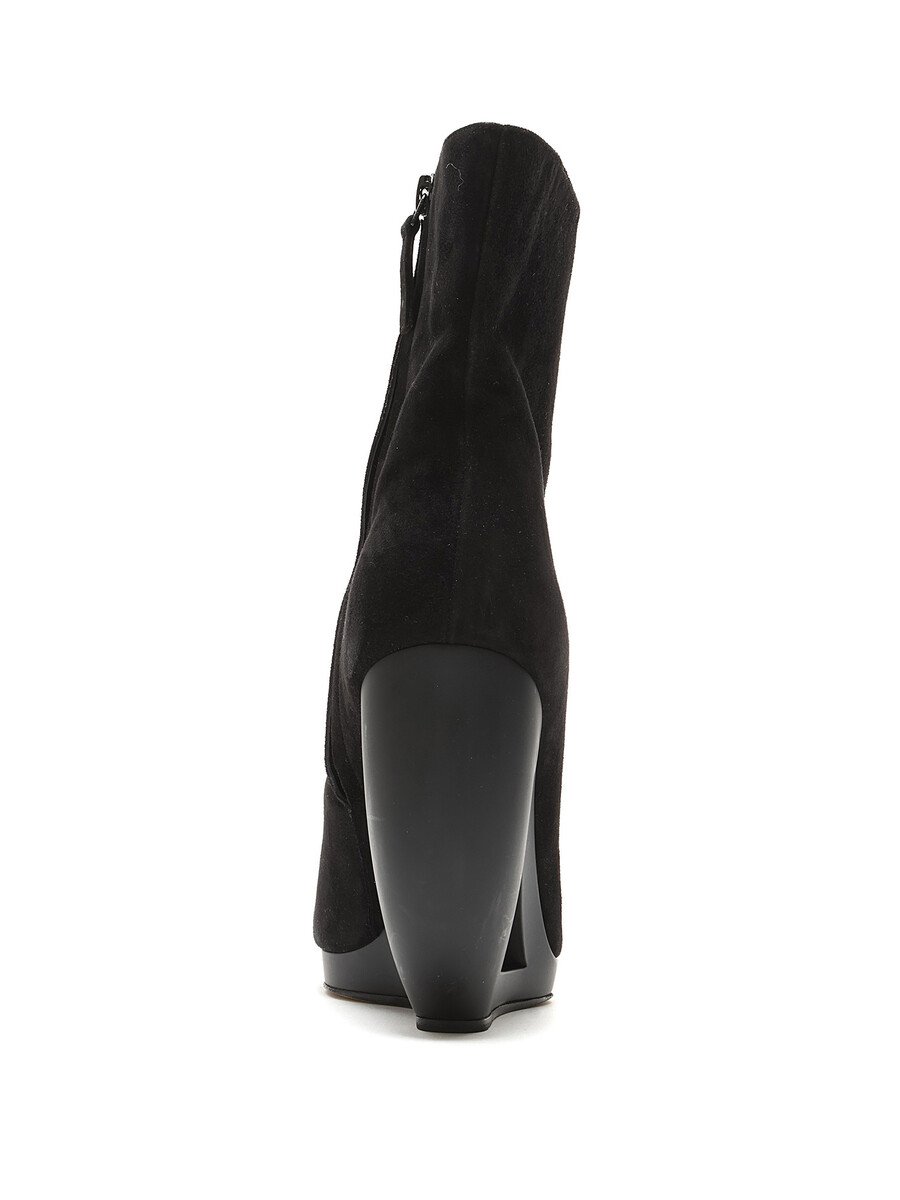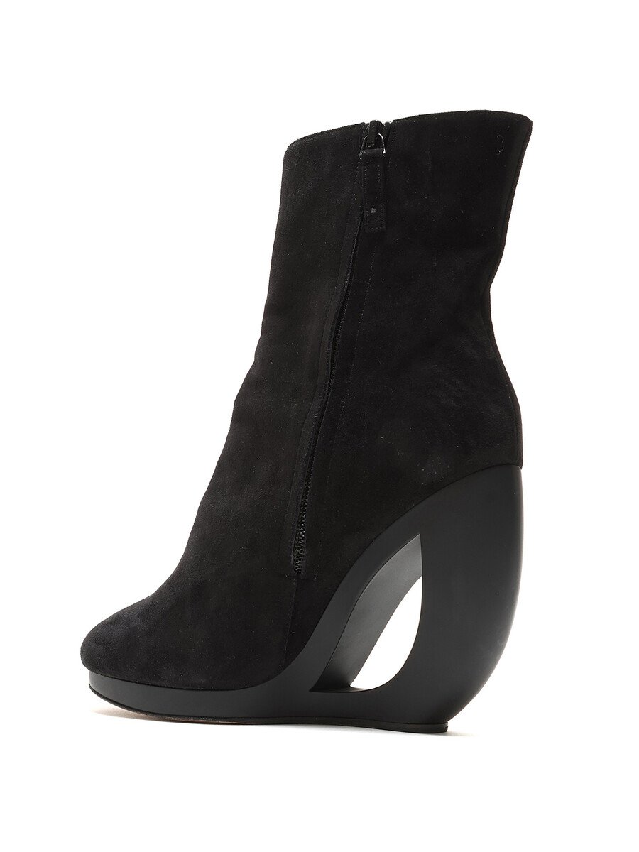 Bottes en suède noir à talon sculptural. Fermeture à glissière sur le côté. Bout rond fermé. Semelle en cuir. Avec boîte.