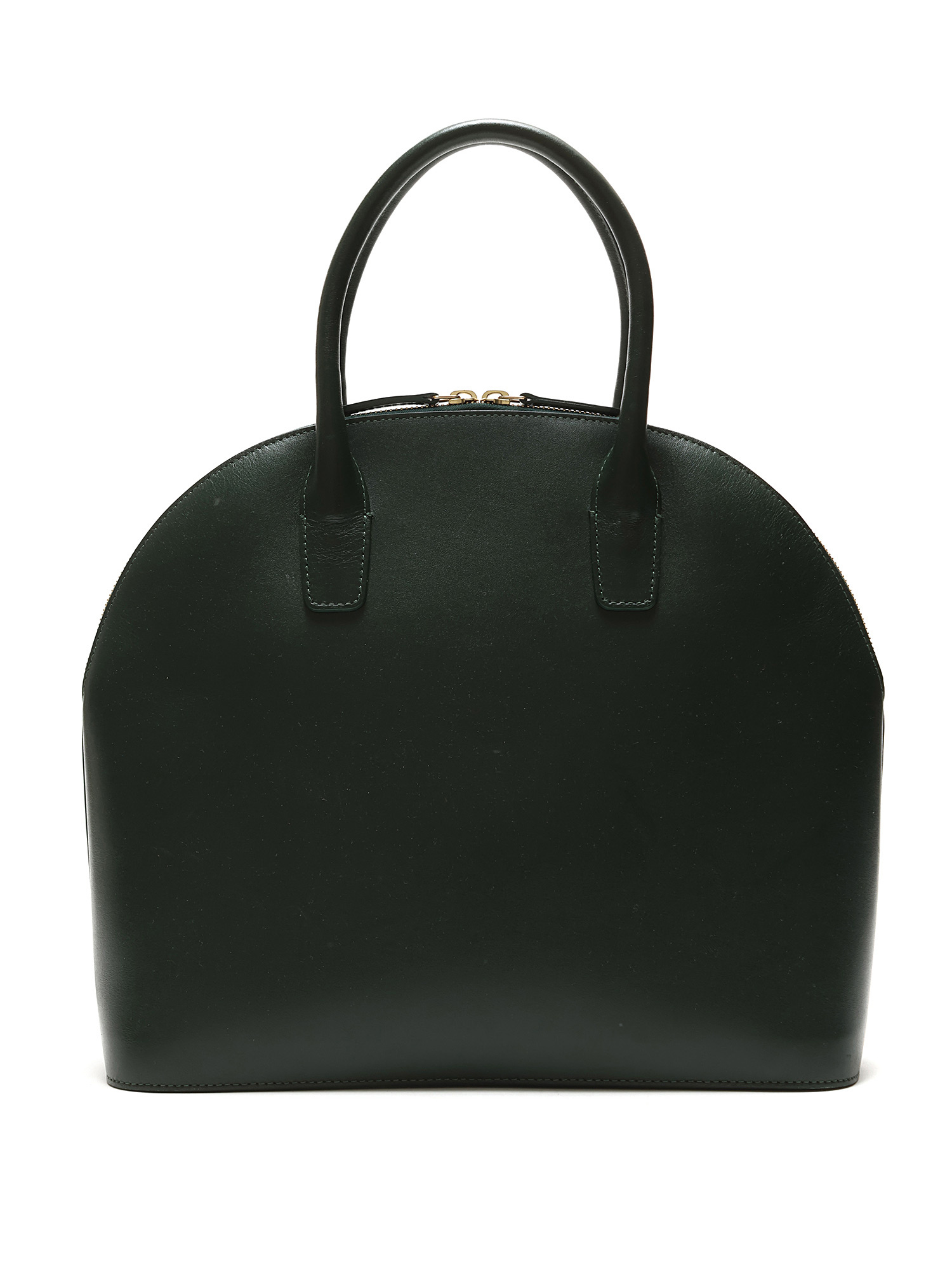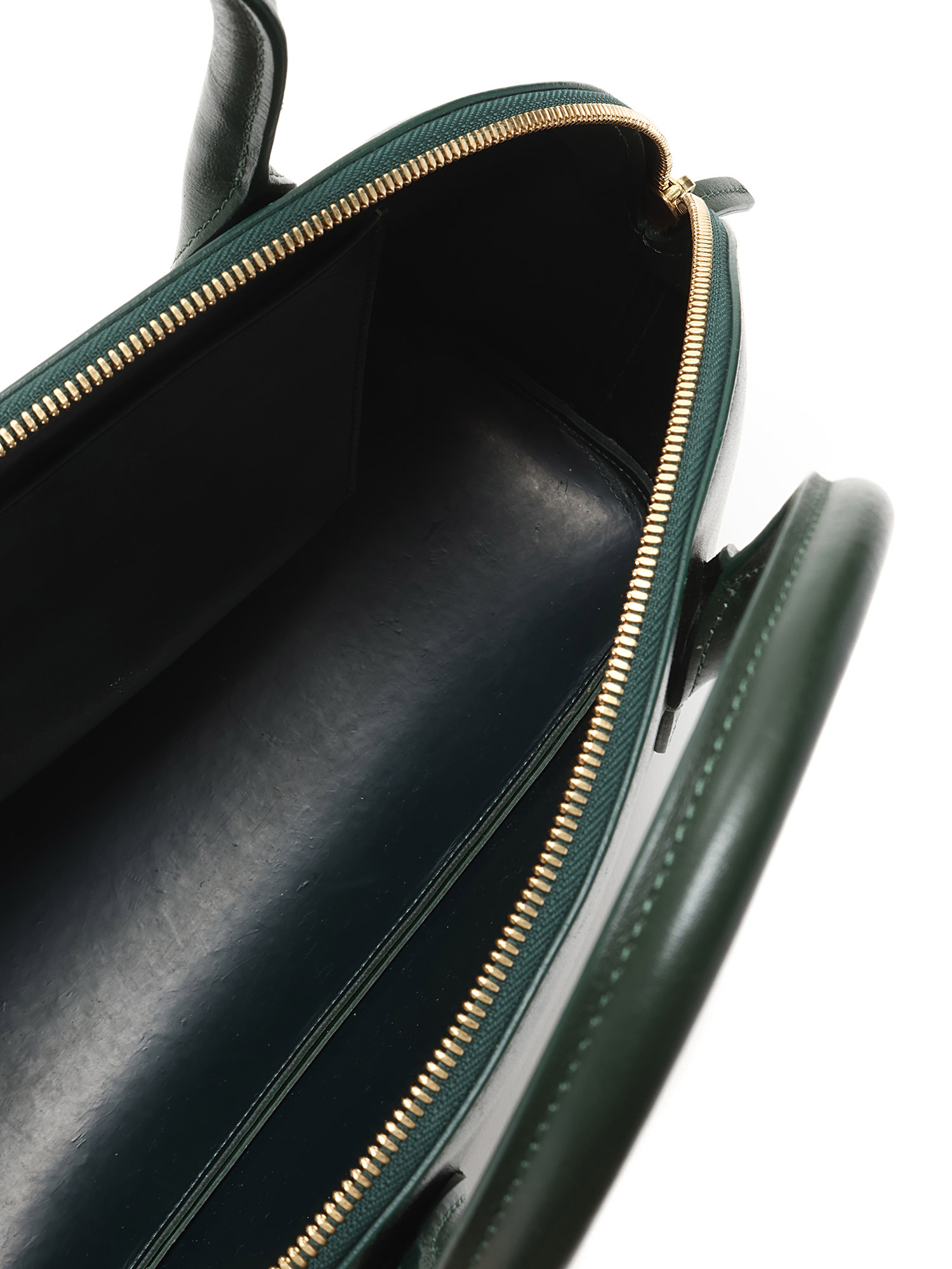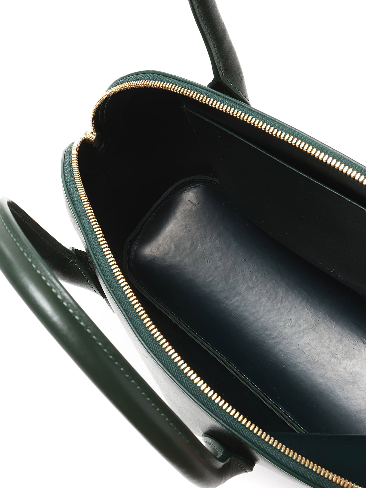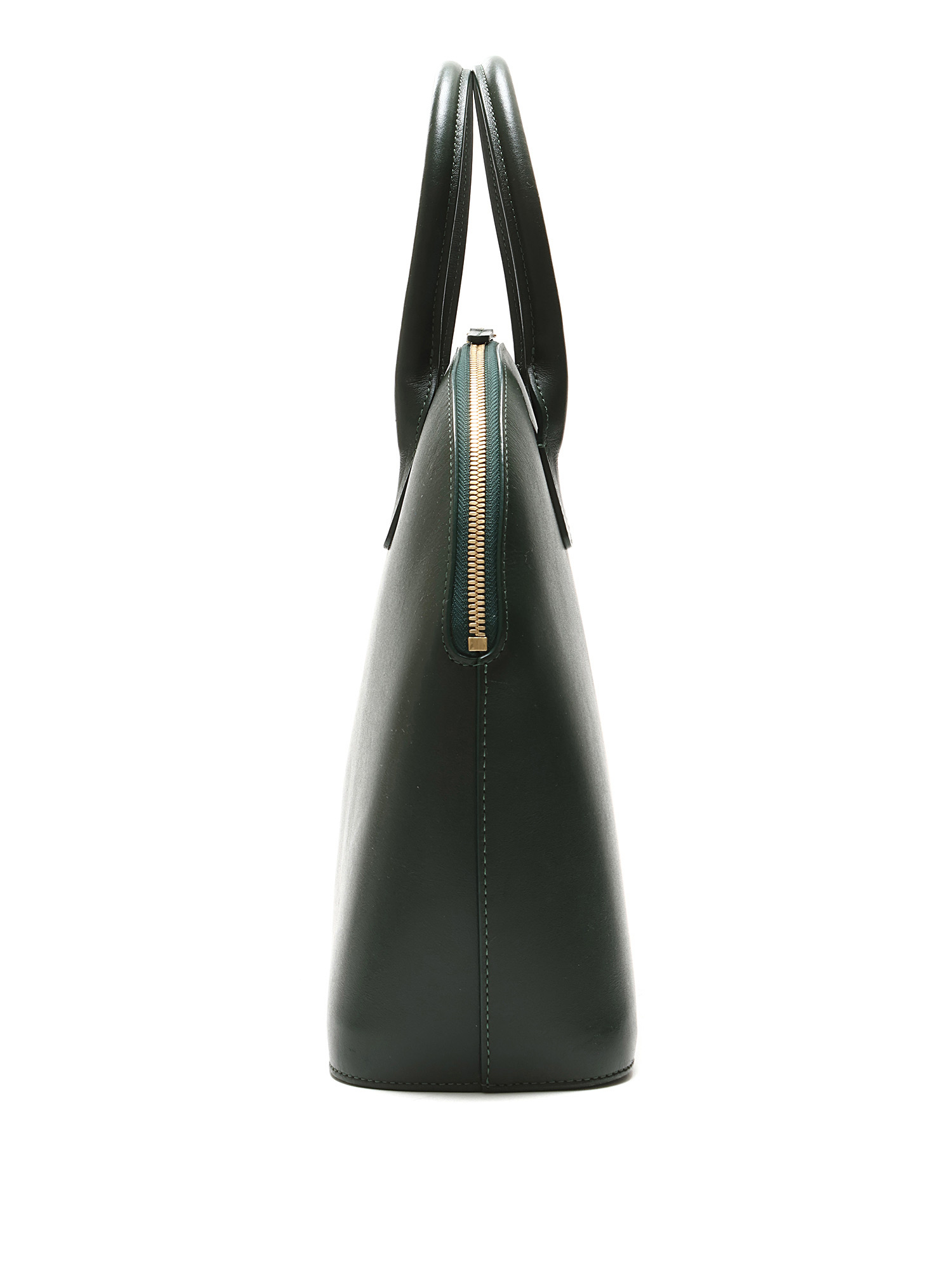 Sac en cuir à poignée supérieure de couleur vert foncé. Fermeture à glissière sur le dessus. Poignées en cuir roulé. Quincaillerie dorée. Avec dust bag.