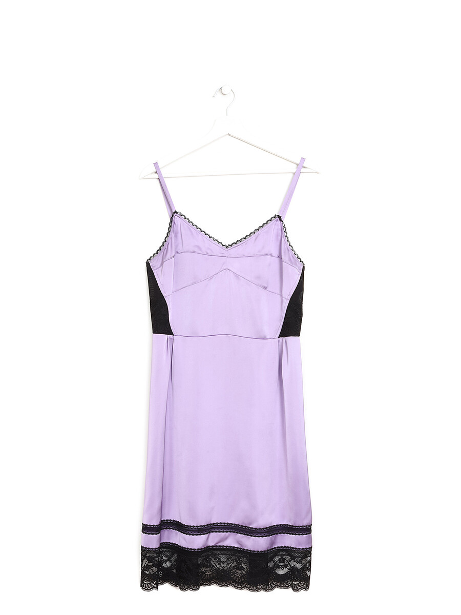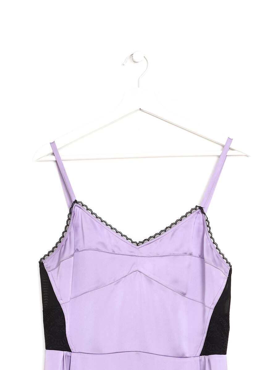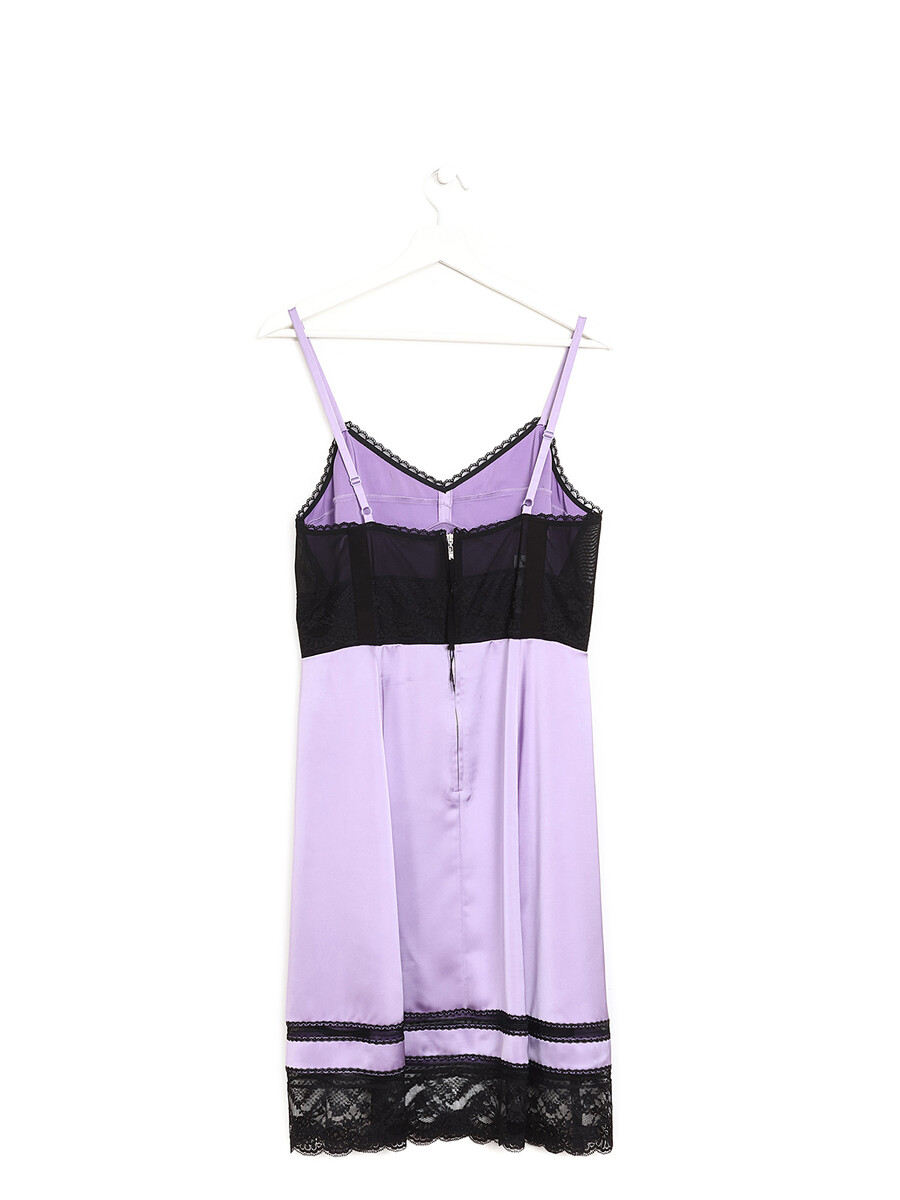 Robe en soie avec détails en dentelle, coloris lavande. Encolure en V. Fermeture à glissière latérale. Dentelle délicate aux épaules et à l'ourlet.