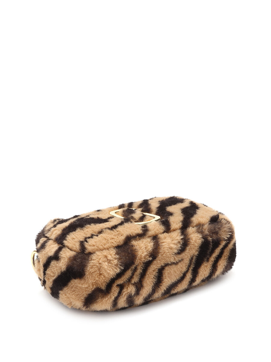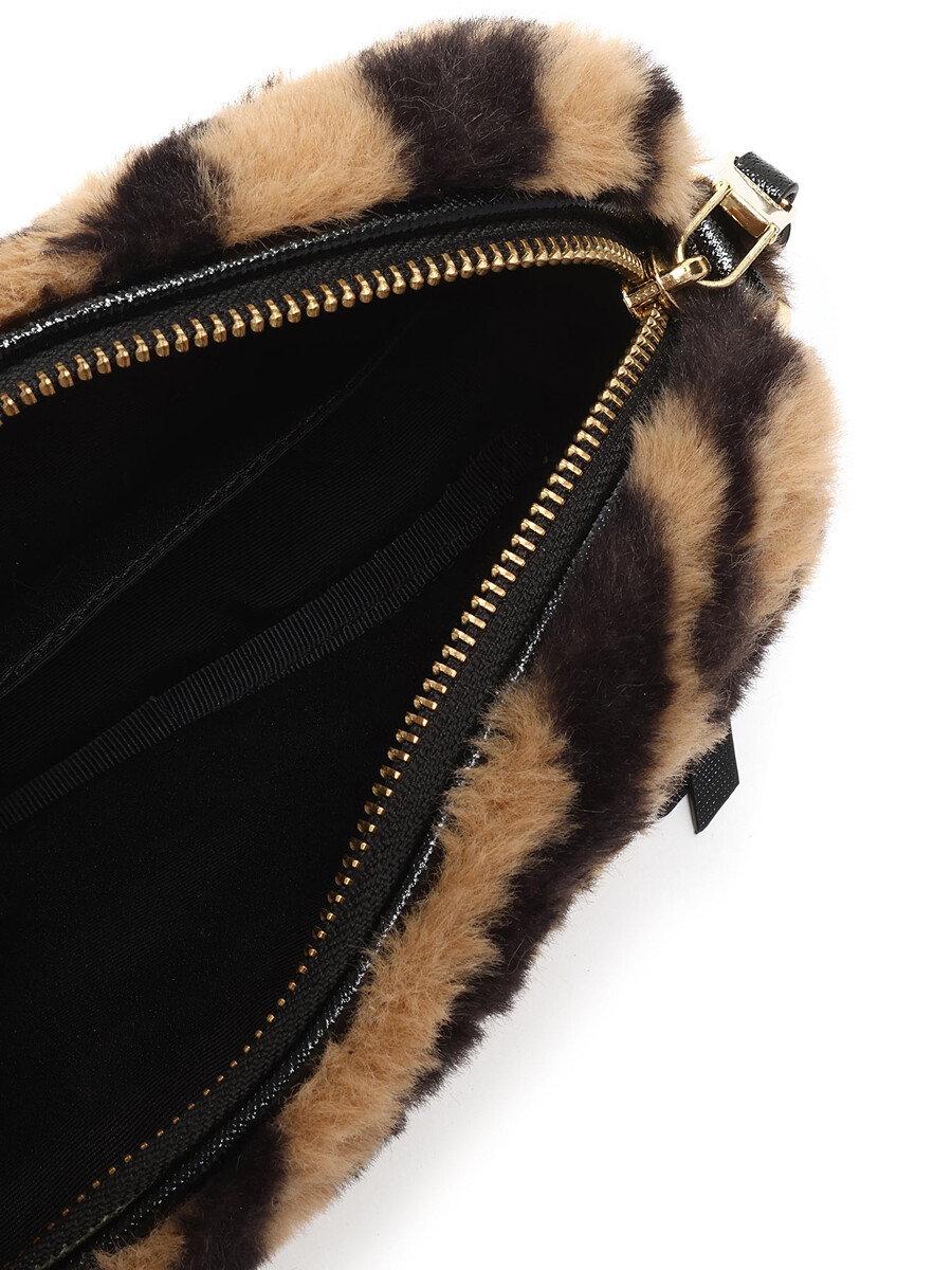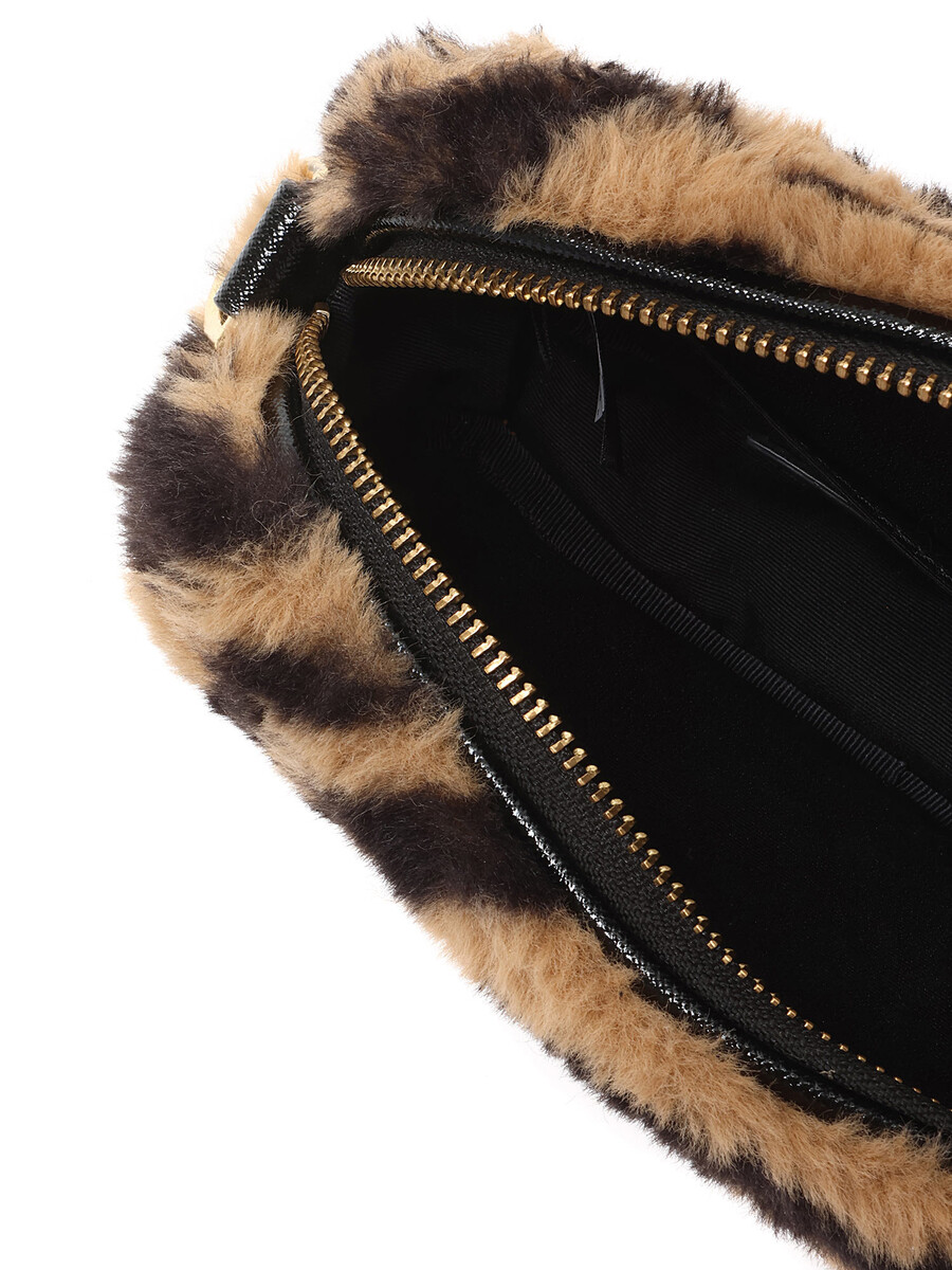 Sac bandoulière faux fur avec motif à imprimé animal en beige et noir. Fermeture à glissière. Bandoulière en cuir détachable avec ferrures dorées.