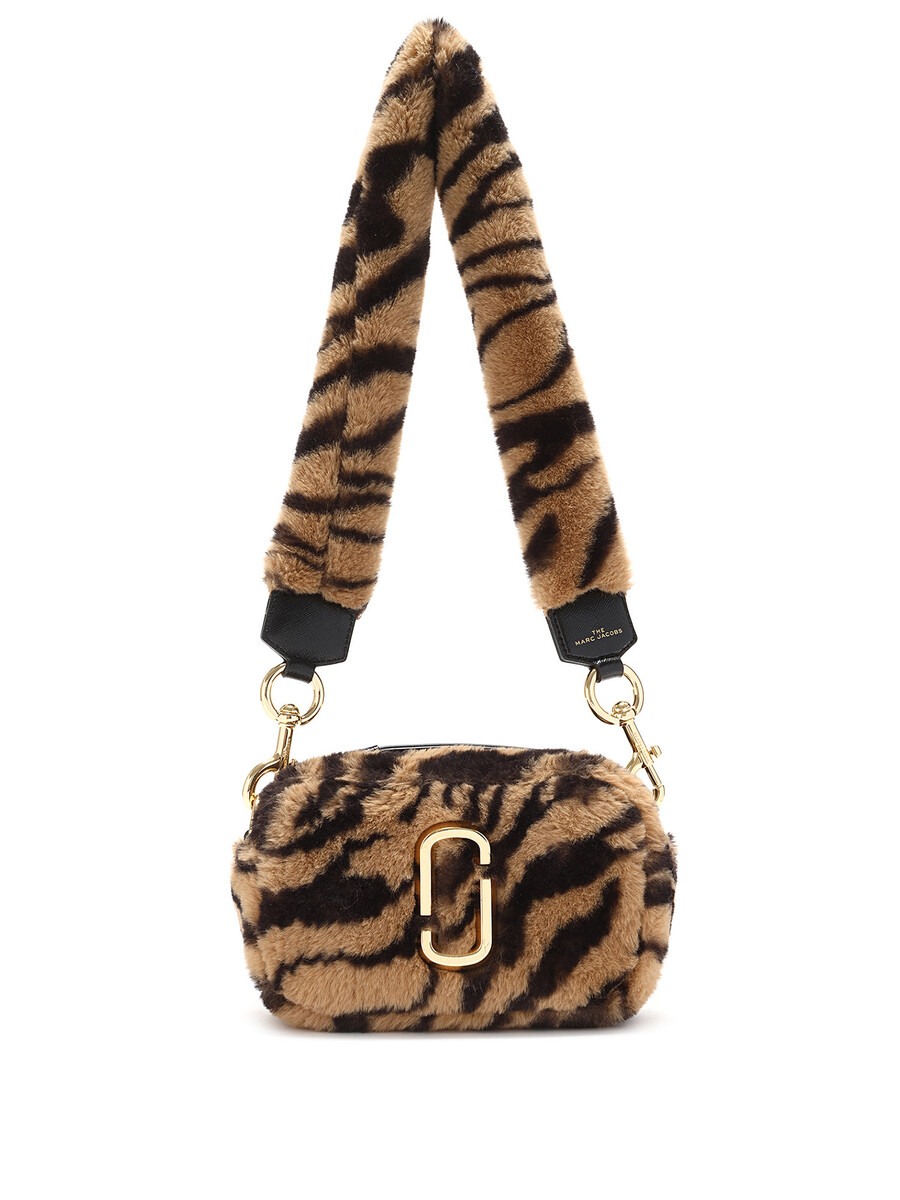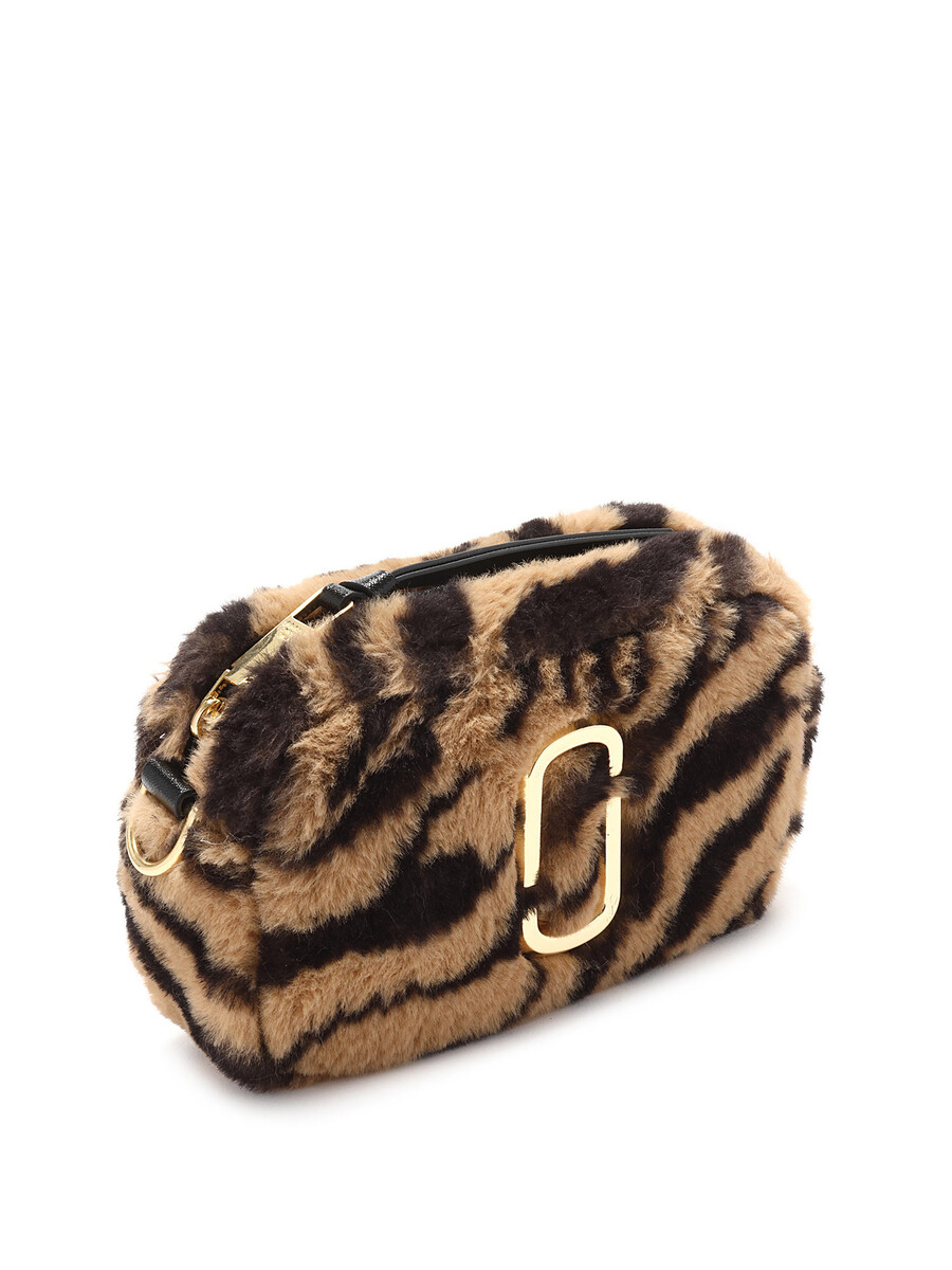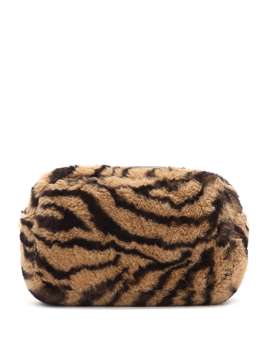 Sac bandoulière faux fur avec motif à imprimé animal en beige et noir. Fermeture à glissière. Bandoulière en cuir détachable avec ferrures dorées.