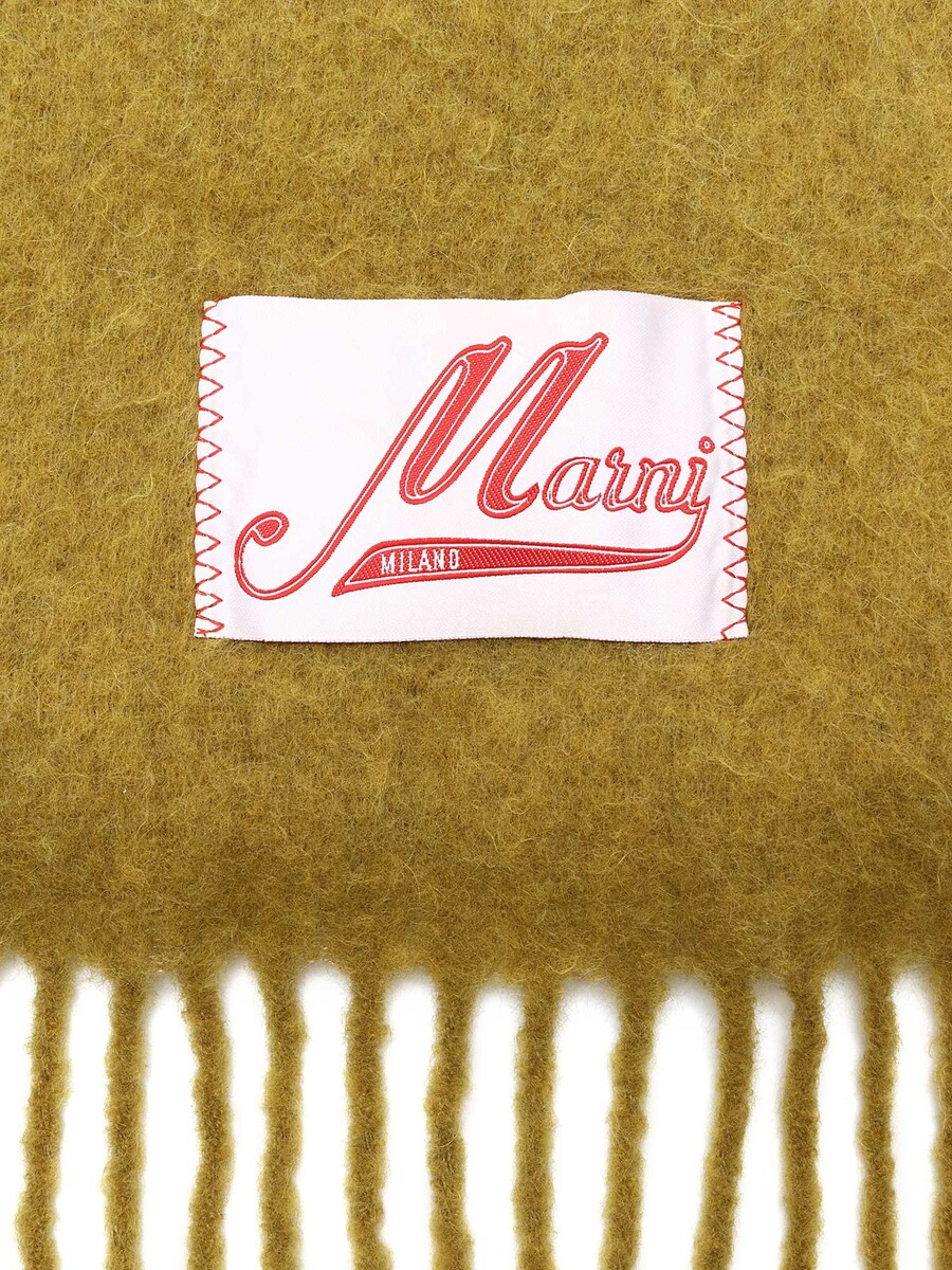 Écharpe luxueuse en mélange de laine de couleur moutarde avec des extrémités à franges.