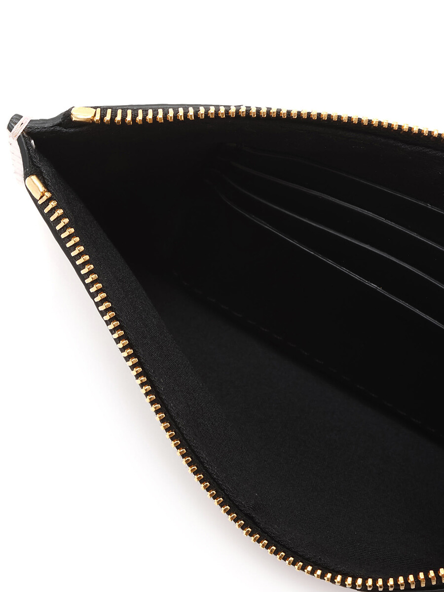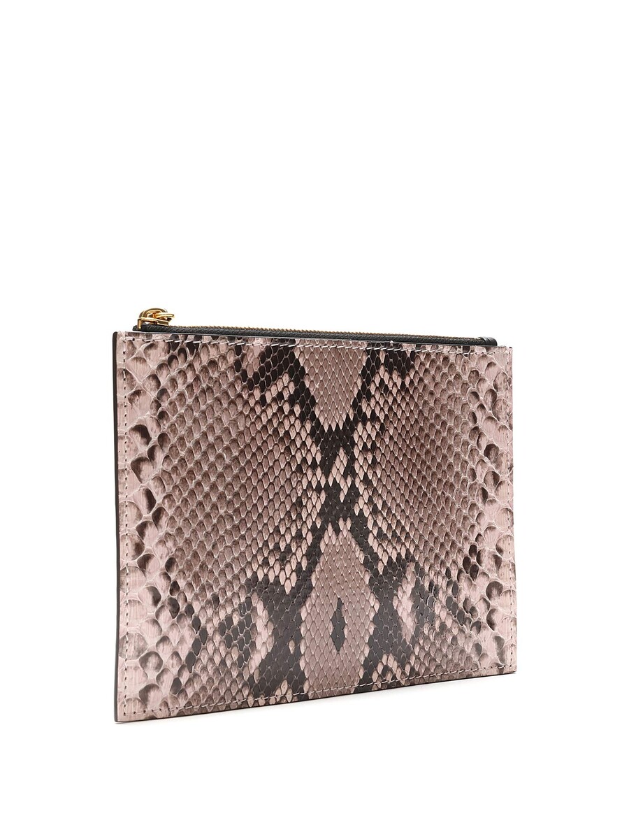 Portefeuille de poignet en peau de python dans les tons de rose et noir. Fermeture à glissière. Dragonne en cuir noir. Quincaillerie dorée.